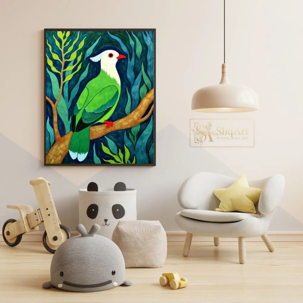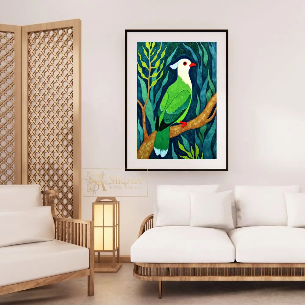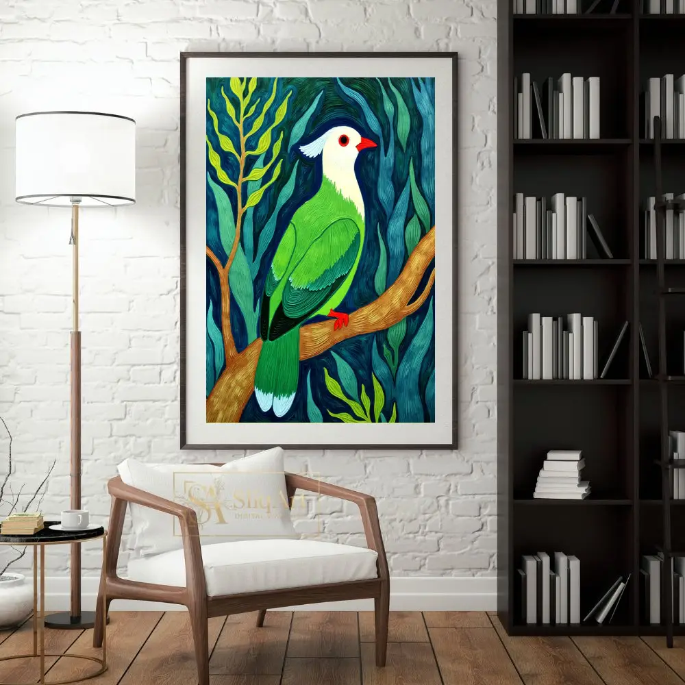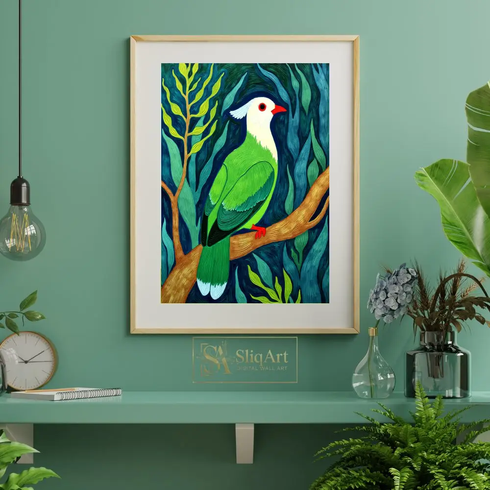 Transform your living space with this striking contemporary impasto painting of an exotic tropical bird. The artwork features a stunning white-headed bird with vivid emerald green plumage, perched gracefully upon a textured golden branch.