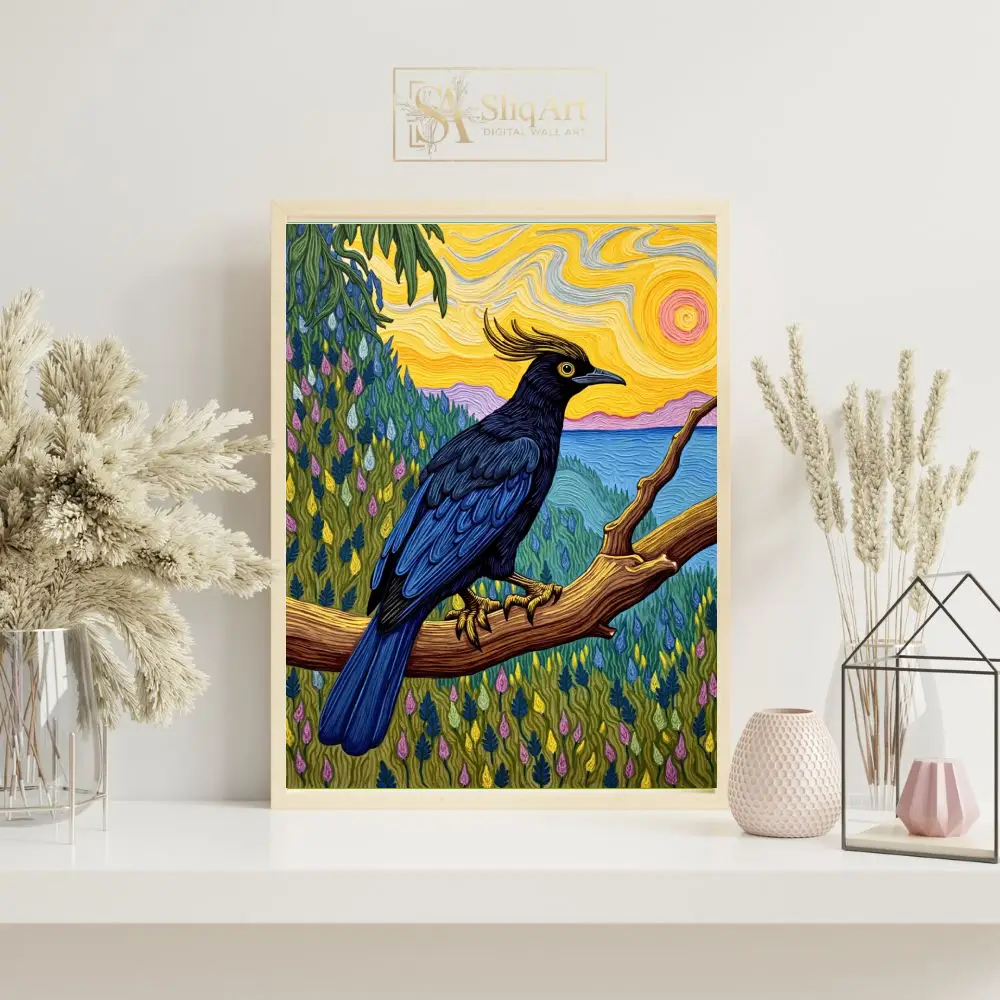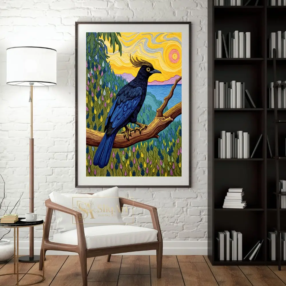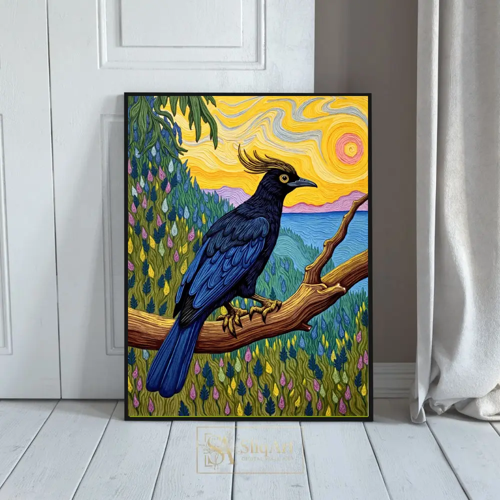 This striking piece of wall art features a majestic crested bird with deep navy and black plumage, perched gracefully on a sturdy wooden branch. The background is a masterclass in texture and color, drawing inspiration from post-impressionist techniques with swirling, impasto-style brushstrokes.