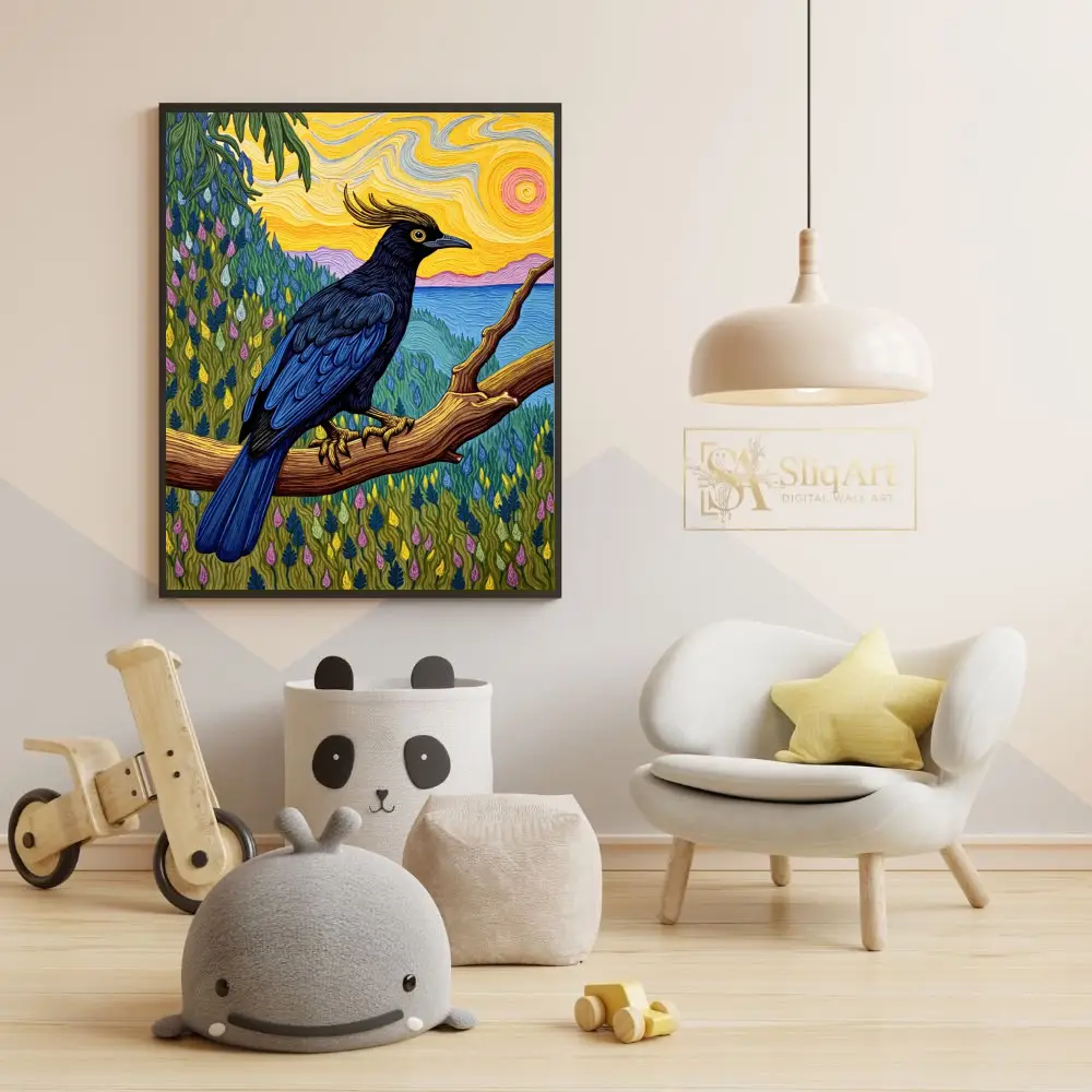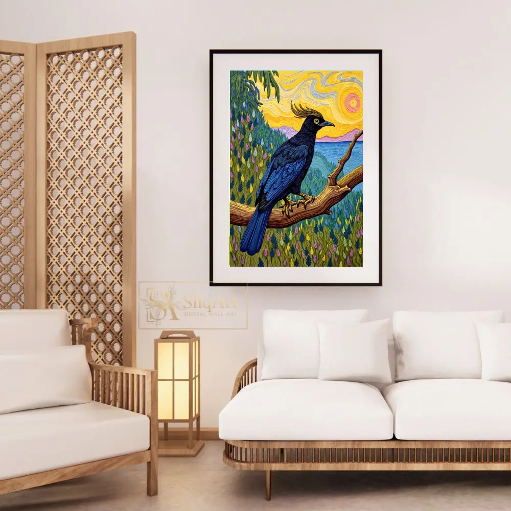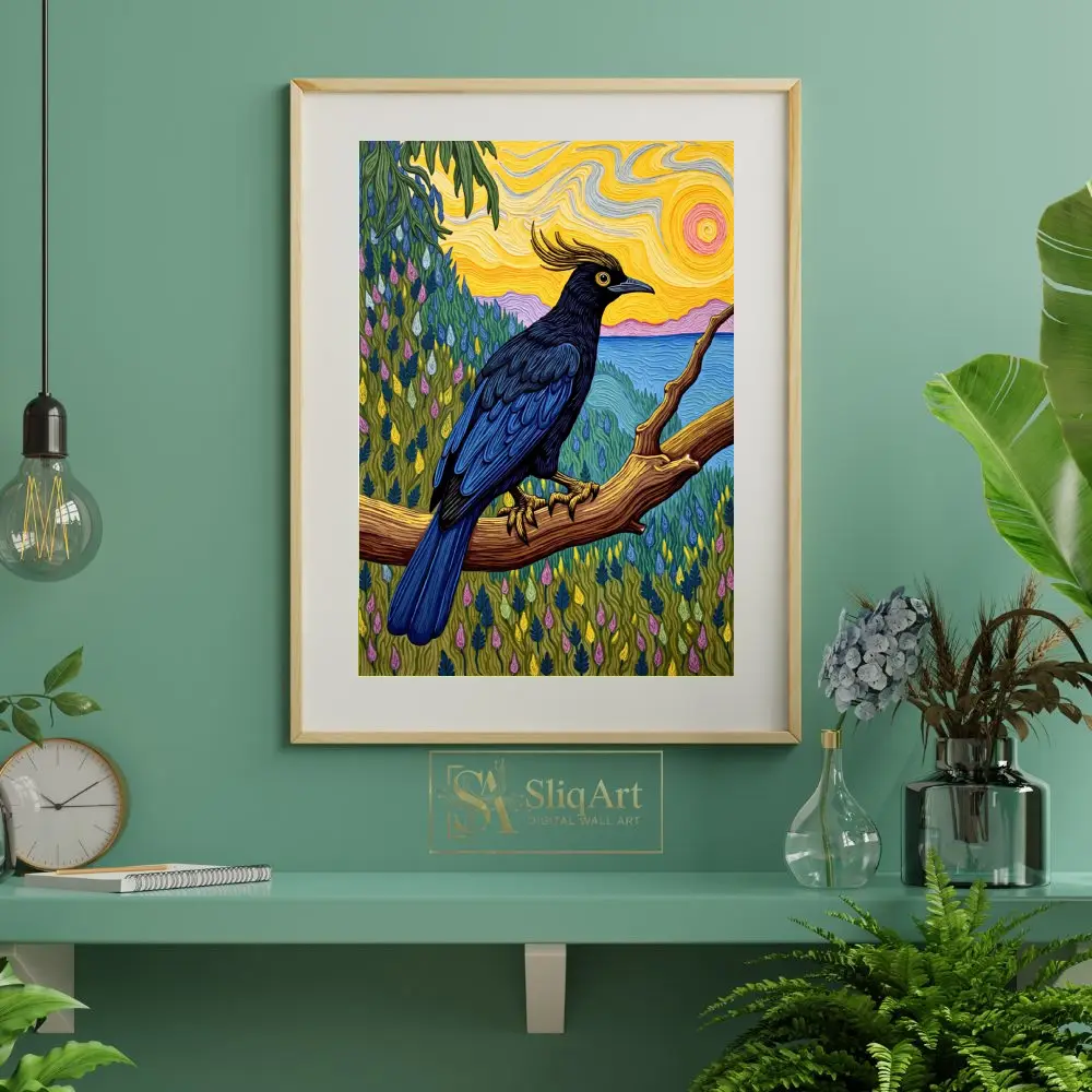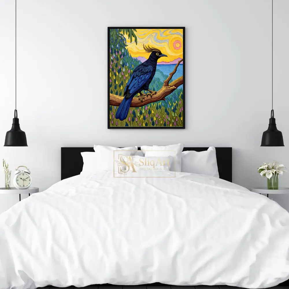 This striking piece of wall art features a majestic crested bird with deep navy and black plumage, perched gracefully on a sturdy wooden branch. The background is a masterclass in texture and color, drawing inspiration from post-impressionist techniques with swirling, impasto-style brushstrokes.