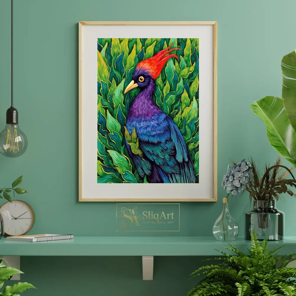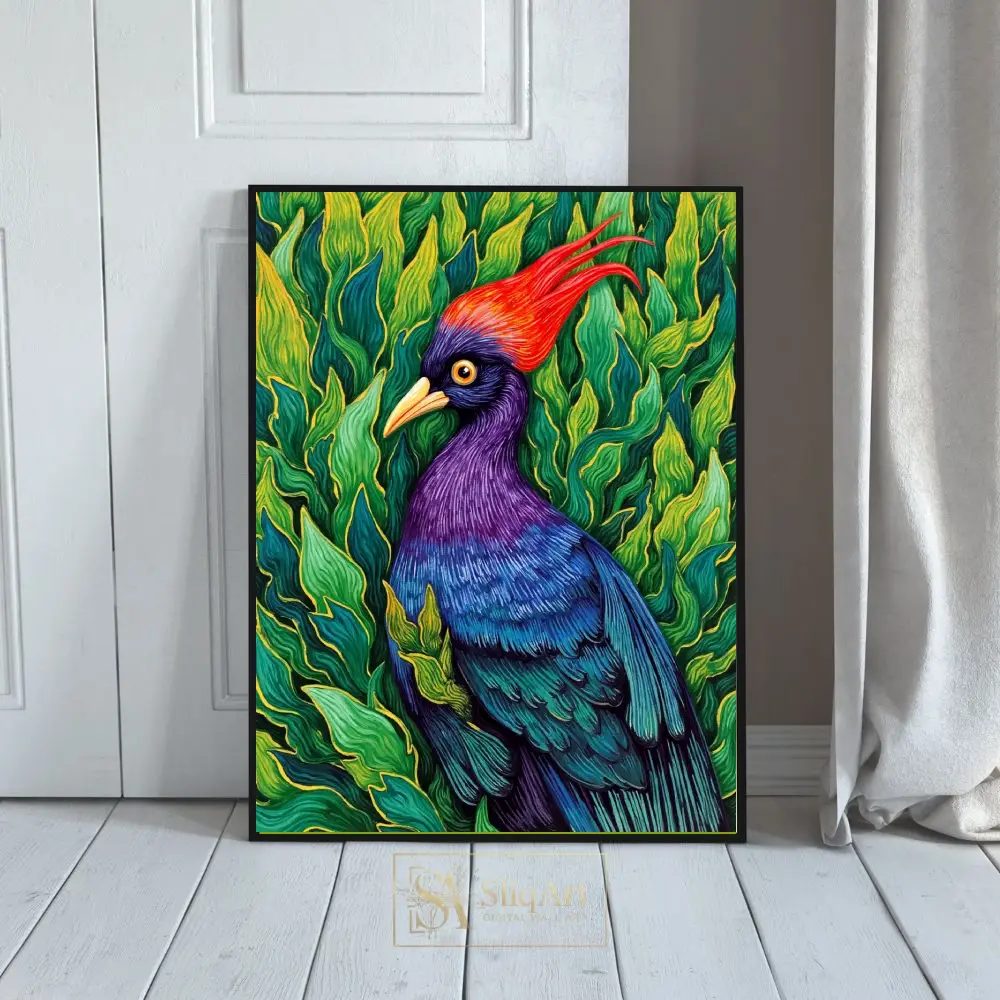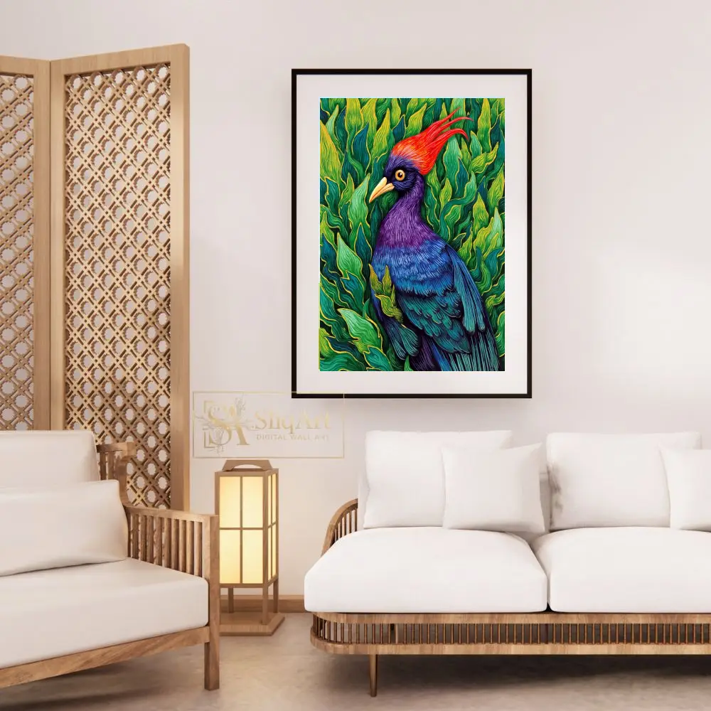 Transform your walls with this breathtaking illustrative print of a majestic tropical bird. This piece captures the bird’s striking features, including a fiery red crest and a rich gradient of purple and blue feathers, set against a dense backdrop of lush, emerald-green leaves.