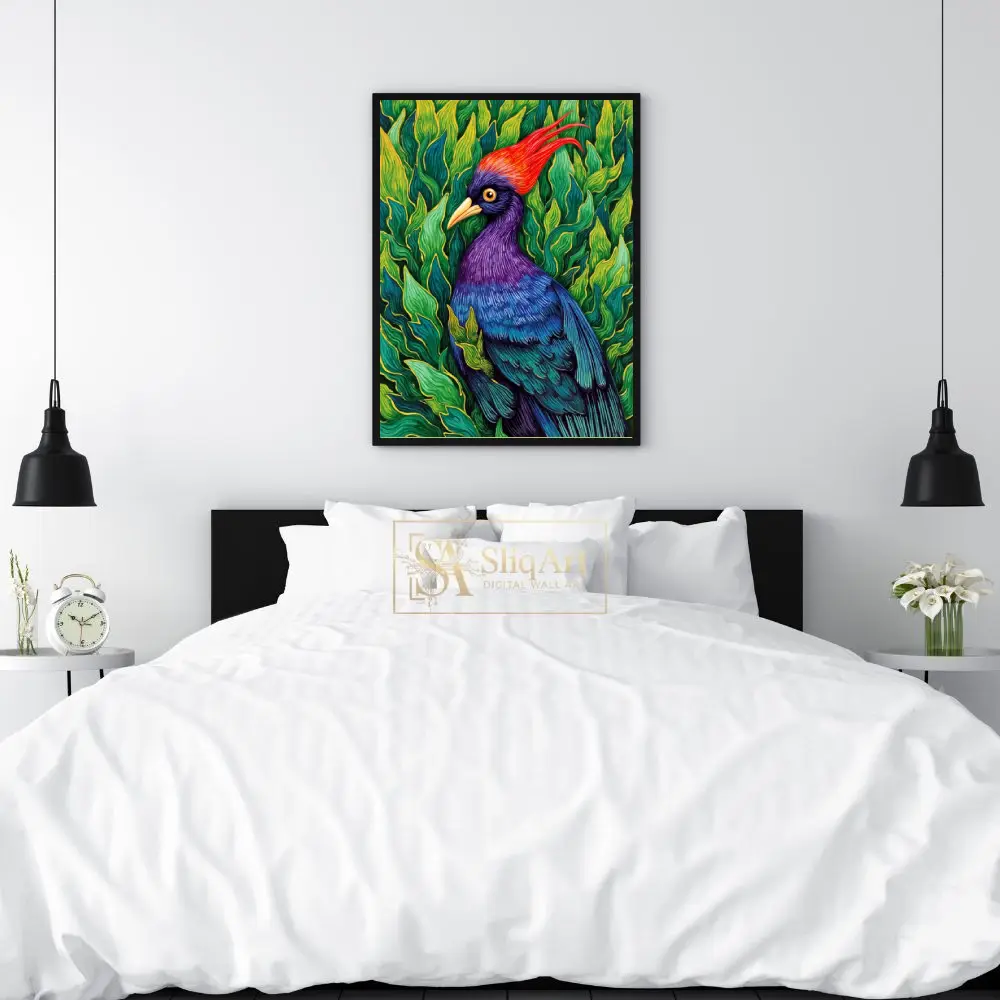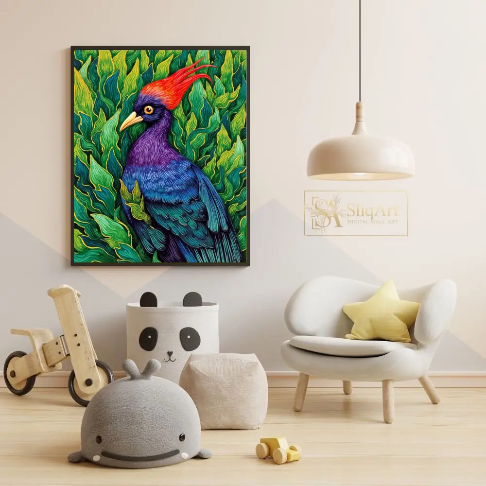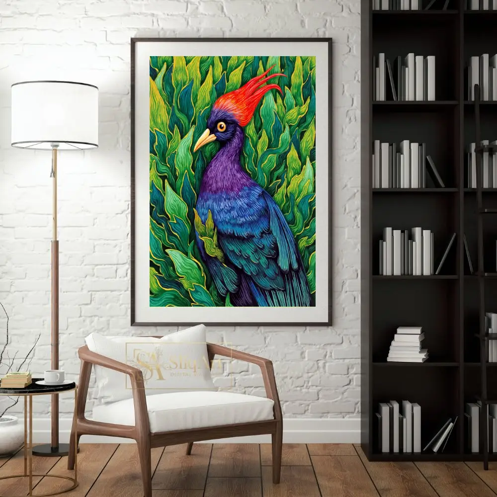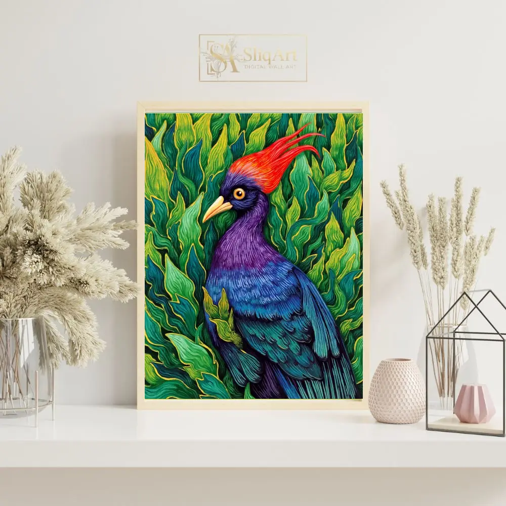 Transform your walls with this breathtaking illustrative print of a majestic tropical bird. This piece captures the bird’s striking features, including a fiery red crest and a rich gradient of purple and blue feathers, set against a dense backdrop of lush, emerald-green leaves.