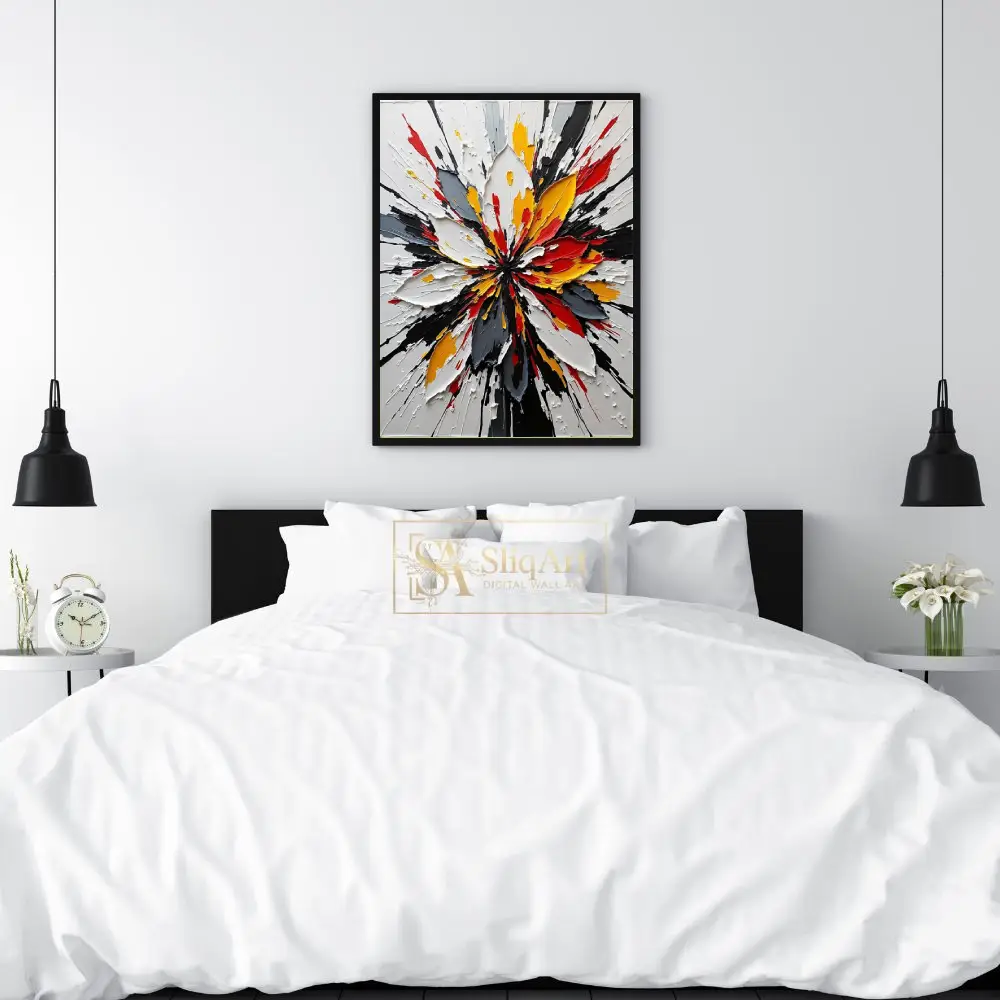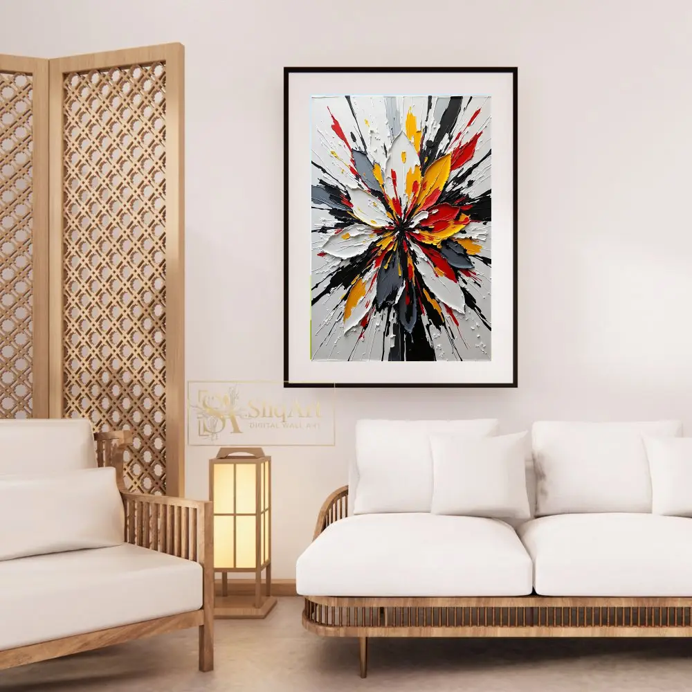 Elevate your interior with this striking abstract impasto artwork. Featuring a dynamic explosion of colors—vibrant reds, sun-drenched yellows, and deep blacks against a crisp white background—this piece creates a powerful visual focal point.