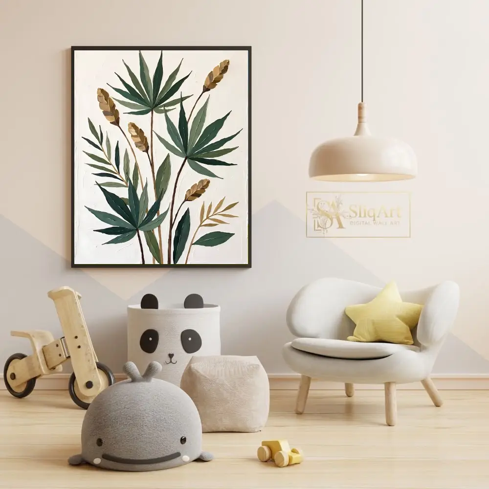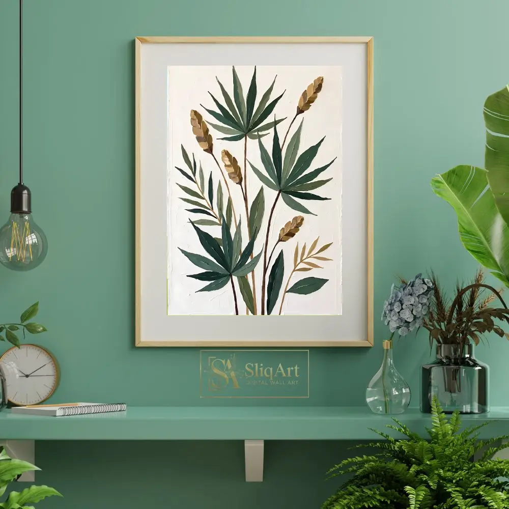 Transform your living space with this exquisite botanical impasto painting, a celebration of organic form and rich texture. This piece showcases a series of palm-like leaves in varying shades of sage and forest green, complemented by golden-tan seed pods that add a warm, metallic glow.