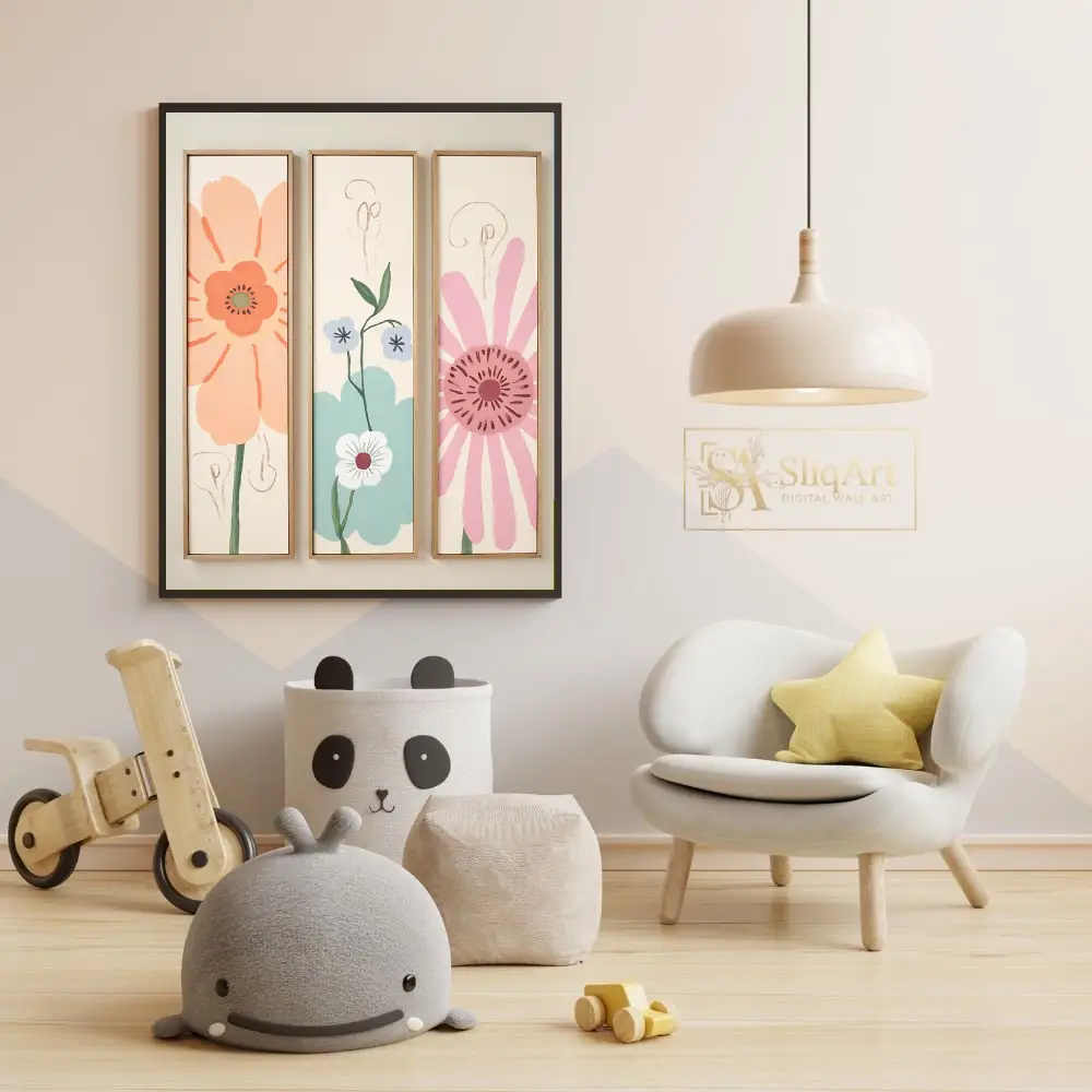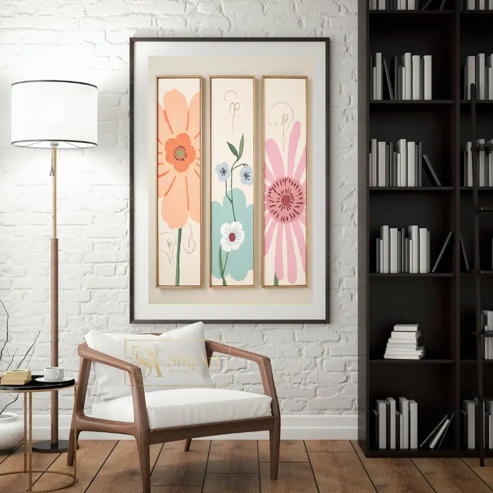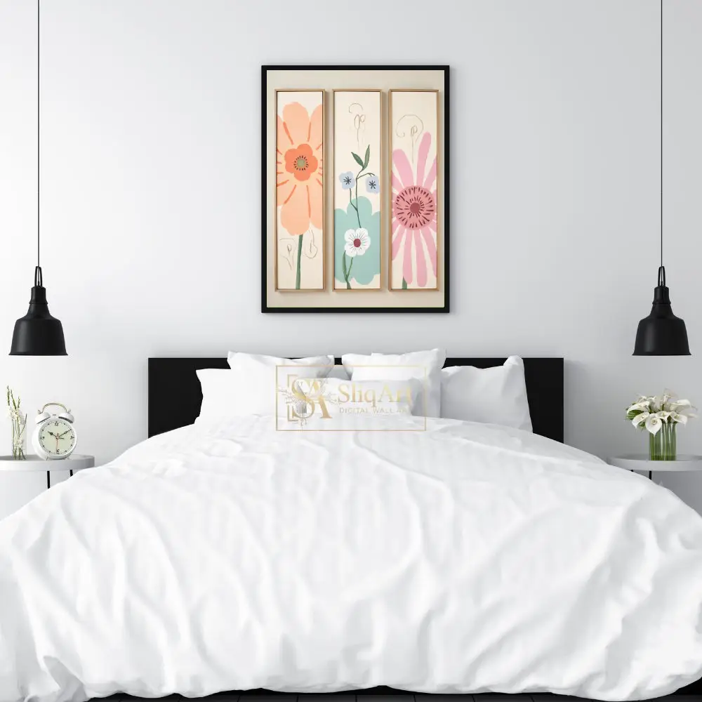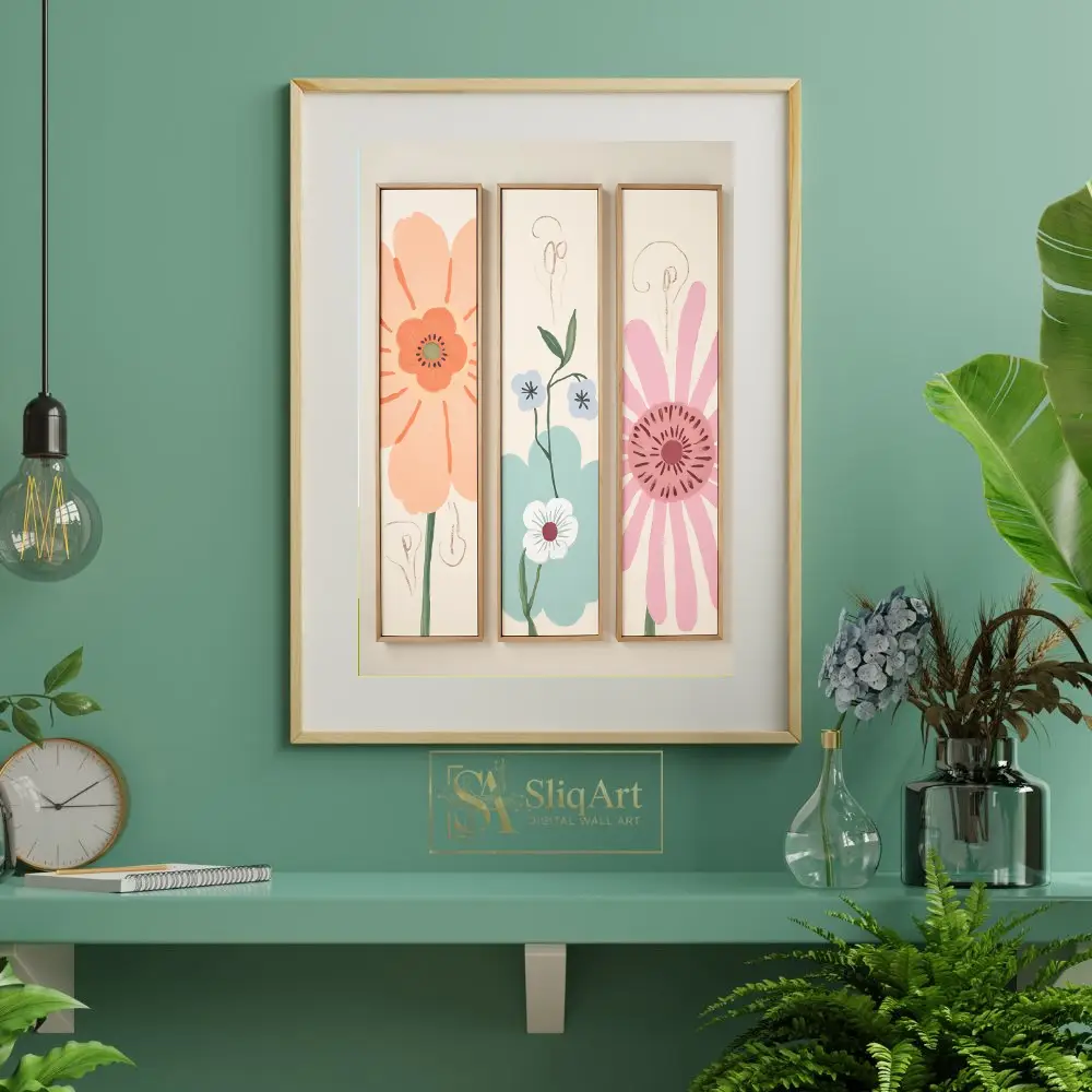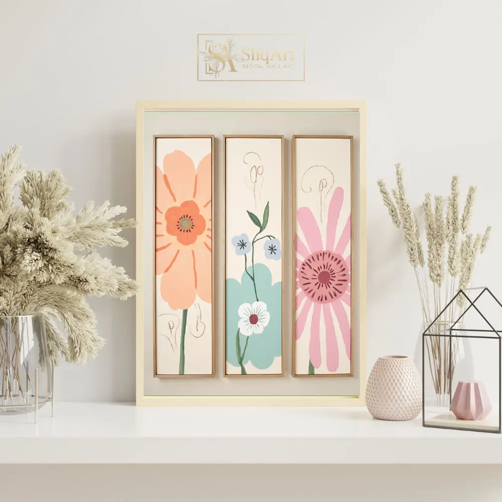Elevate your interior with this enchanting three-piece floral canvas set. Featuring a delightful blend of peach, teal, and soft pink blossoms, these minimalist botanical prints bring a sense of serene whimsy to any wall.