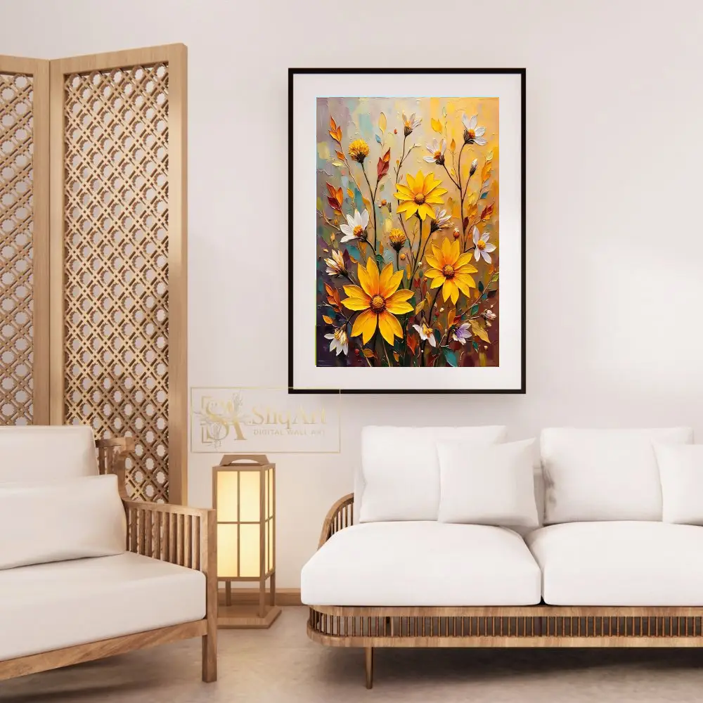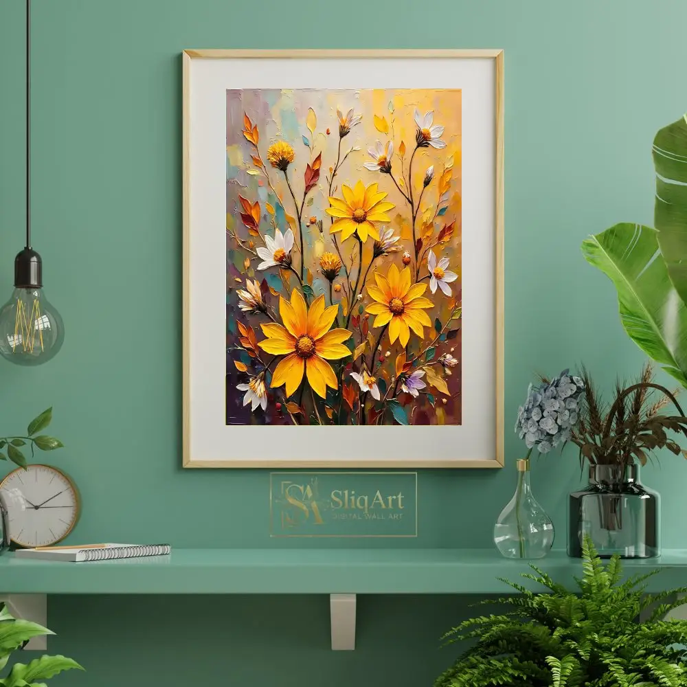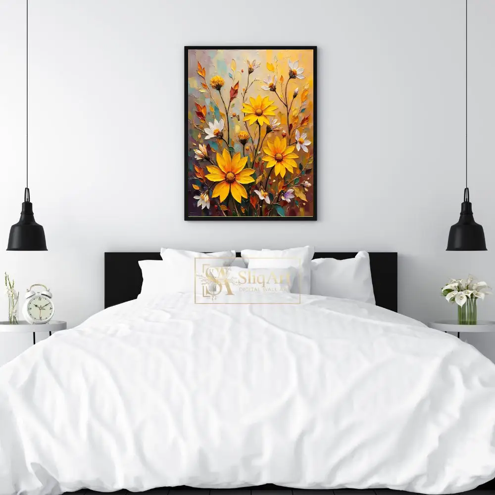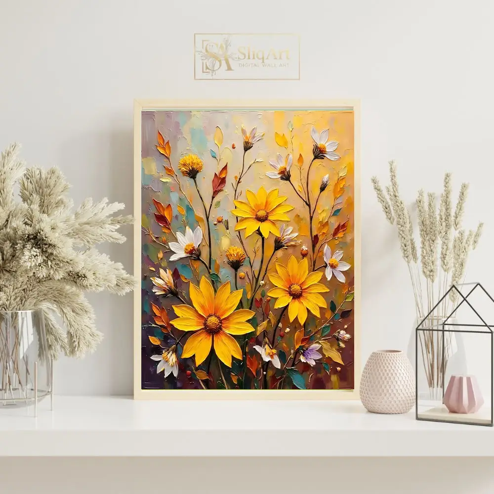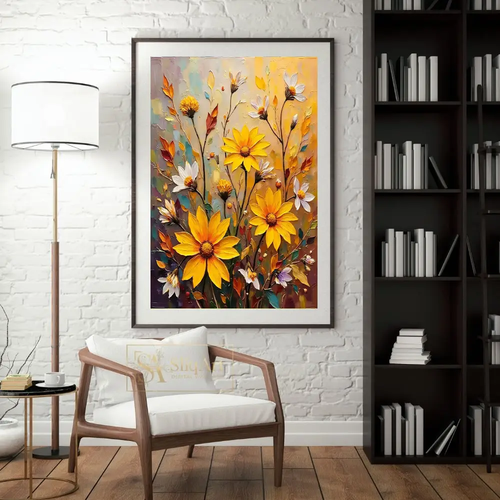 Elevate your home aesthetic with this stunning impasto-style floral painting. Featuring a radiant array of sunflowers and delicate white daisies, this piece uses thick, expressive brushstrokes to create a tactile sense of depth and movement.