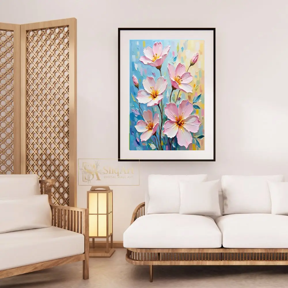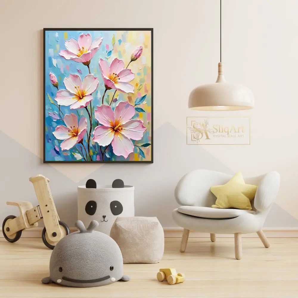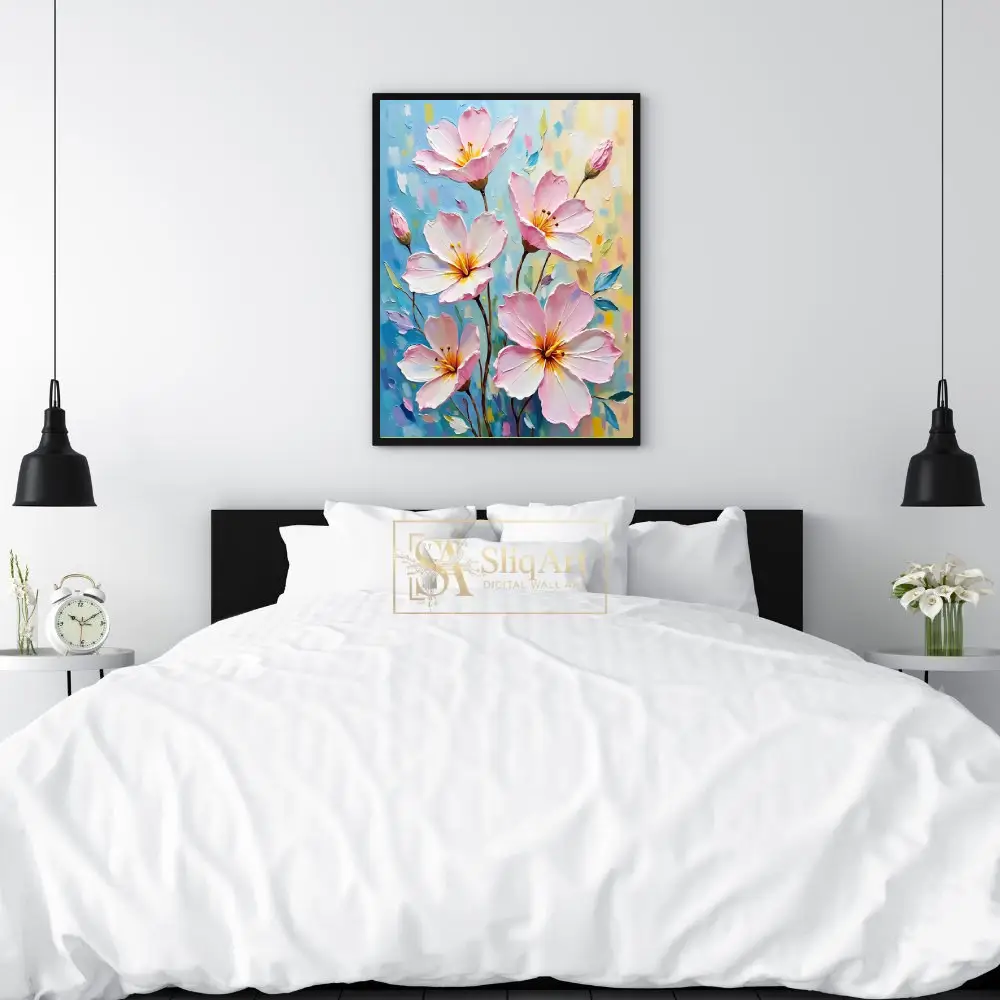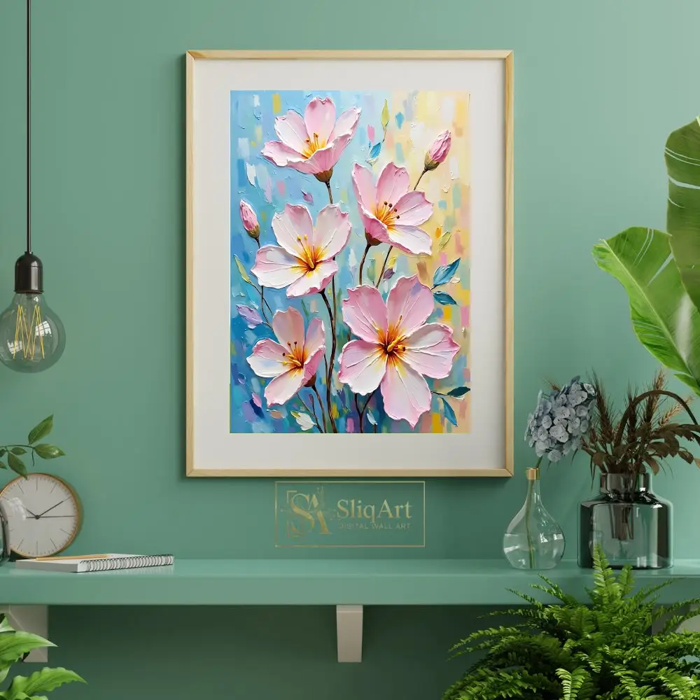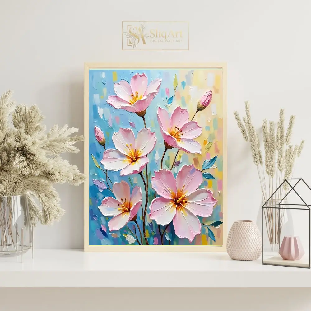 Add a breath of fresh air to your home with this exquisite Impressionist-style floral painting. Featuring delicate pink blossoms rendered with thick, impasto brushstrokes, this piece creates a captivating sense of depth and movement.