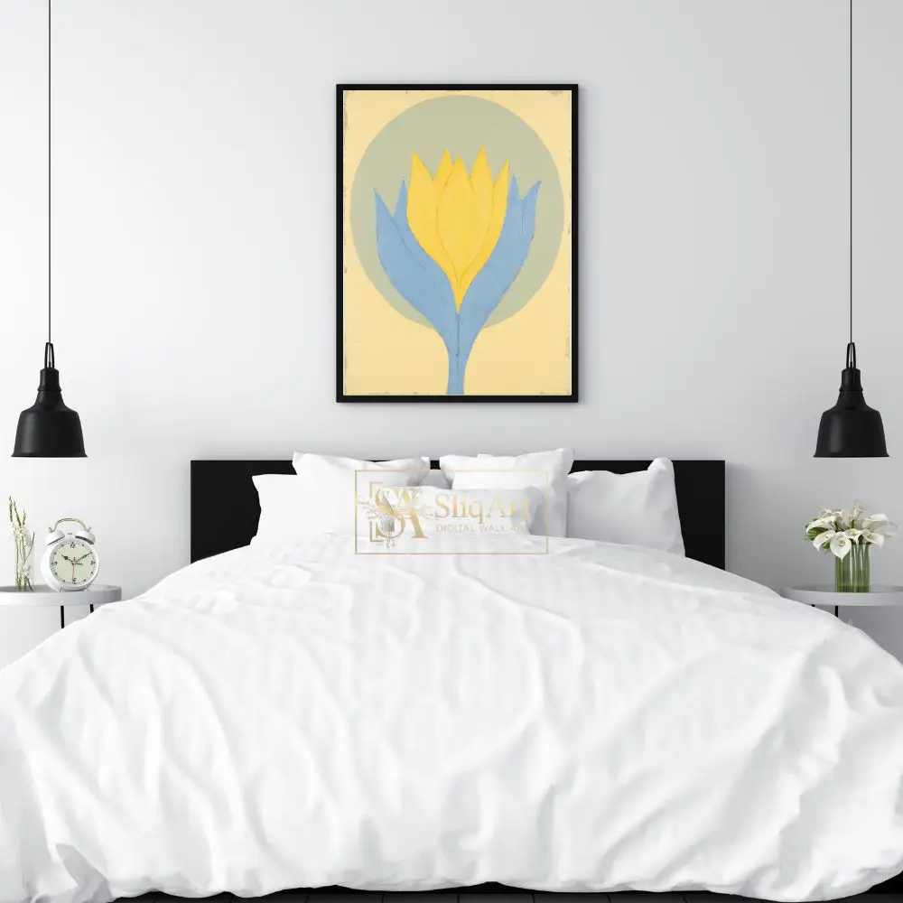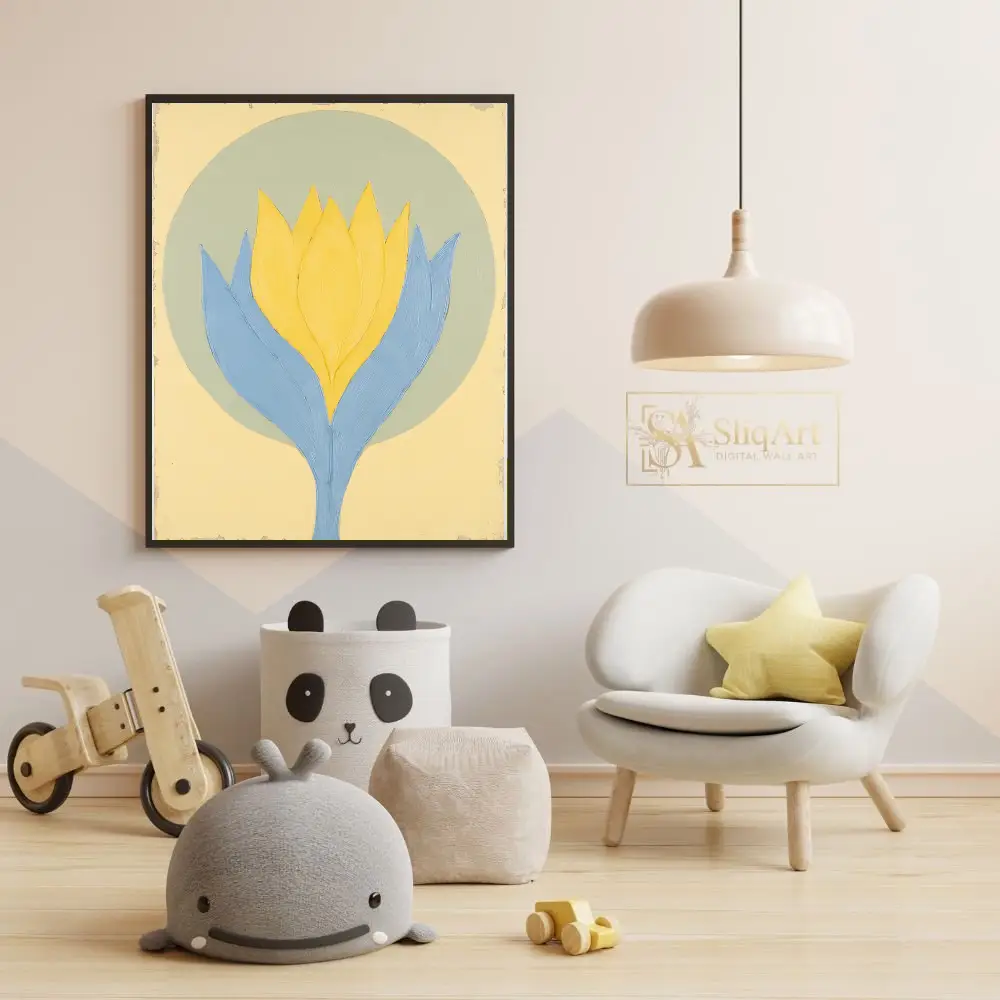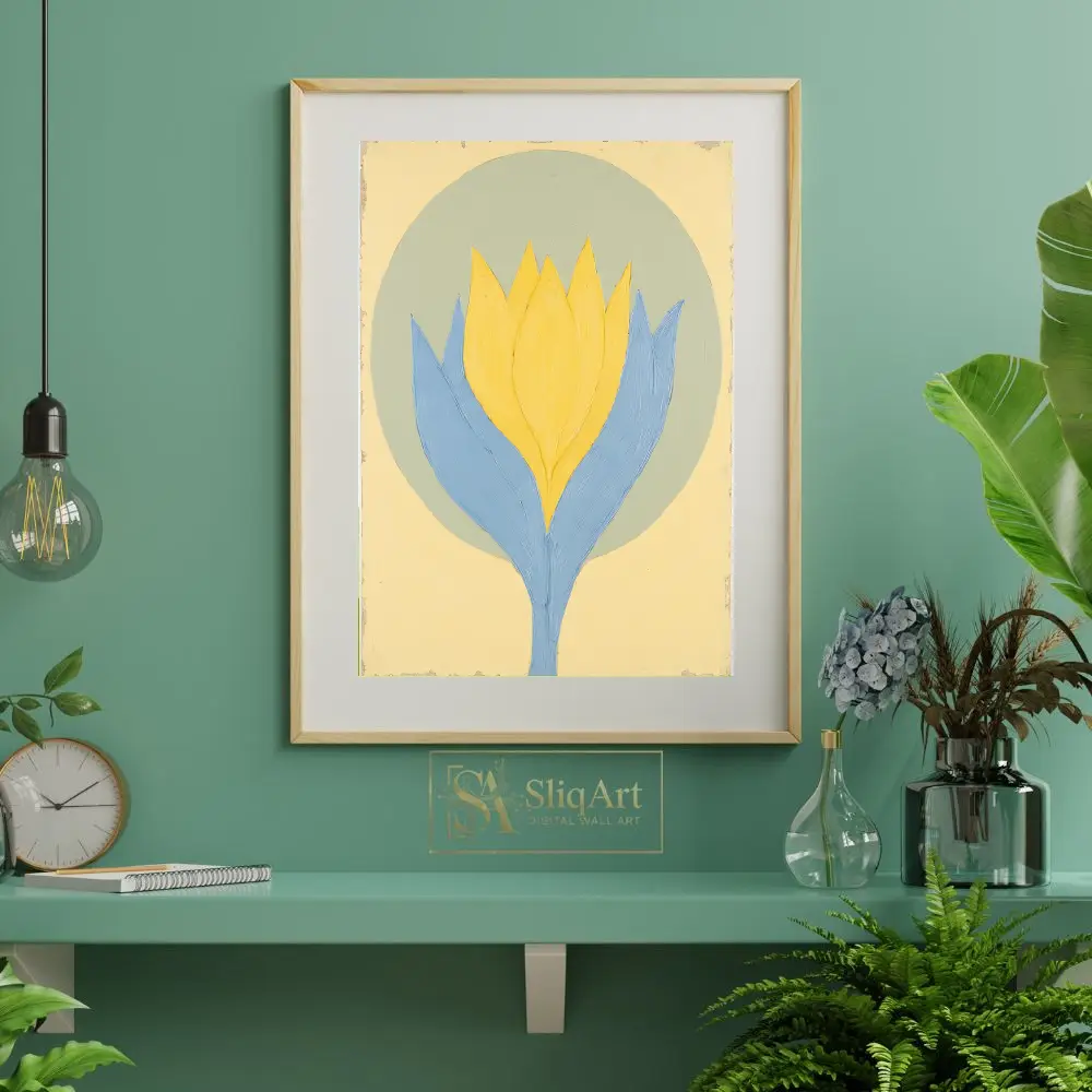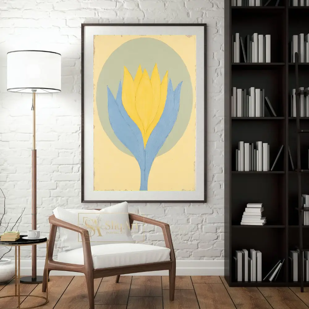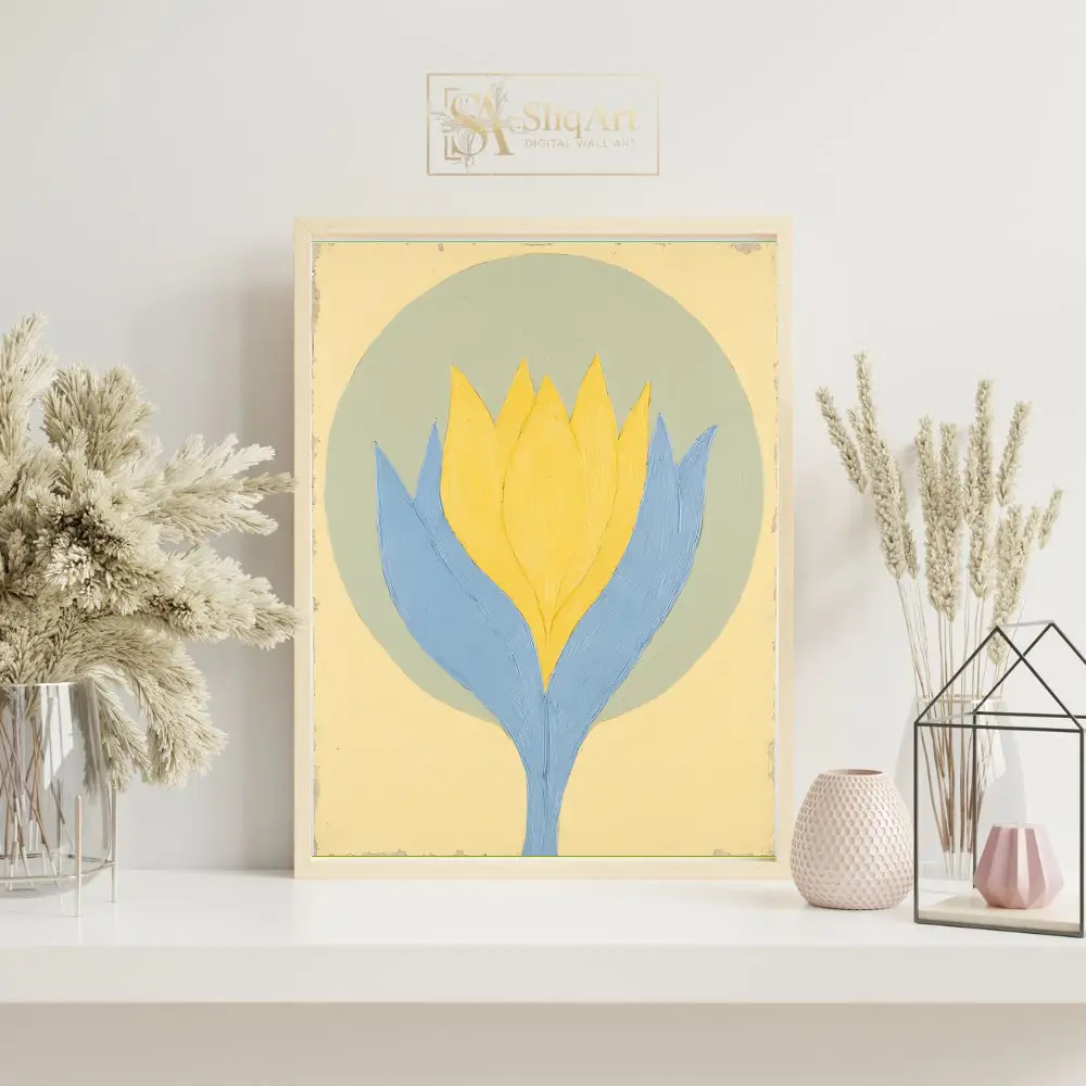 This captivating piece features a stylized floral bloom rendered with a distinct impasto-like texture. A central sun-yellow flower is cradled by soft, sky-blue petals, all set against a muted sage green circular backdrop and a warm cream canvas.