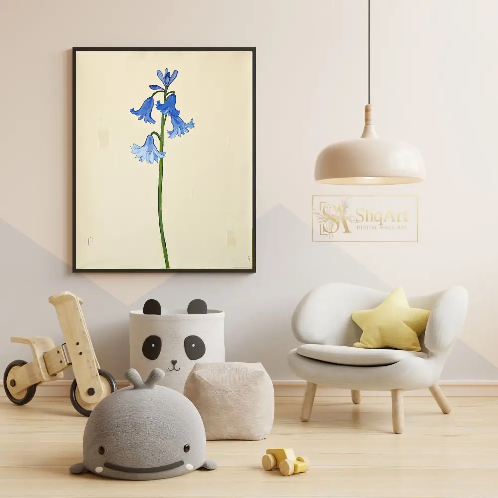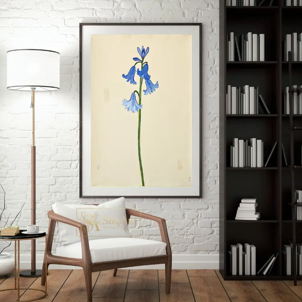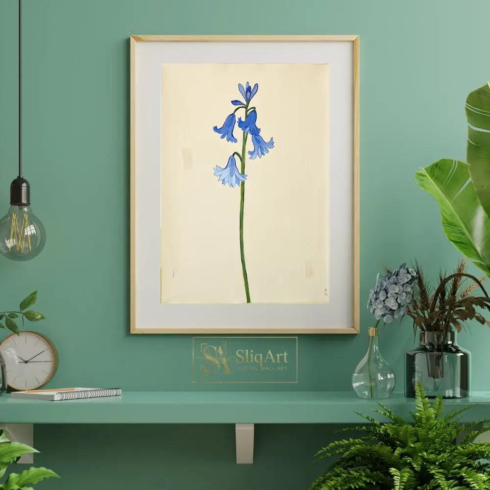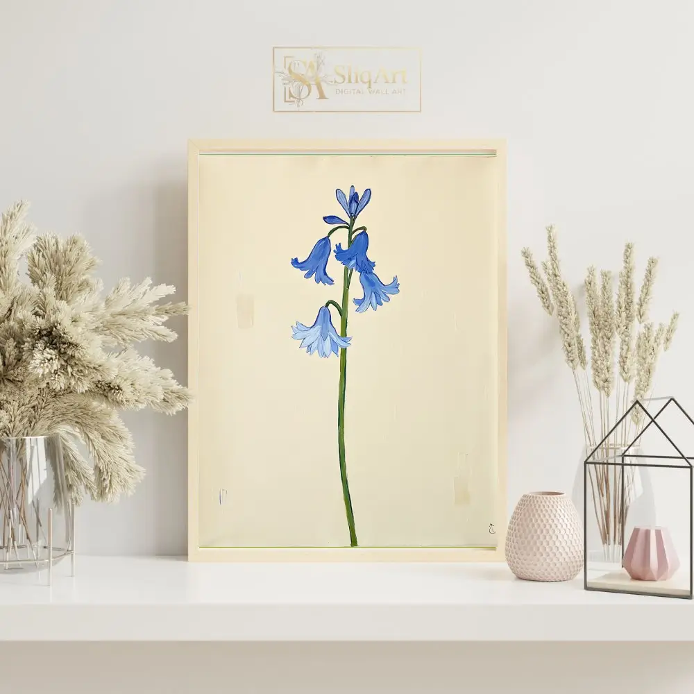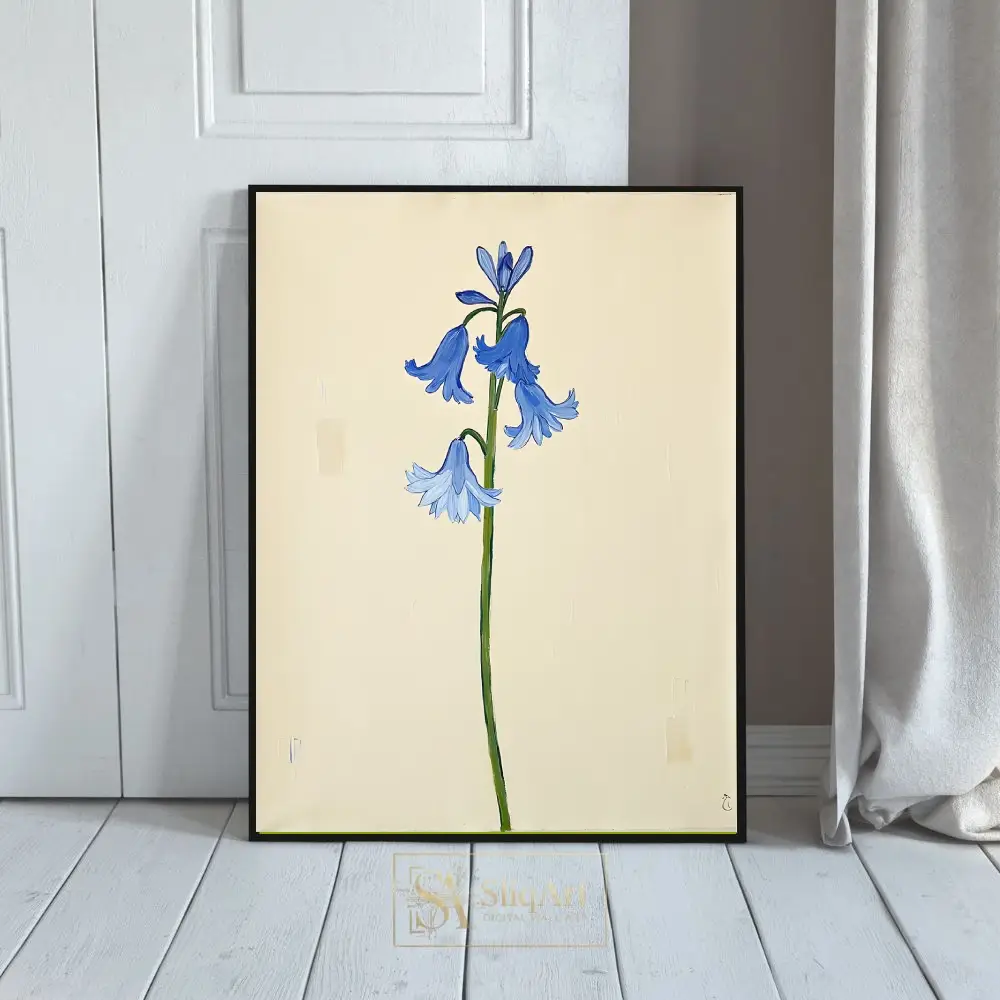 This minimalist botanical art piece features a slender stalk of vibrant bluebell-inspired flowers set against a soft, cream-colored background. The clean lines and gentle hues of blue and green create a sense of serenity and natural beauty.
