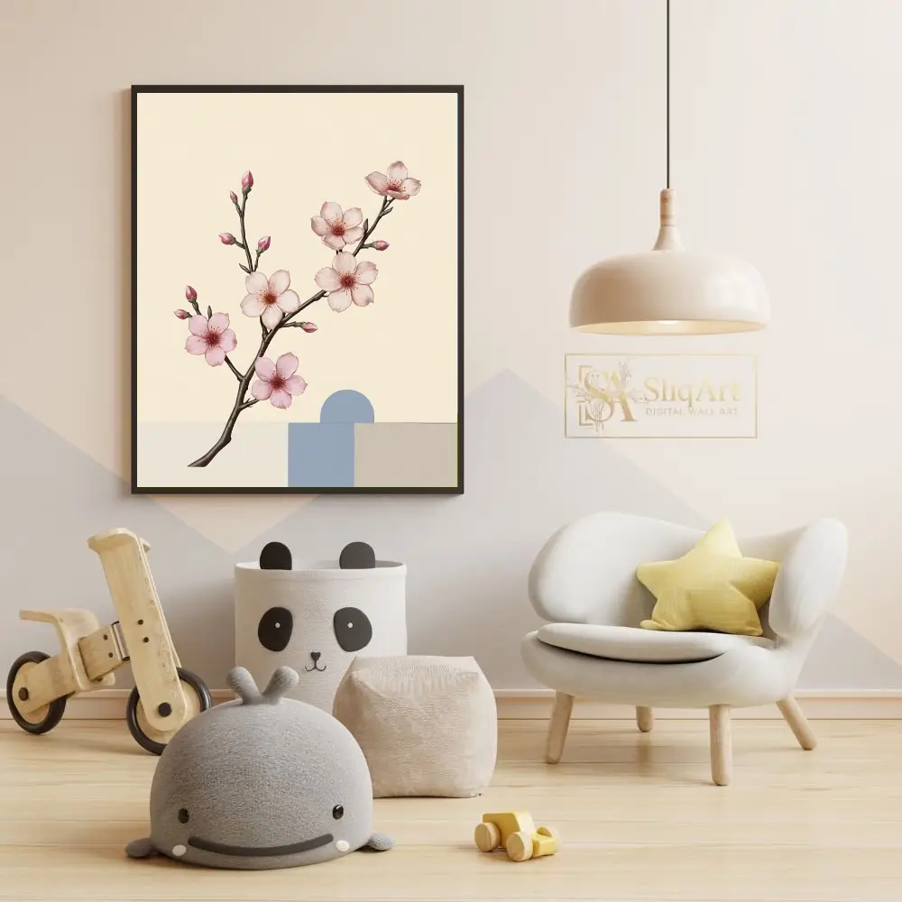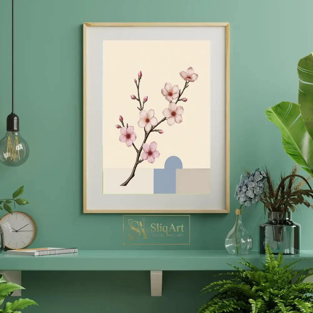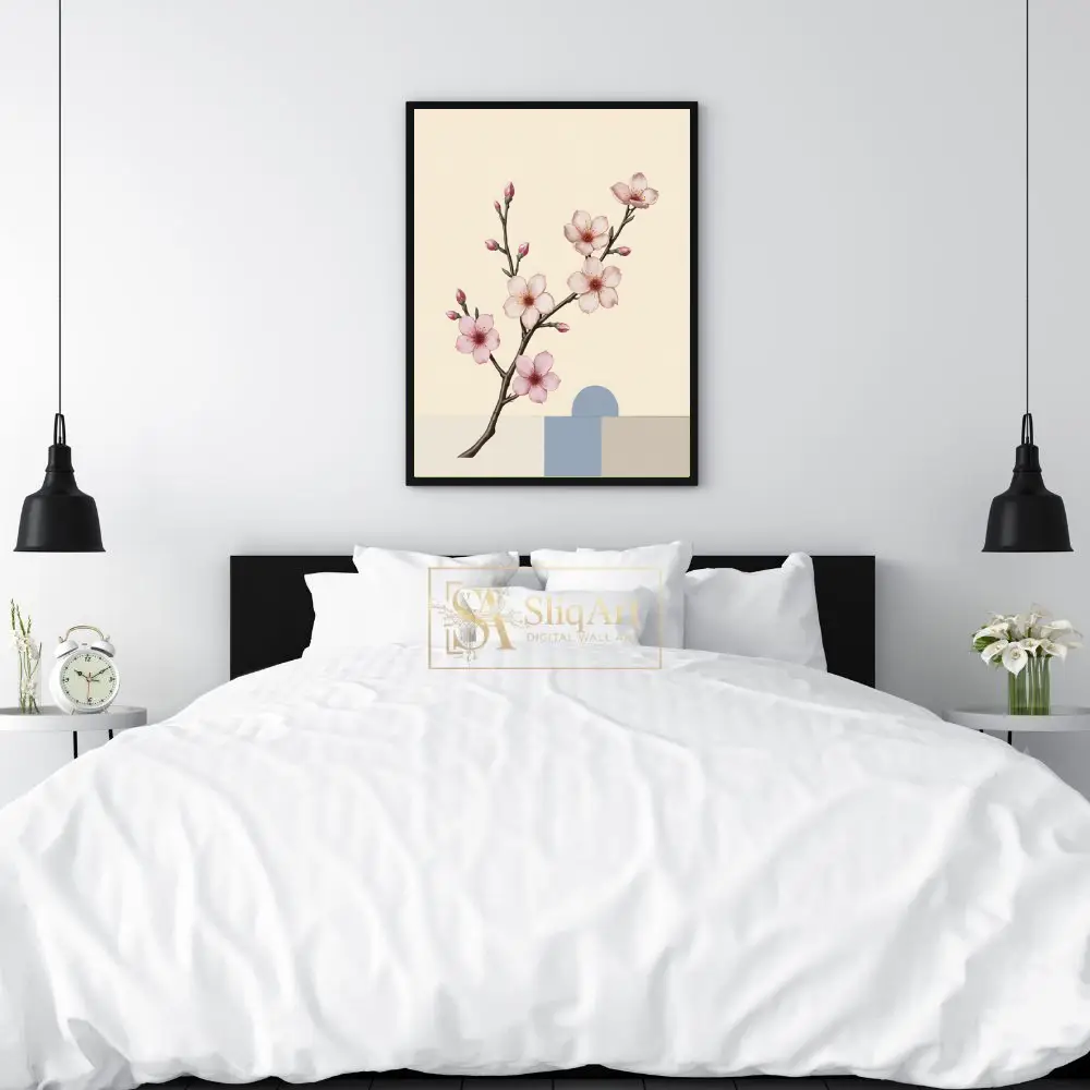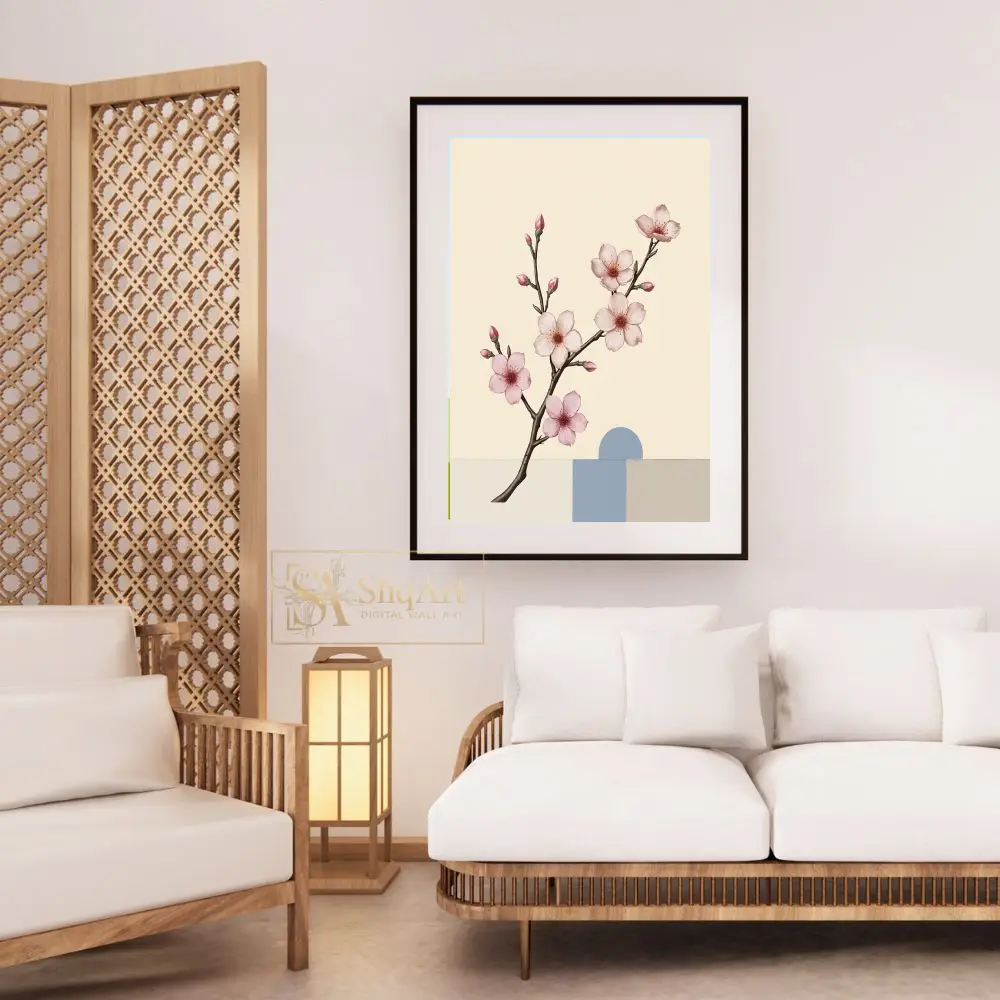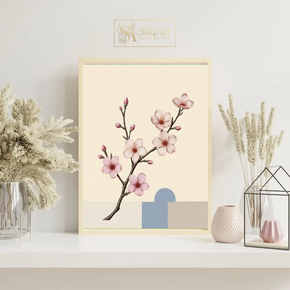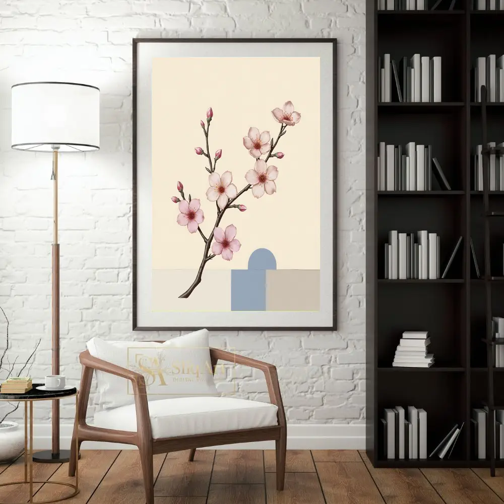 Add a touch of serene elegance to your interior with this minimalist cherry blossom wall art. The piece features a beautifully detailed branch of soft pink cherry blossoms and budding flowers, set against a calming cream background.