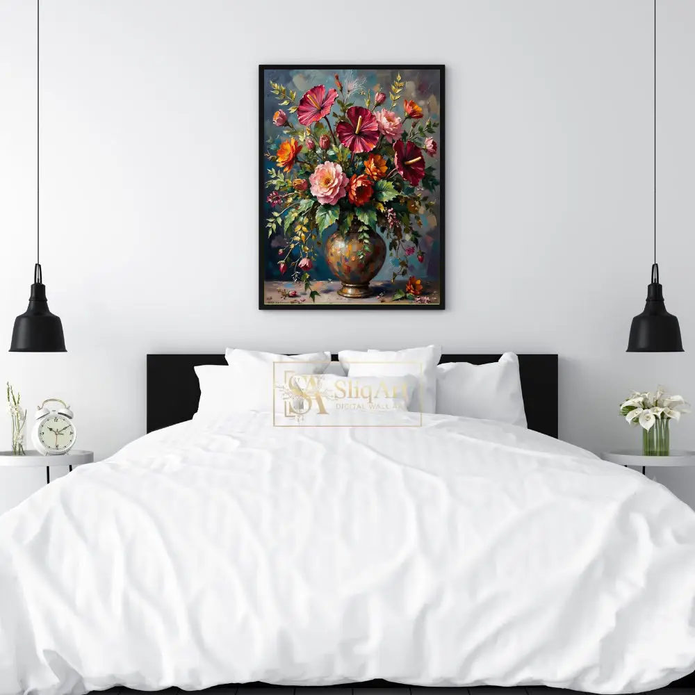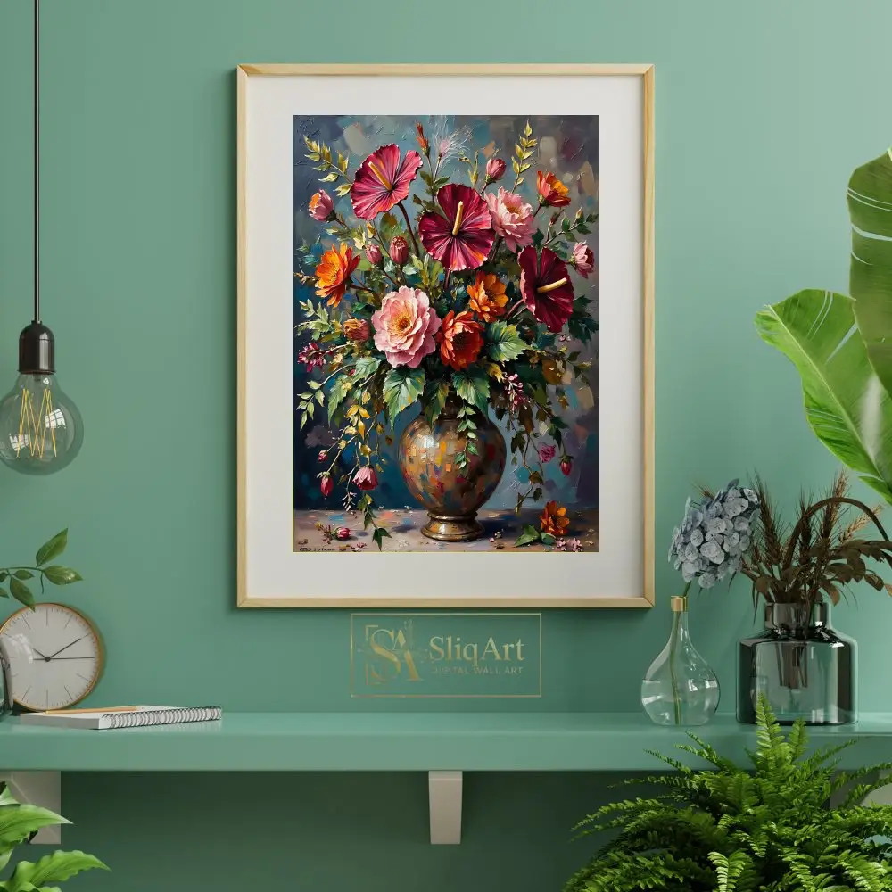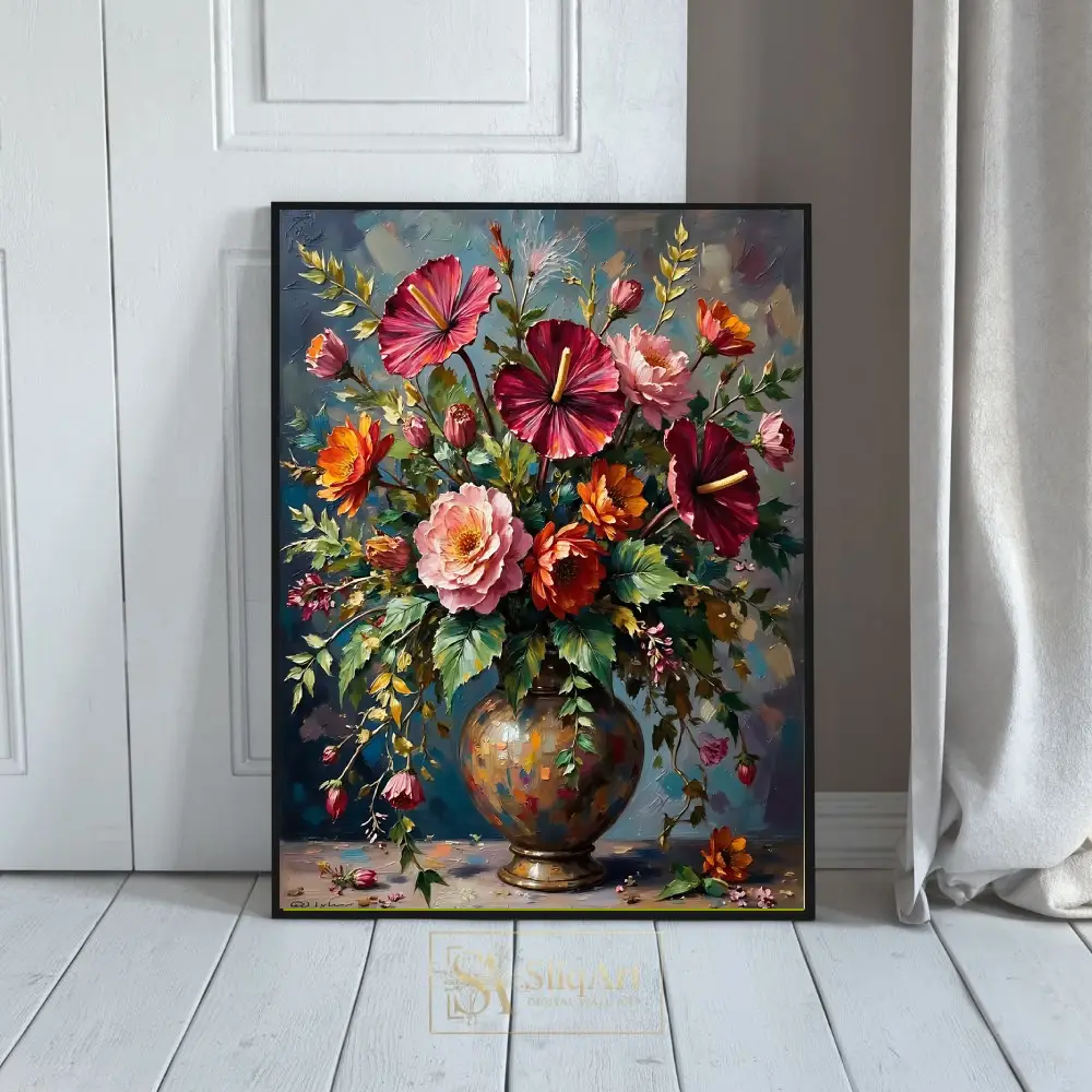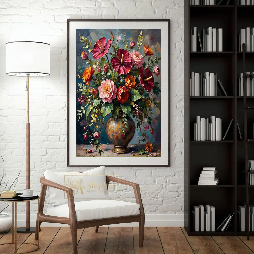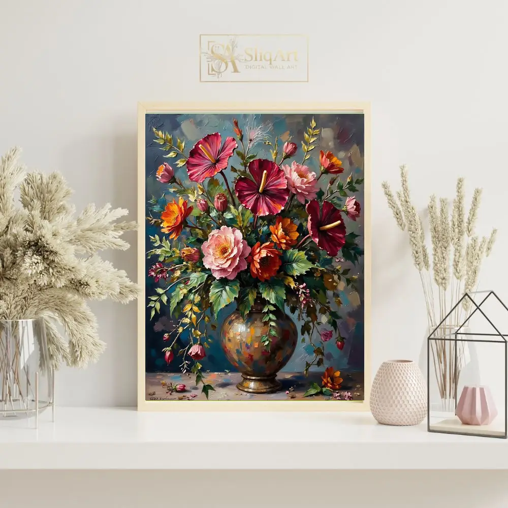 This exquisite floral arrangement captures the timeless beauty of a lush botanical bouquet through expressive, impressionist brushwork.