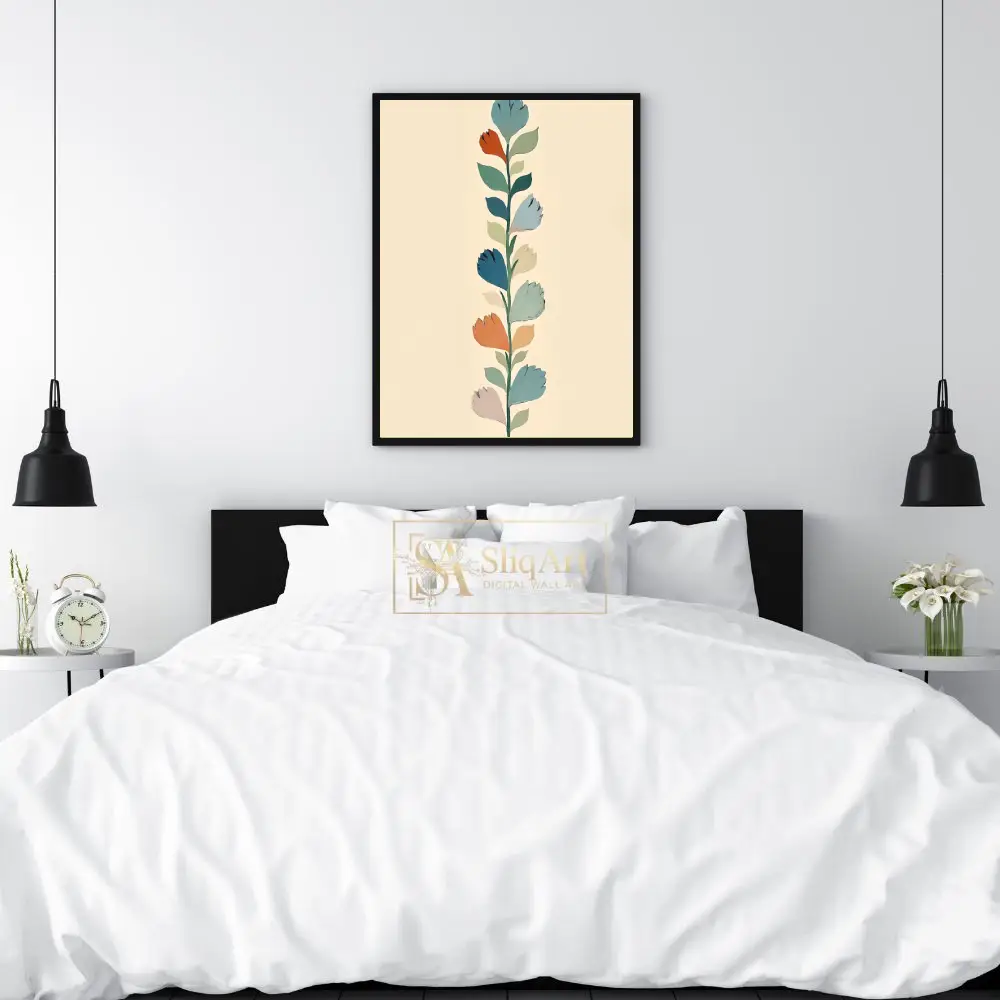 This elegant vertical botanical print features a stylized stem adorned with a rhythmic pattern of leaves and floral shapes in a sophisticated palette of muted teals, soft terracotta, and organic greens.