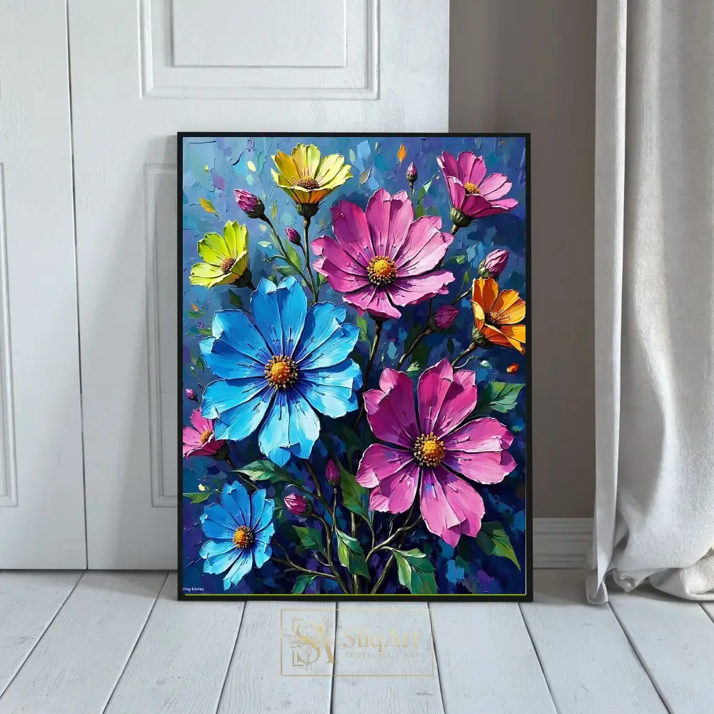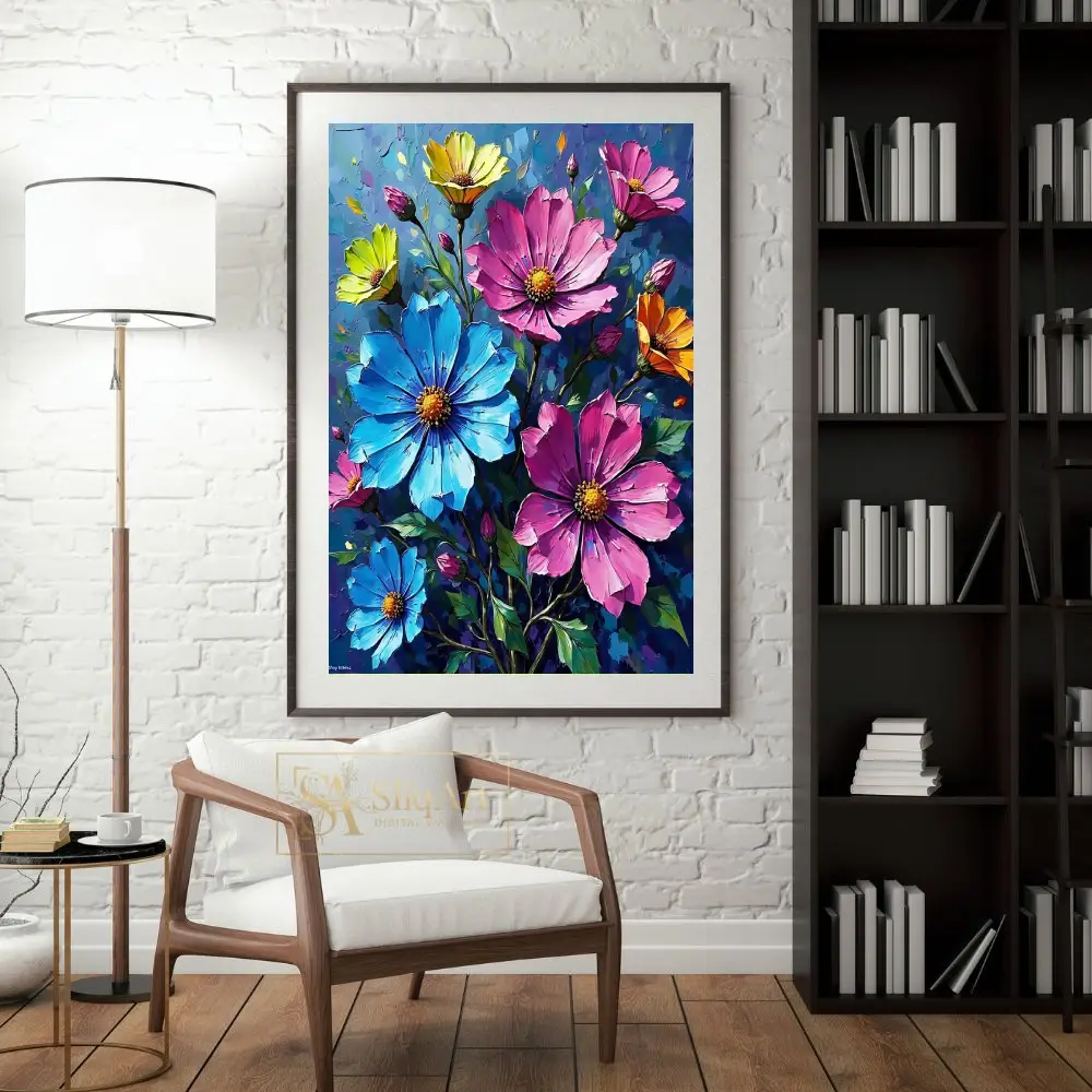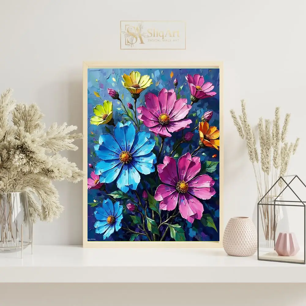 Bring a burst of color and artistic energy into your home with this stunning impasto-style floral canvas print. Featuring a vibrant bouquet of cosmos in brilliant shades of pink, sky blue, sunny yellow, and warm orange, this piece captures the beauty of nature with bold, expressive brushstrokes.