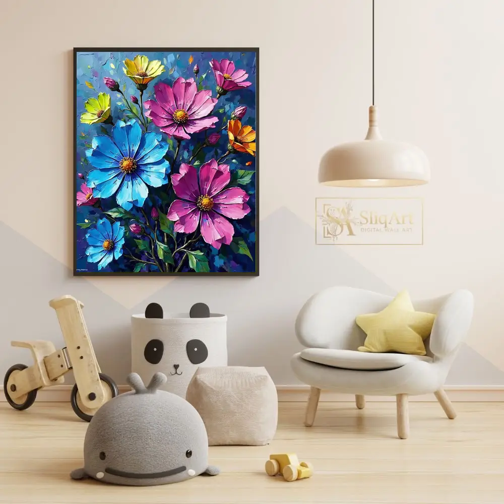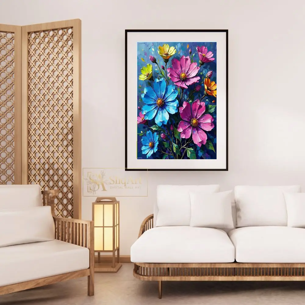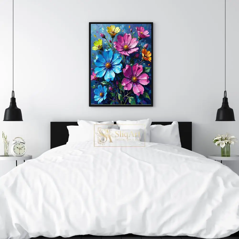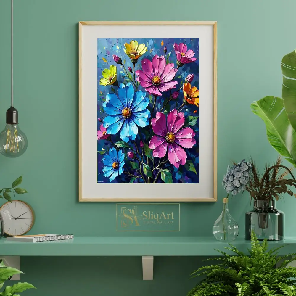 Bring a burst of color and artistic energy into your home with this stunning impasto-style floral canvas print. Featuring a vibrant bouquet of cosmos in brilliant shades of pink, sky blue, sunny yellow, and warm orange, this piece captures the beauty of nature with bold, expressive brushstrokes.