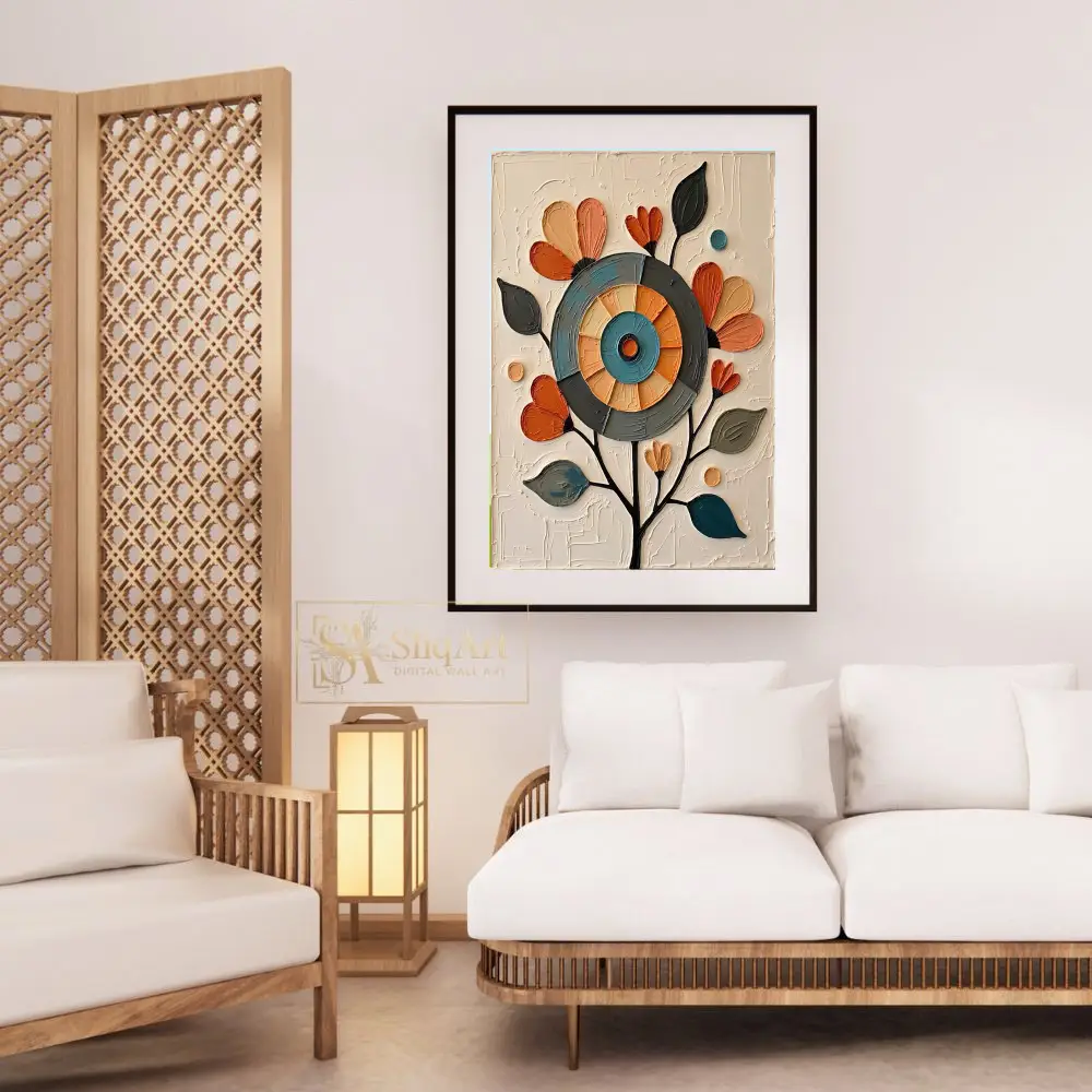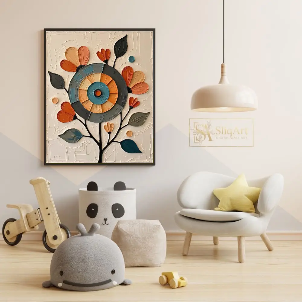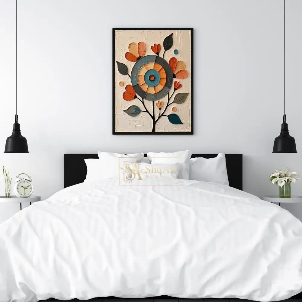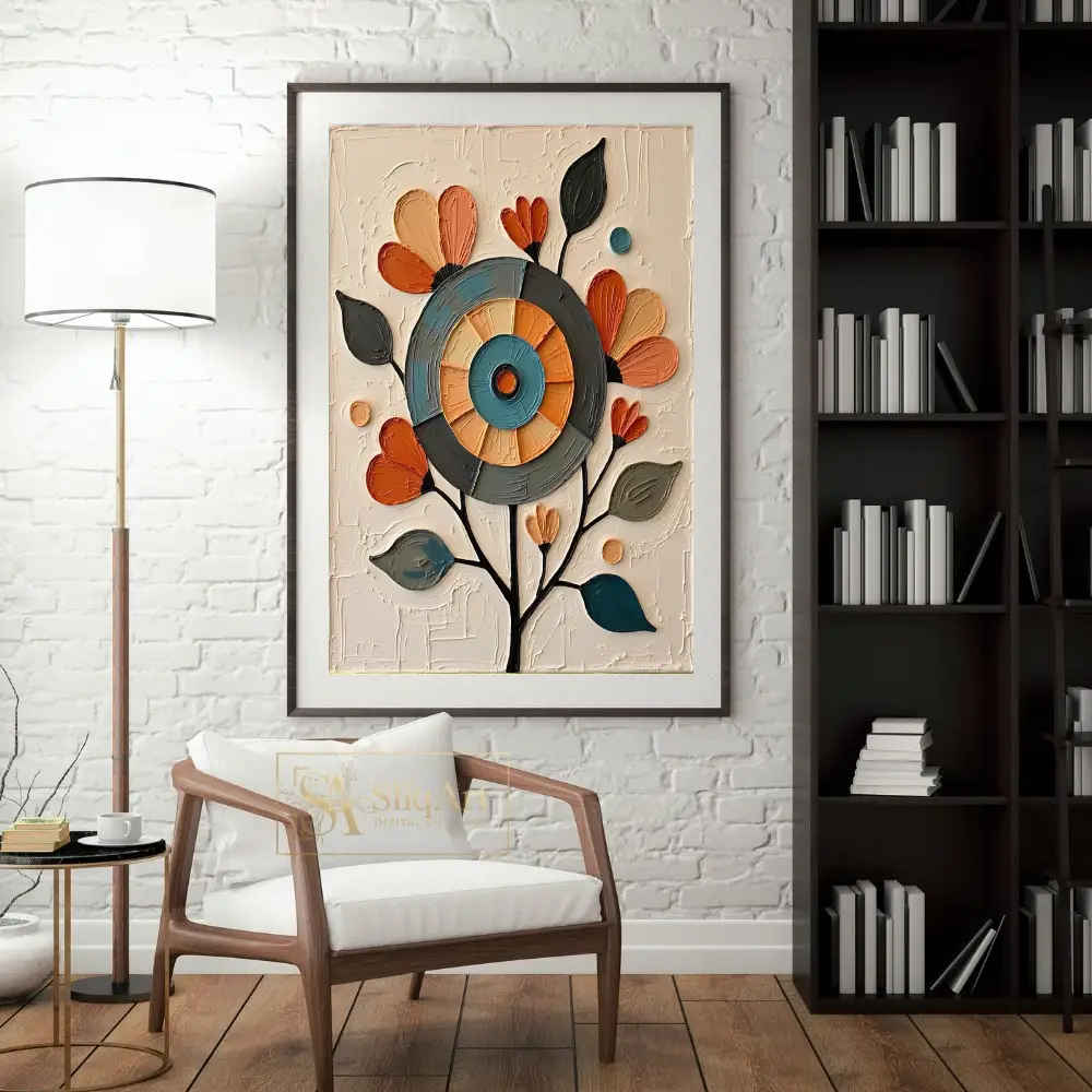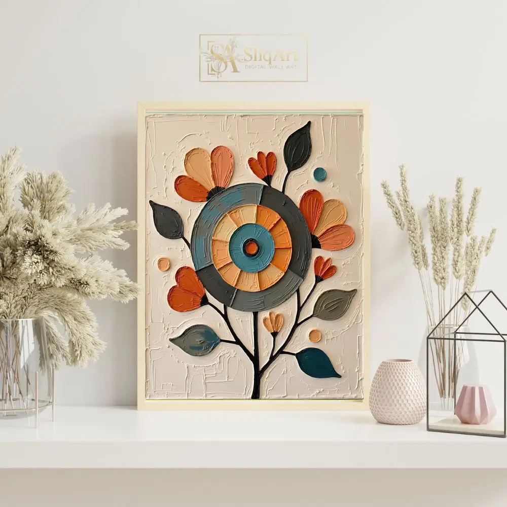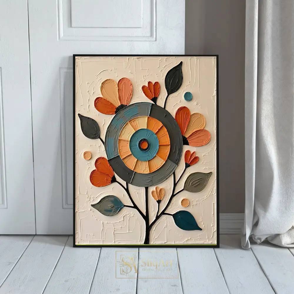 Elevate your interior with this striking 3D textured floral canvas. This piece features a unique geometric center reminiscent of a mid-century modern compass or vinyl record, blooming into vibrant orange and peach petals.