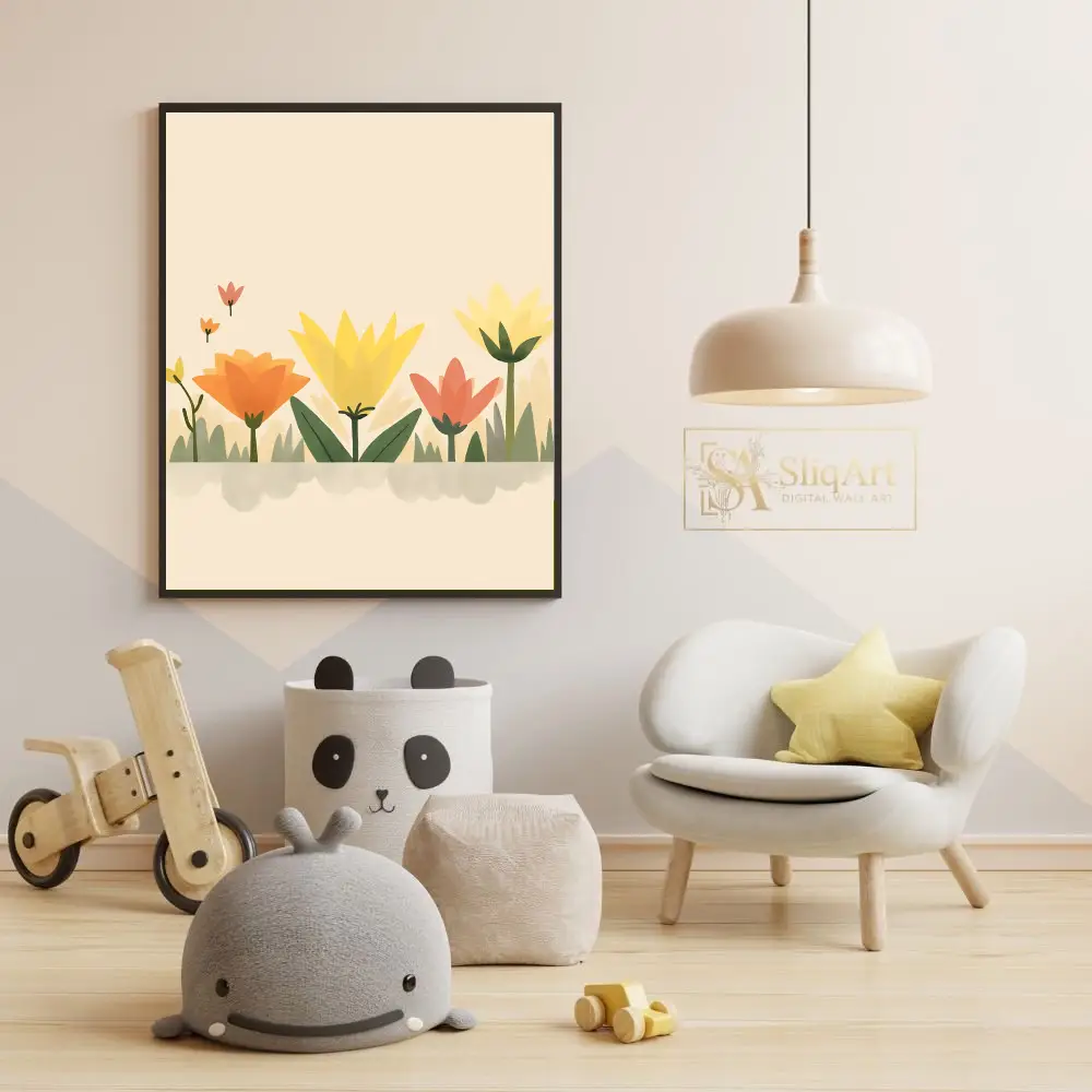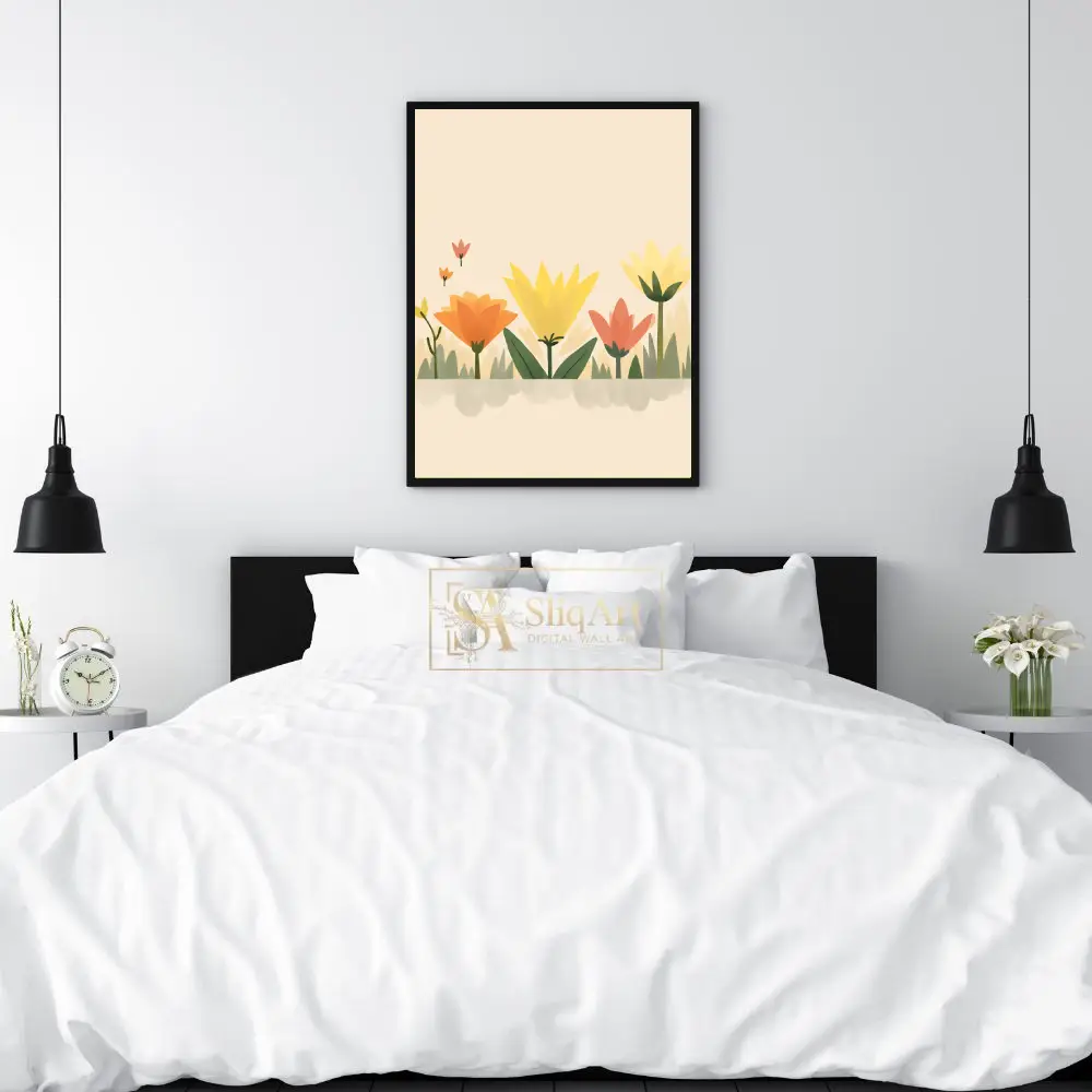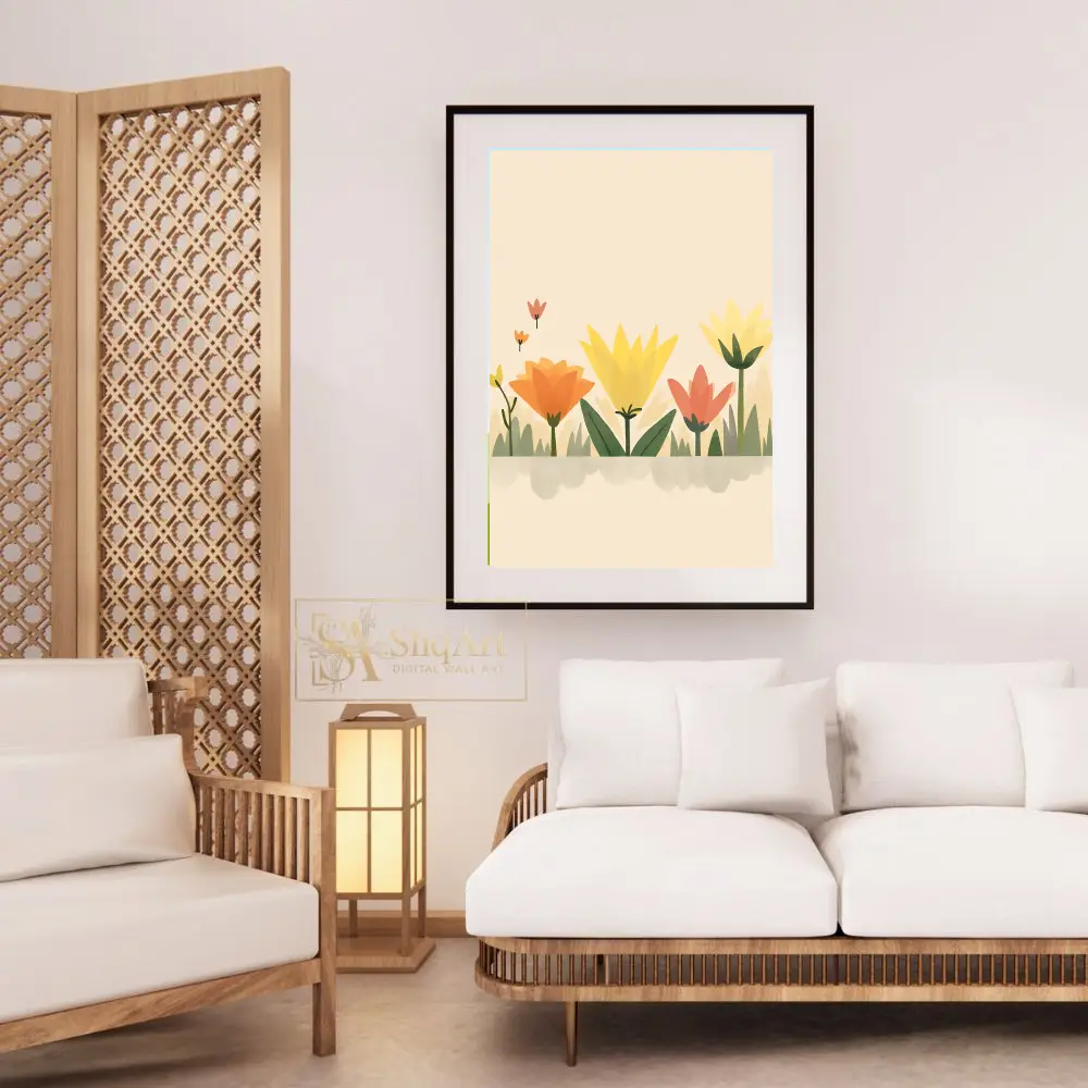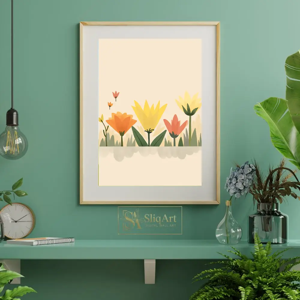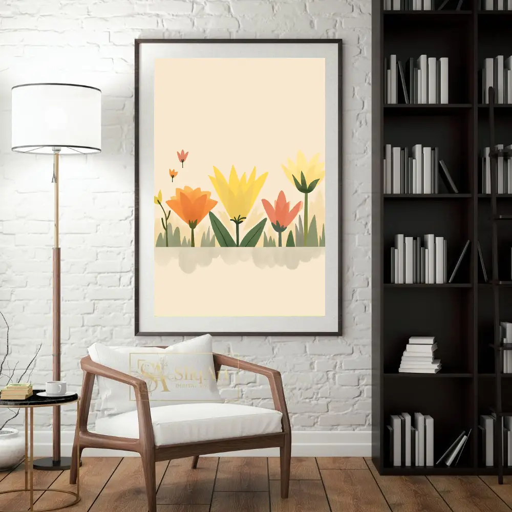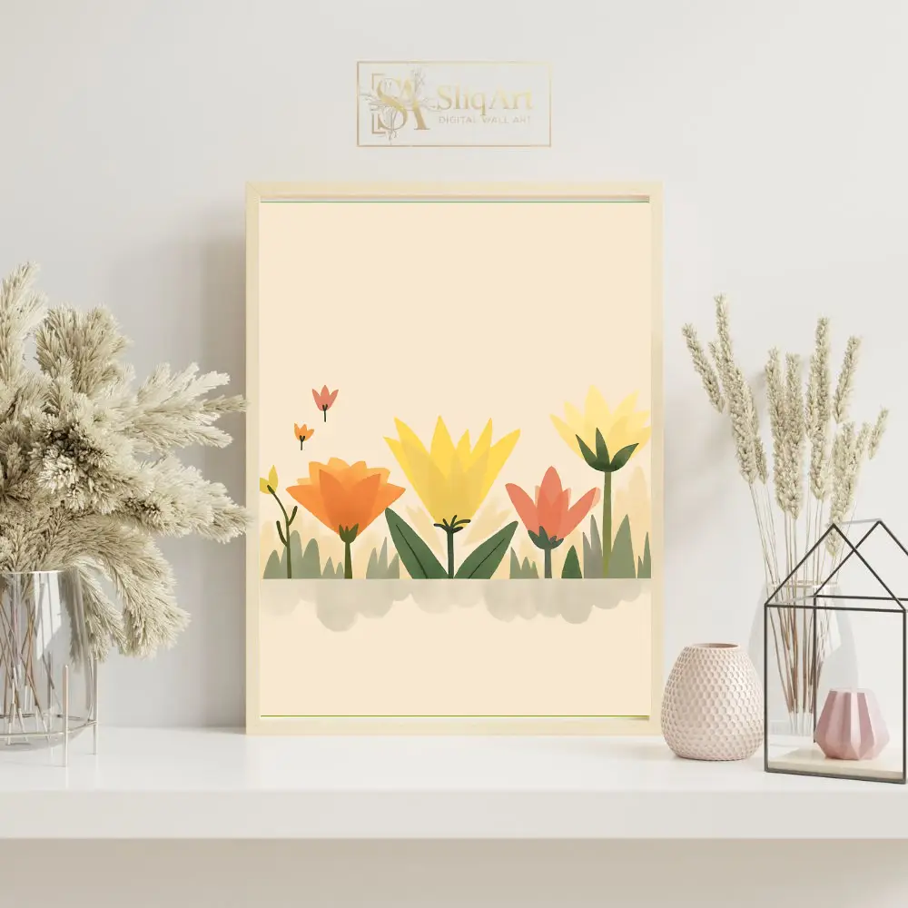 Bring the quiet beauty of a blooming garden indoors with this minimalist floral illustration. Featuring a row of stylized wildflowers in warm shades of amber, sun-yellow, and soft coral, this piece captures a serene meadow atmosphere.