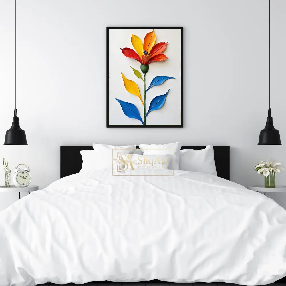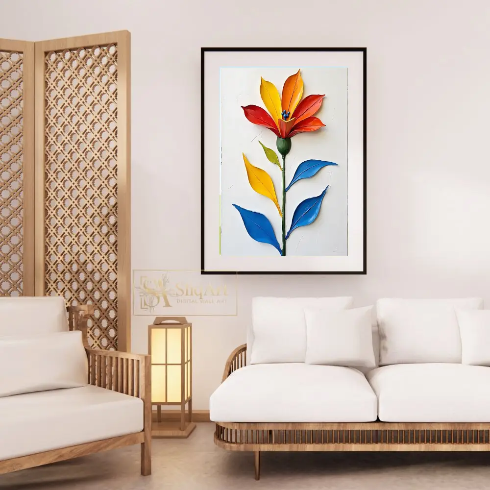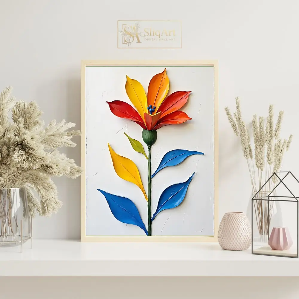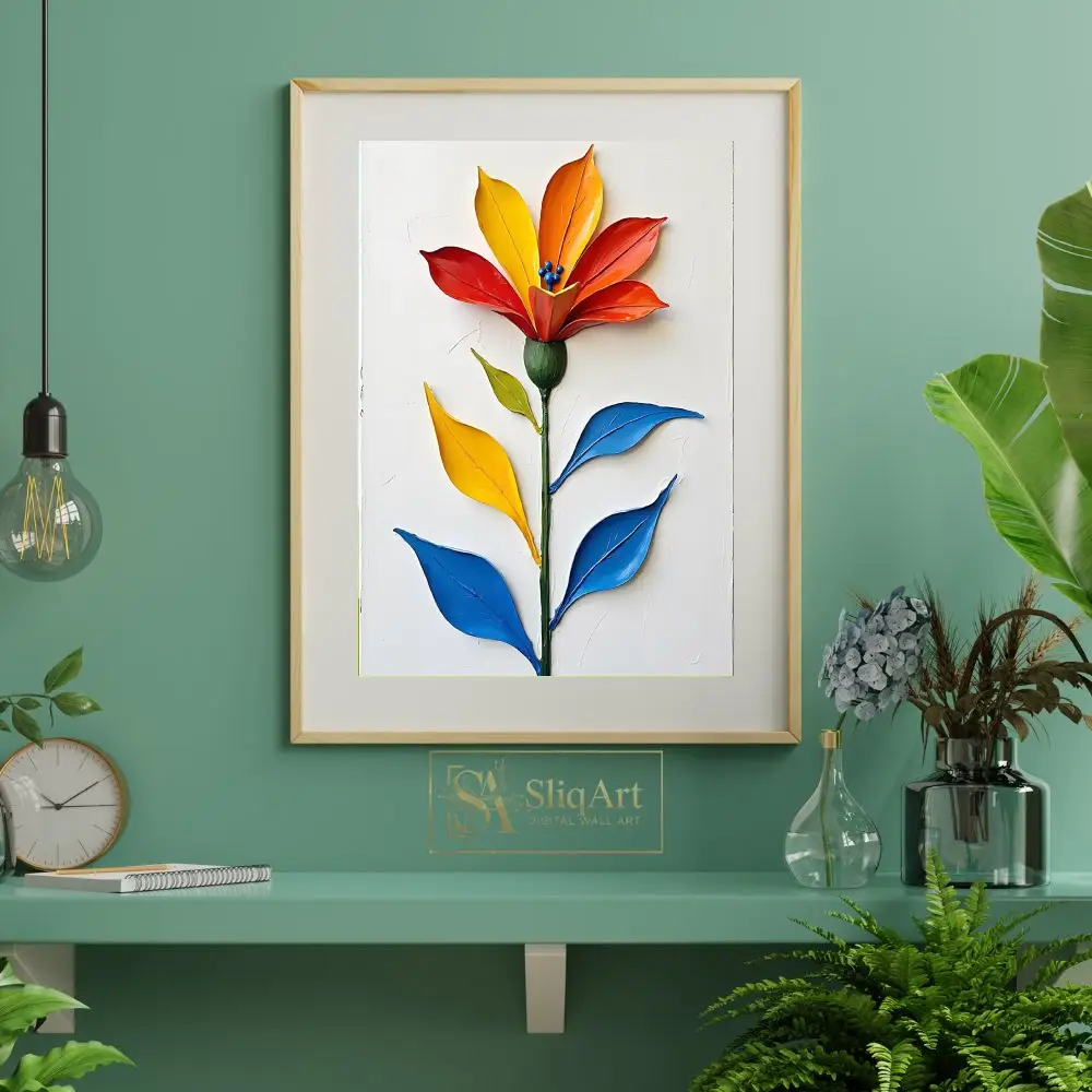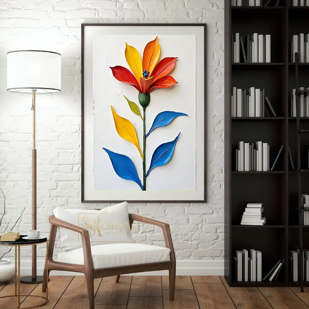 Elevate your interior with this stunning 3D impasto floral masterpiece. Featuring a single, majestic flower rendered in bold, sculpted strokes of fiery red, sunny yellow, and deep orange, this piece creates an immediate visual impact.