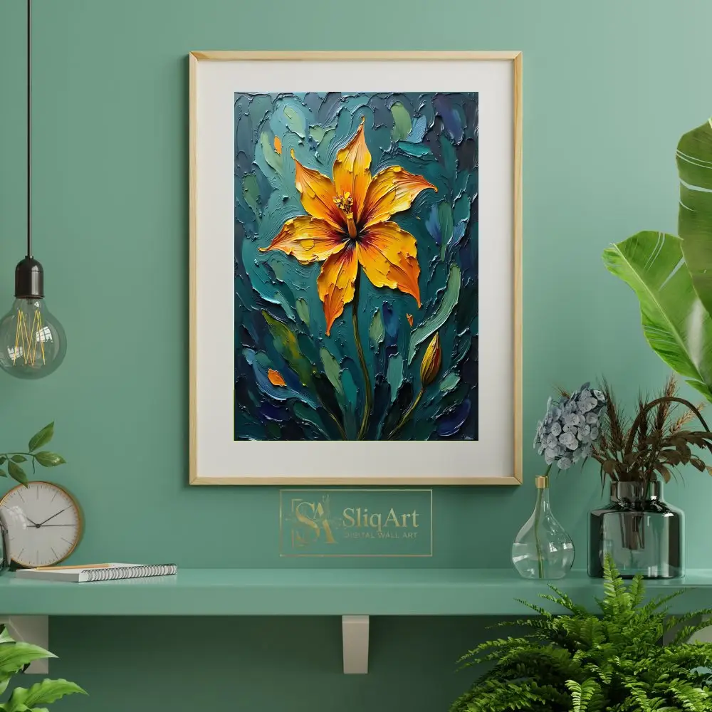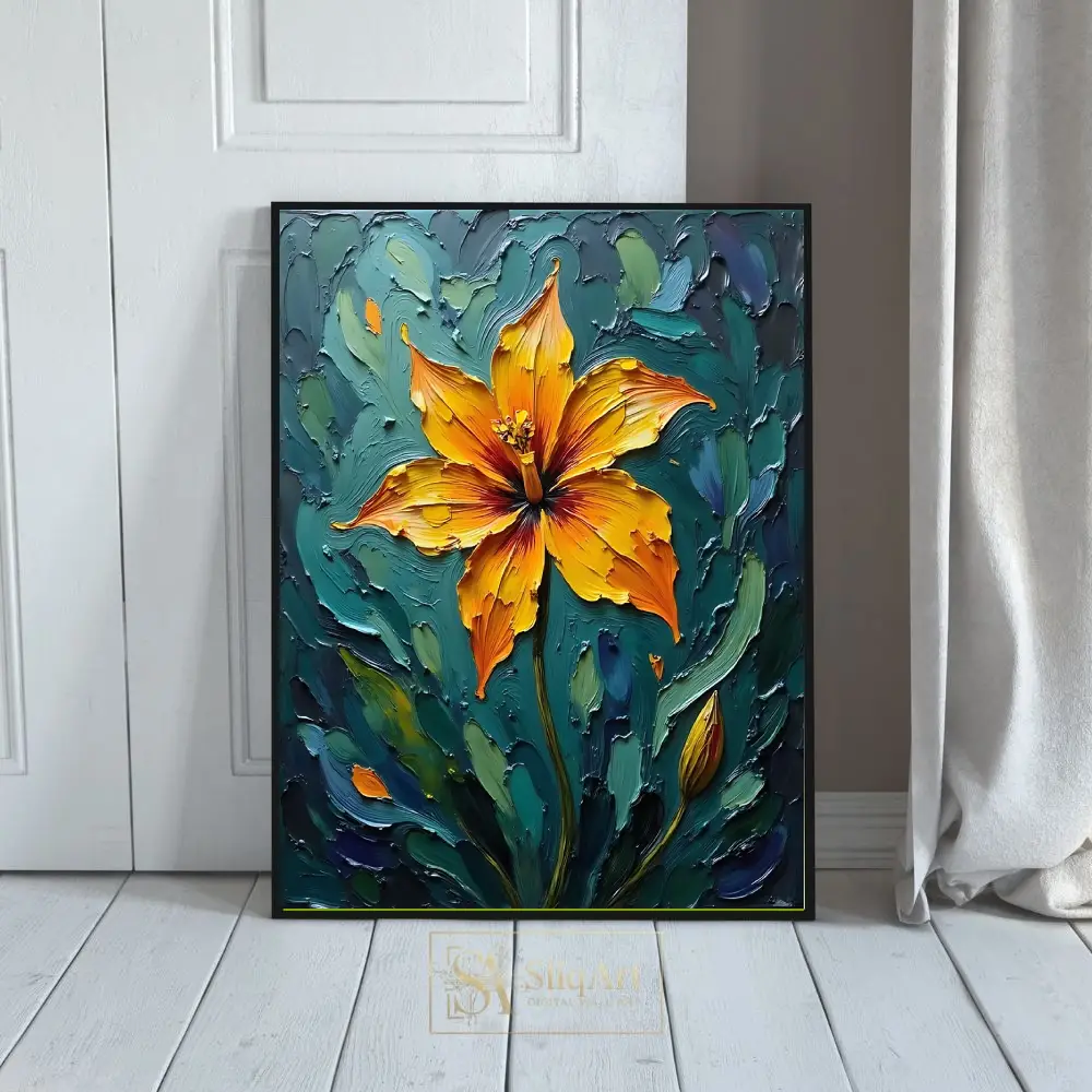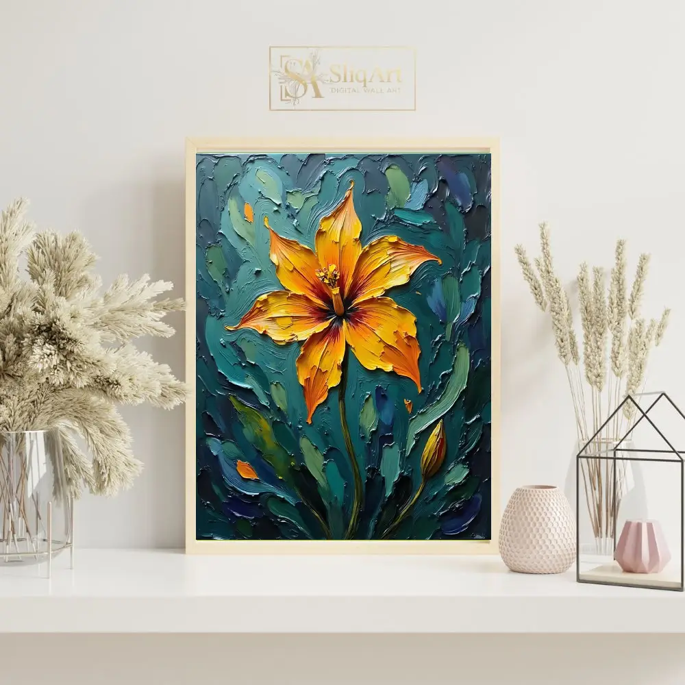 Add a bold statement to your decor with this striking impasto floral painting. The artwork features a radiant orange and yellow lily, rendered with thick, expressive palette knife strokes that create a tangible sense of depth and energy.
