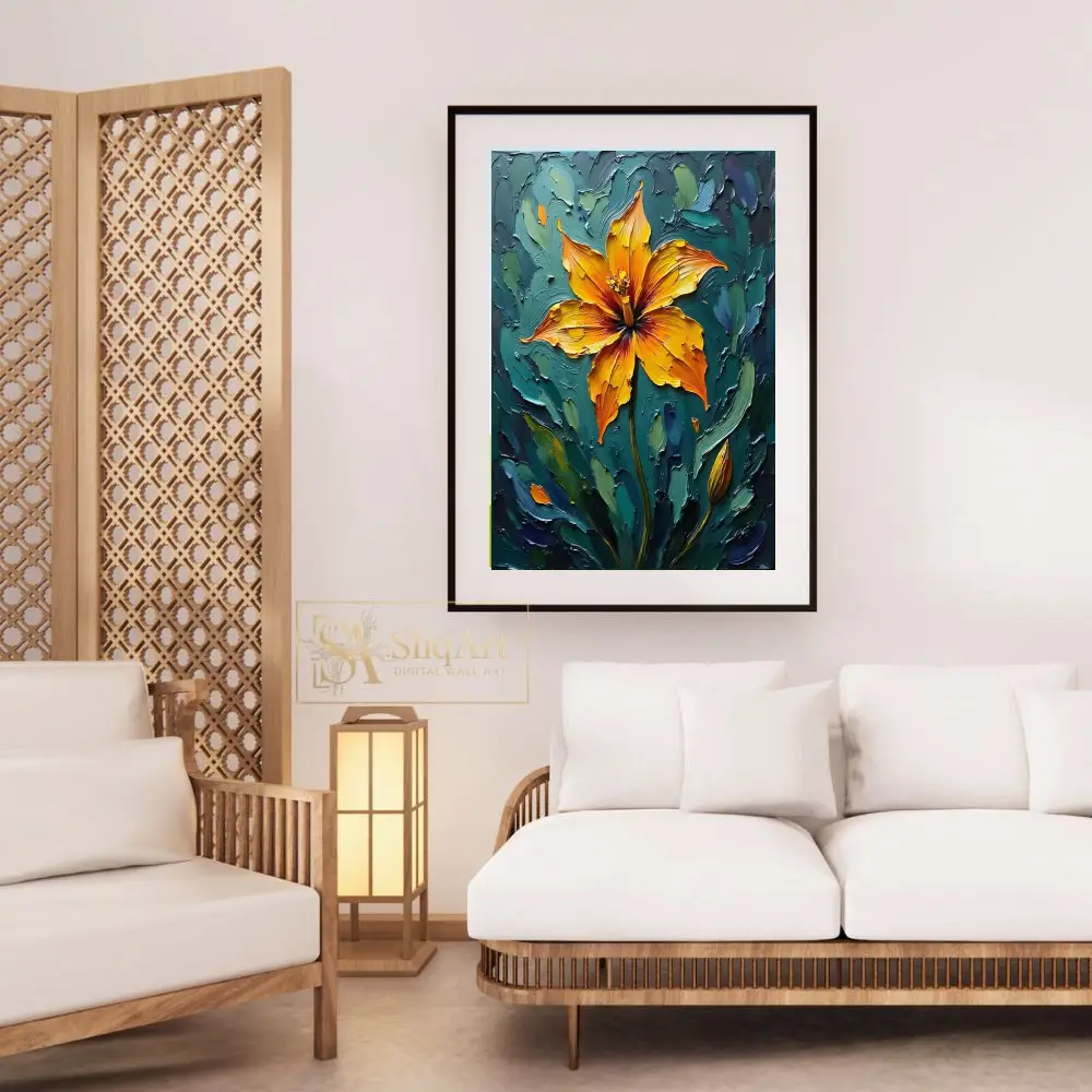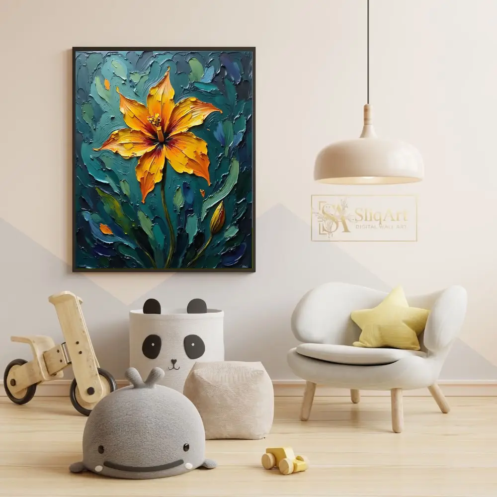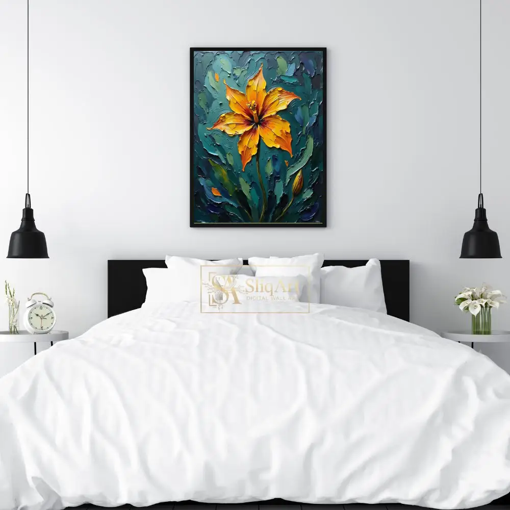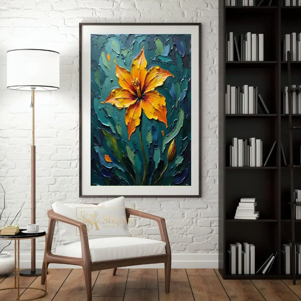 Add a bold statement to your decor with this striking impasto floral painting. The artwork features a radiant orange and yellow lily, rendered with thick, expressive palette knife strokes that create a tangible sense of depth and energy.