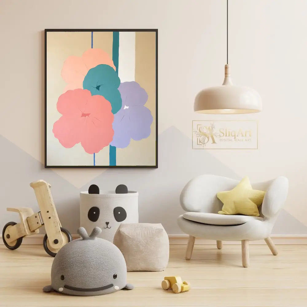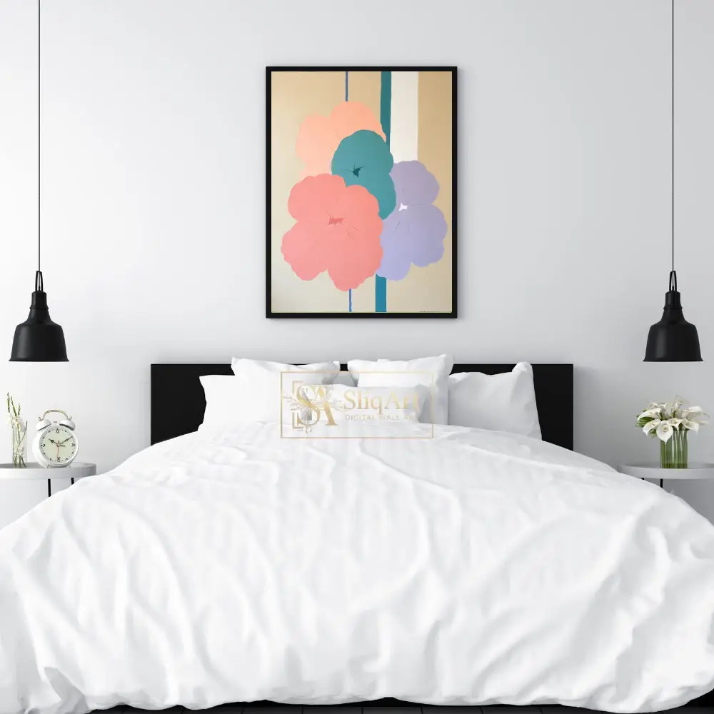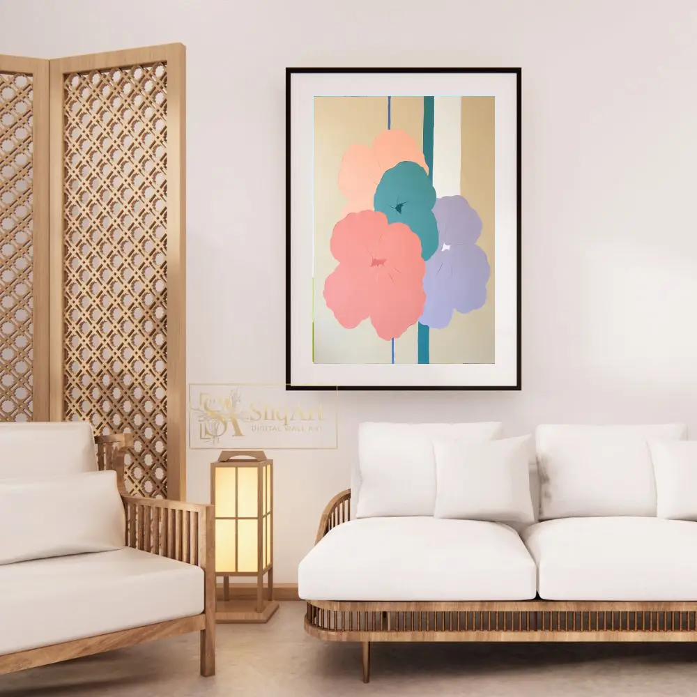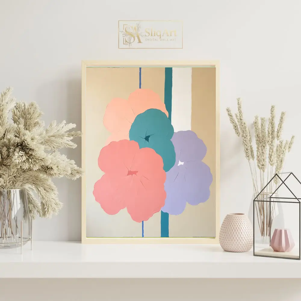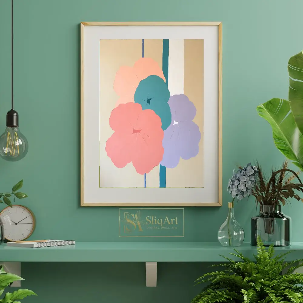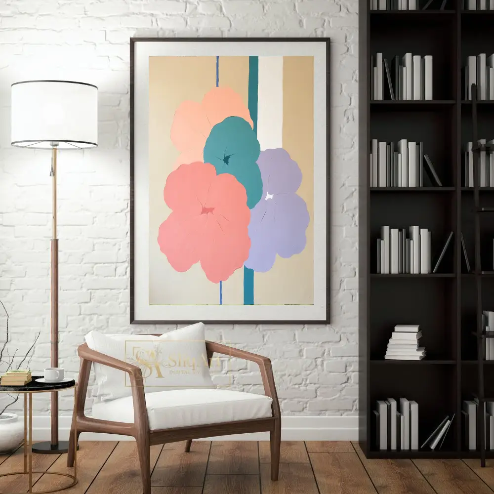 The rich textures and dynamic interplay of light against the cool blue and green background create a sense of depth and movement, making it a captivating addition to any modern interior. Each petal is rendered with intense color, bringing a botanical elegance and a burst of natural warmth to your space.