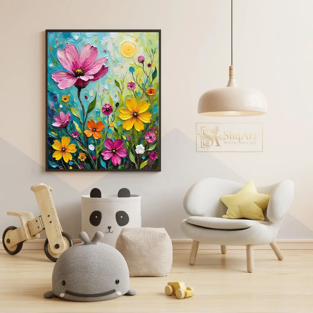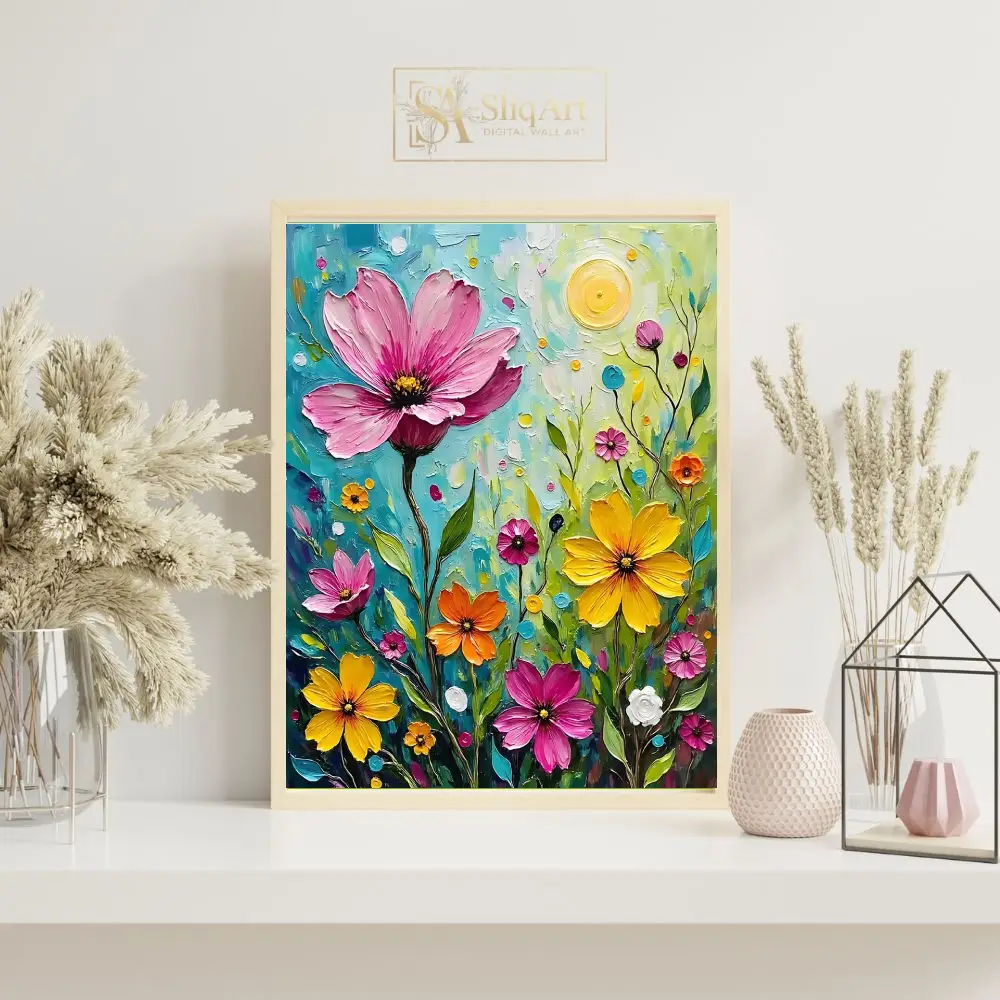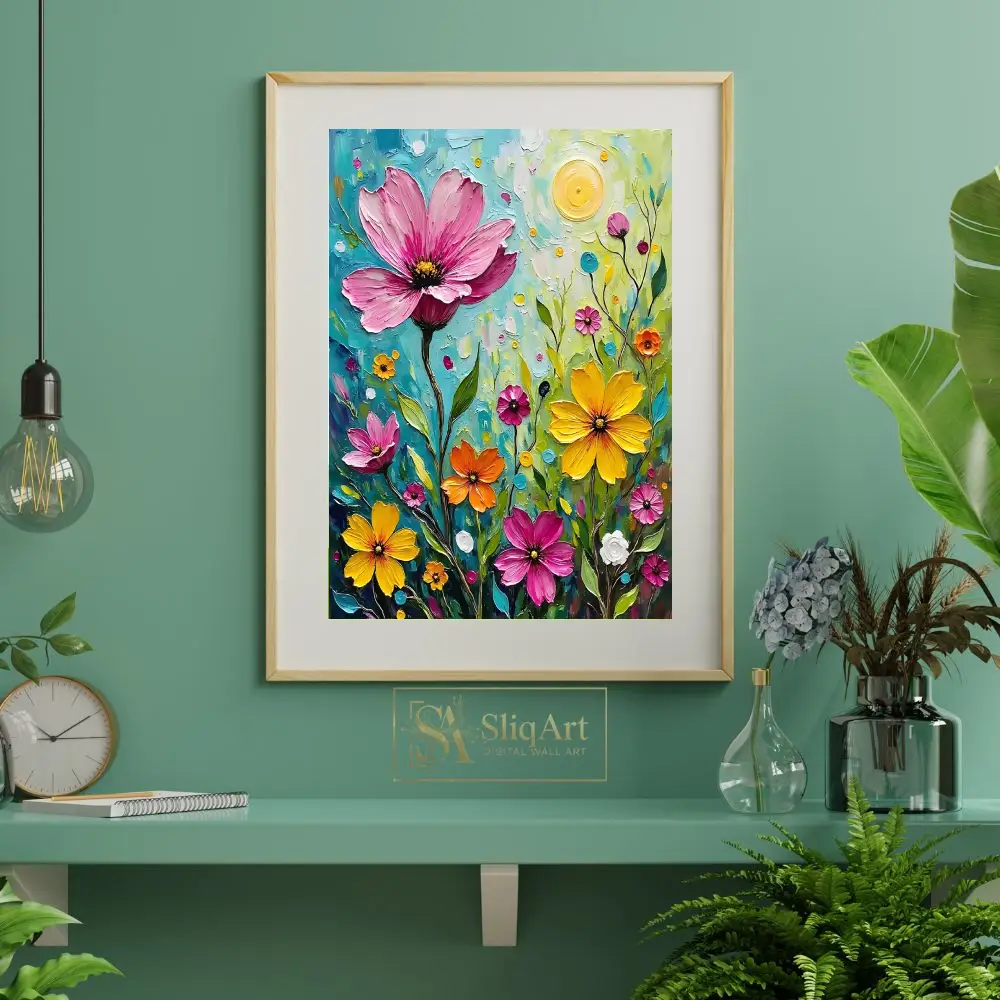 Enhance your living space with this exquisite Impressionist-style botanical art piece. The artwork showcases a potted plant with elegantly curved, pale blue-green leaves and a vibrant maroon floral crown.