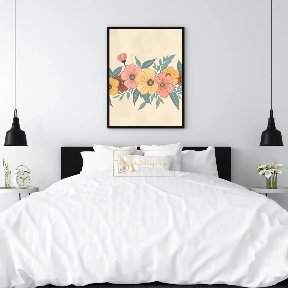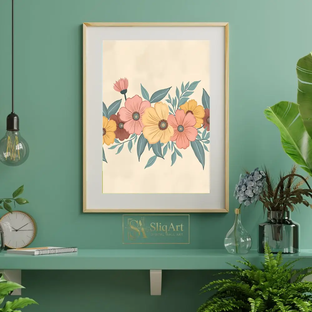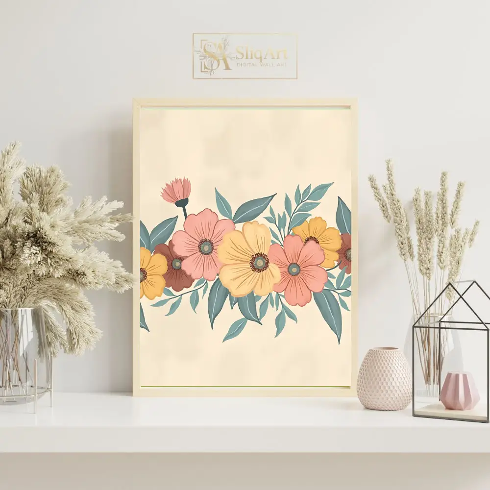 Enhance your home with the timeless elegance of this vintage-inspired floral illustration. This piece features a horizontal garland of blooming wildflowers in a sophisticated palette of dusty peach, muted yellow, and earthy terracotta, complemented by soft sage green and teal foliage.