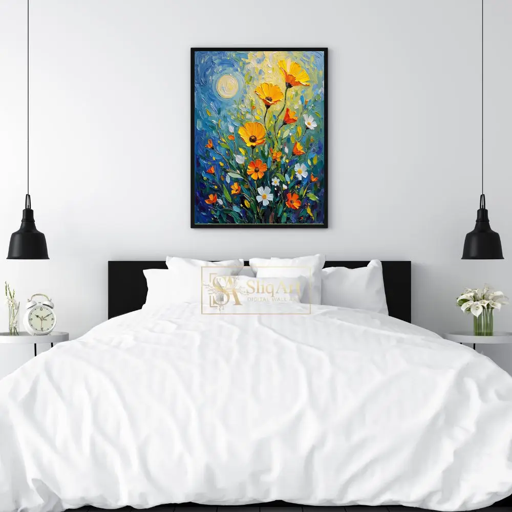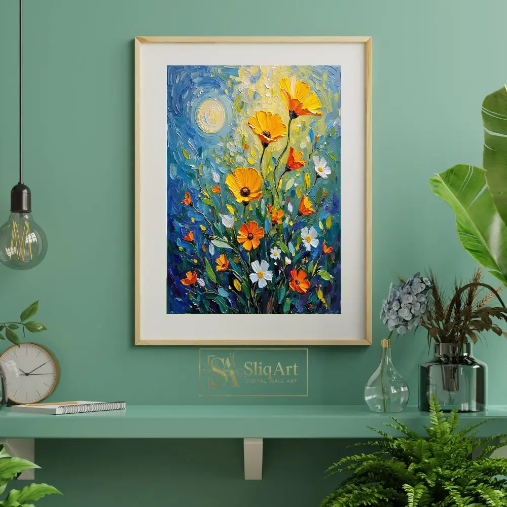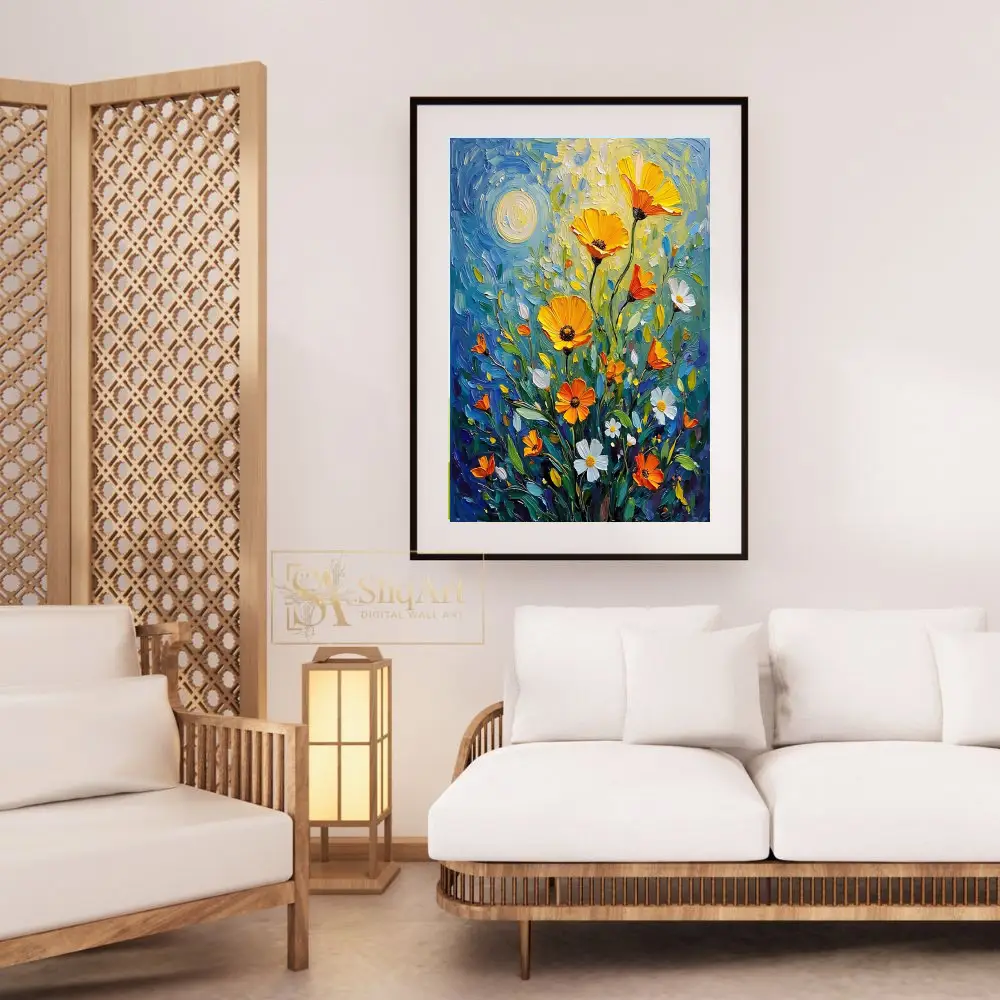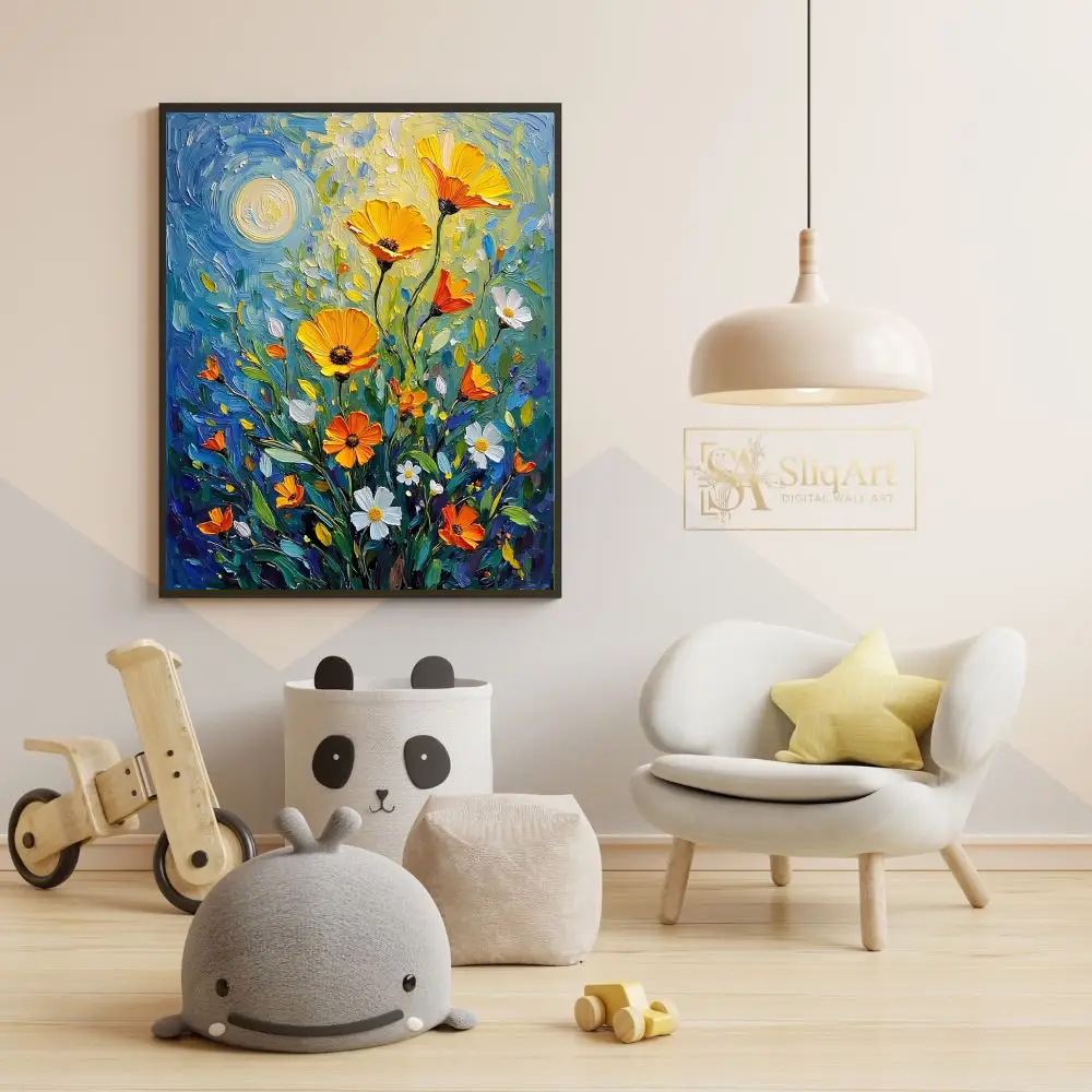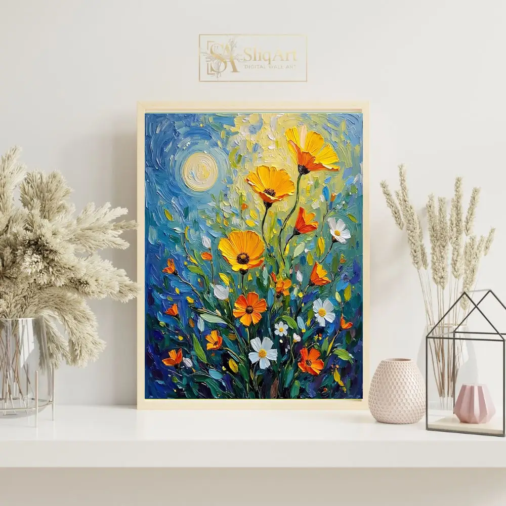 Infuse your space with the vibrant energy of a sun-drenched meadow. This stunning impasto-style painting features bold, textured brushstrokes that bring golden poppies and delicate white daisies to life.