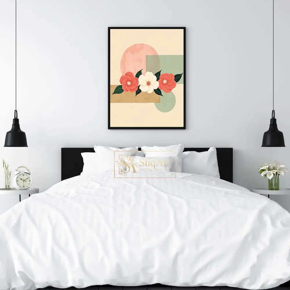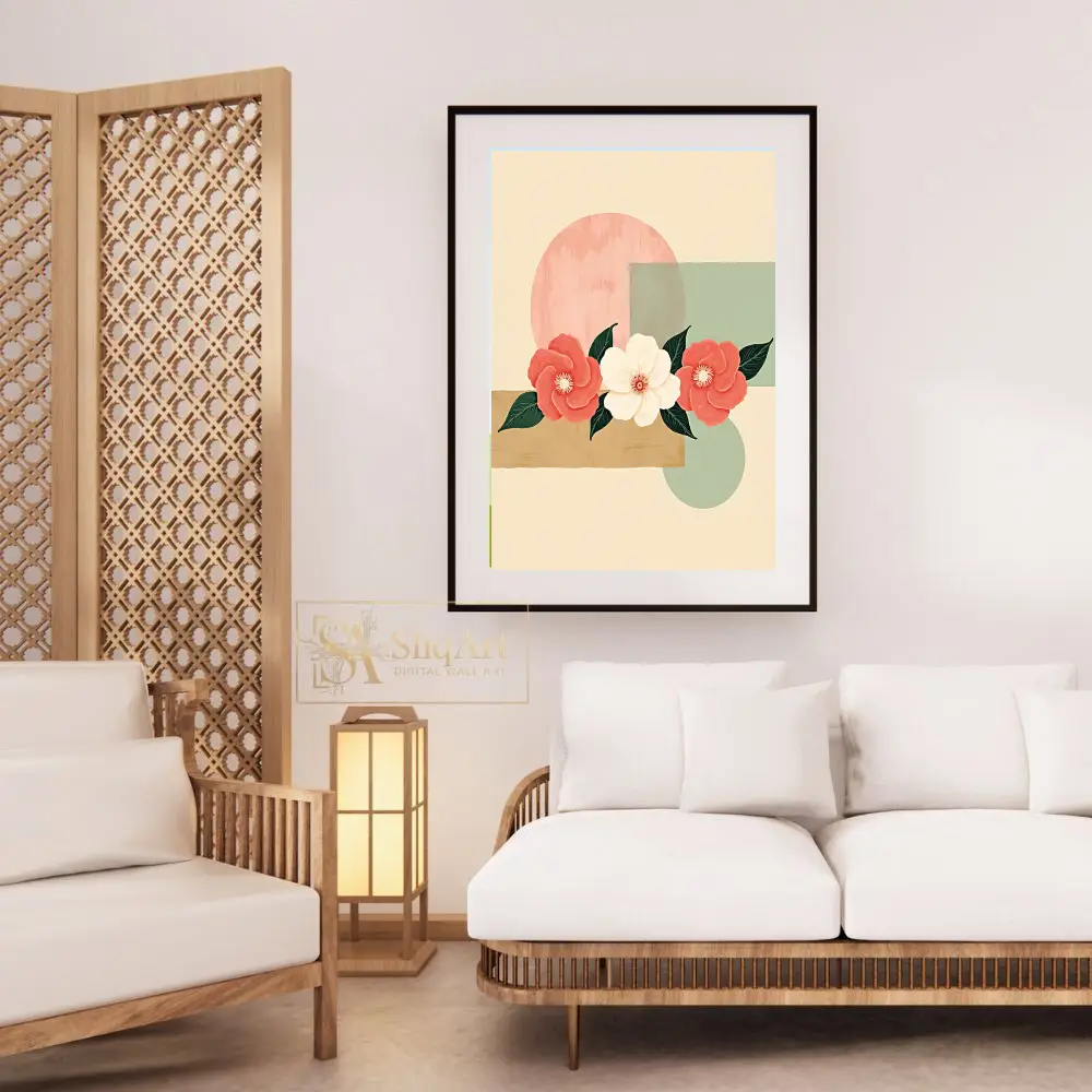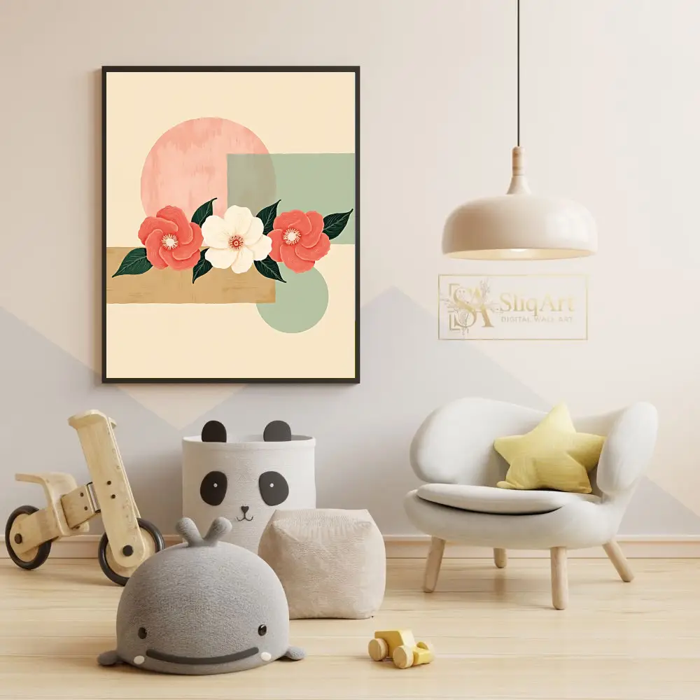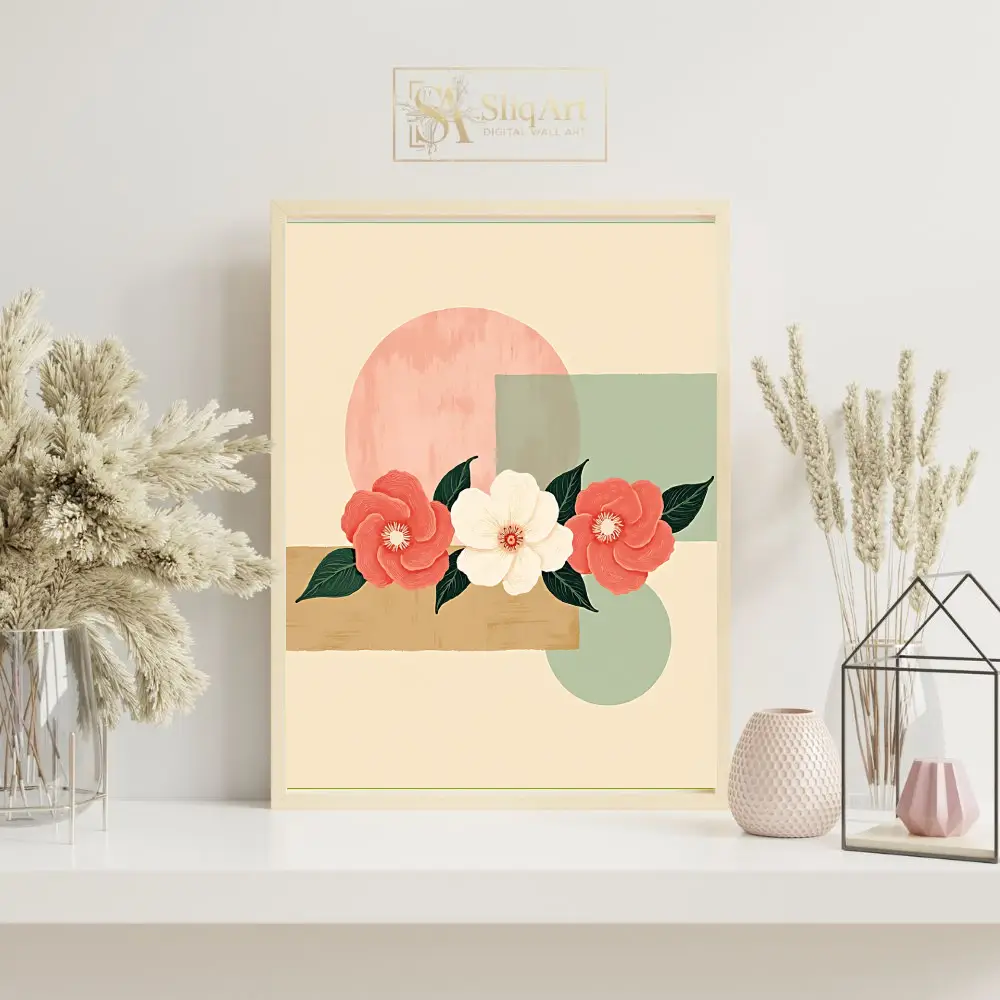 Enhance your living space with this sophisticated modern abstract floral art piece. Featuring three delicate blossoms in soft coral and cream, the composition is artfully balanced by layered geometric shapes in mint green, peach, and textured gold.