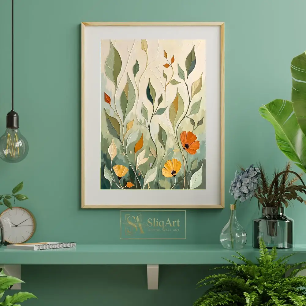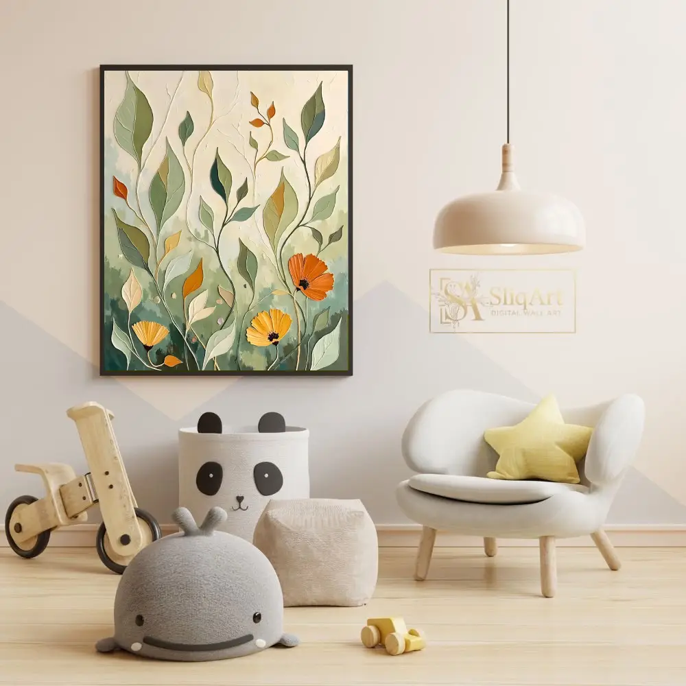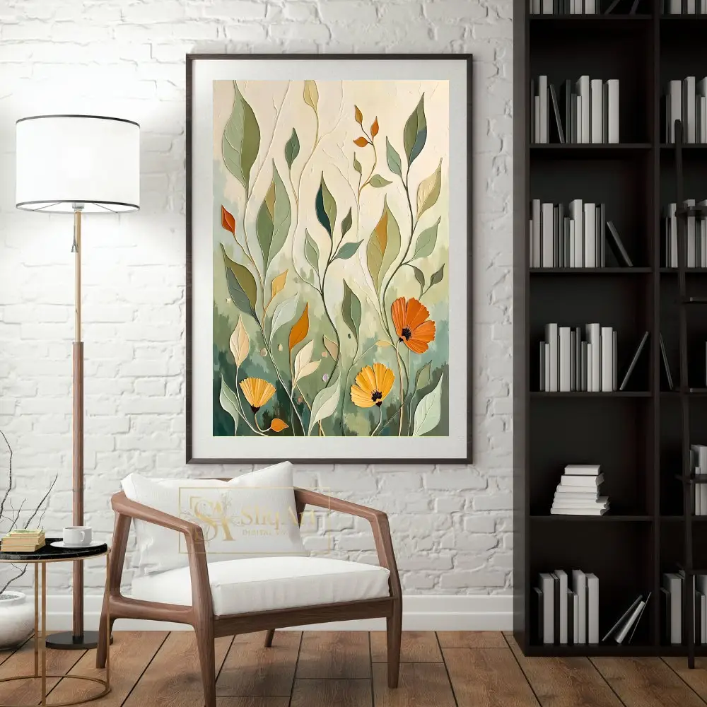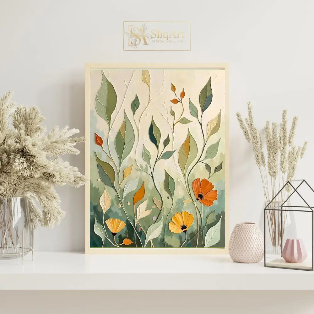 Muted orange and mustard yellow wildflowers provide a warm, organic contrast against a soft cream and green background. The tactile nature of the artwork creates a sophisticated, hand-painted look that elevates any modern or bohemian interior.