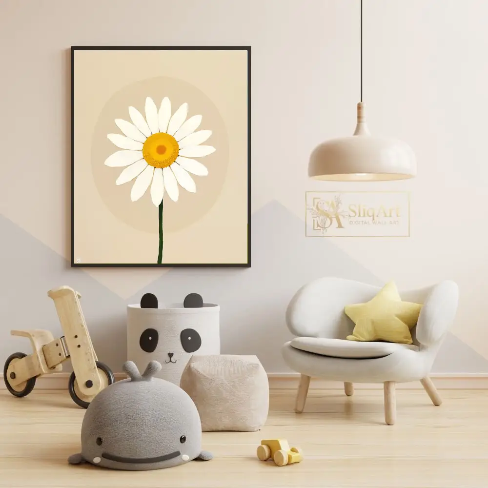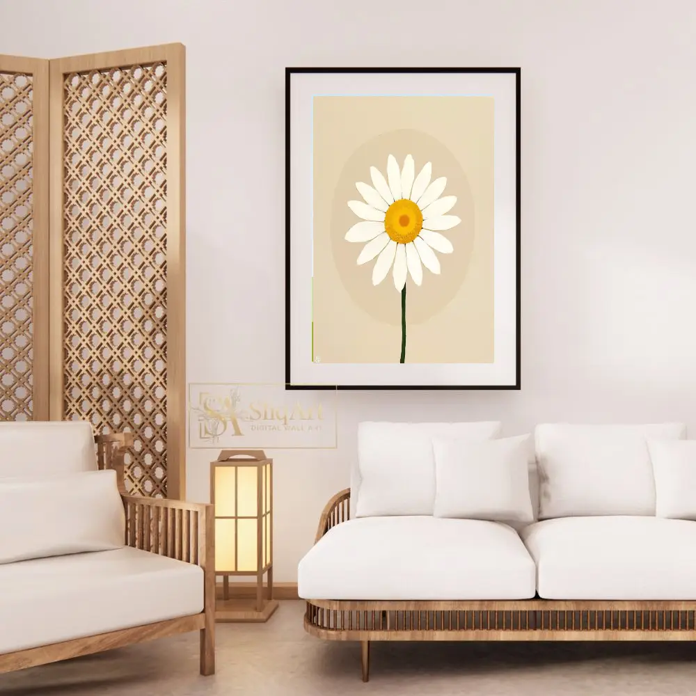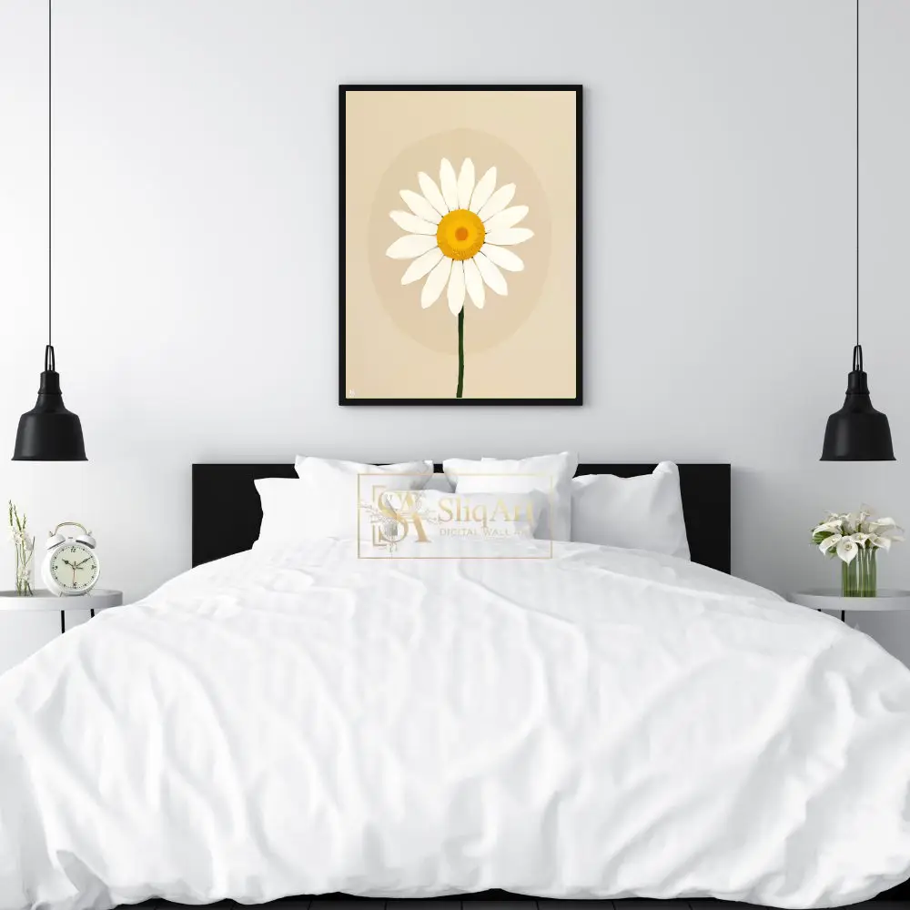 Bring a sense of serene simplicity to your home with this minimalist white daisy illustration. Featuring a crisp white flower with a vibrant yellow center set against a soothing beige background, this piece embodies modern botanical art.
