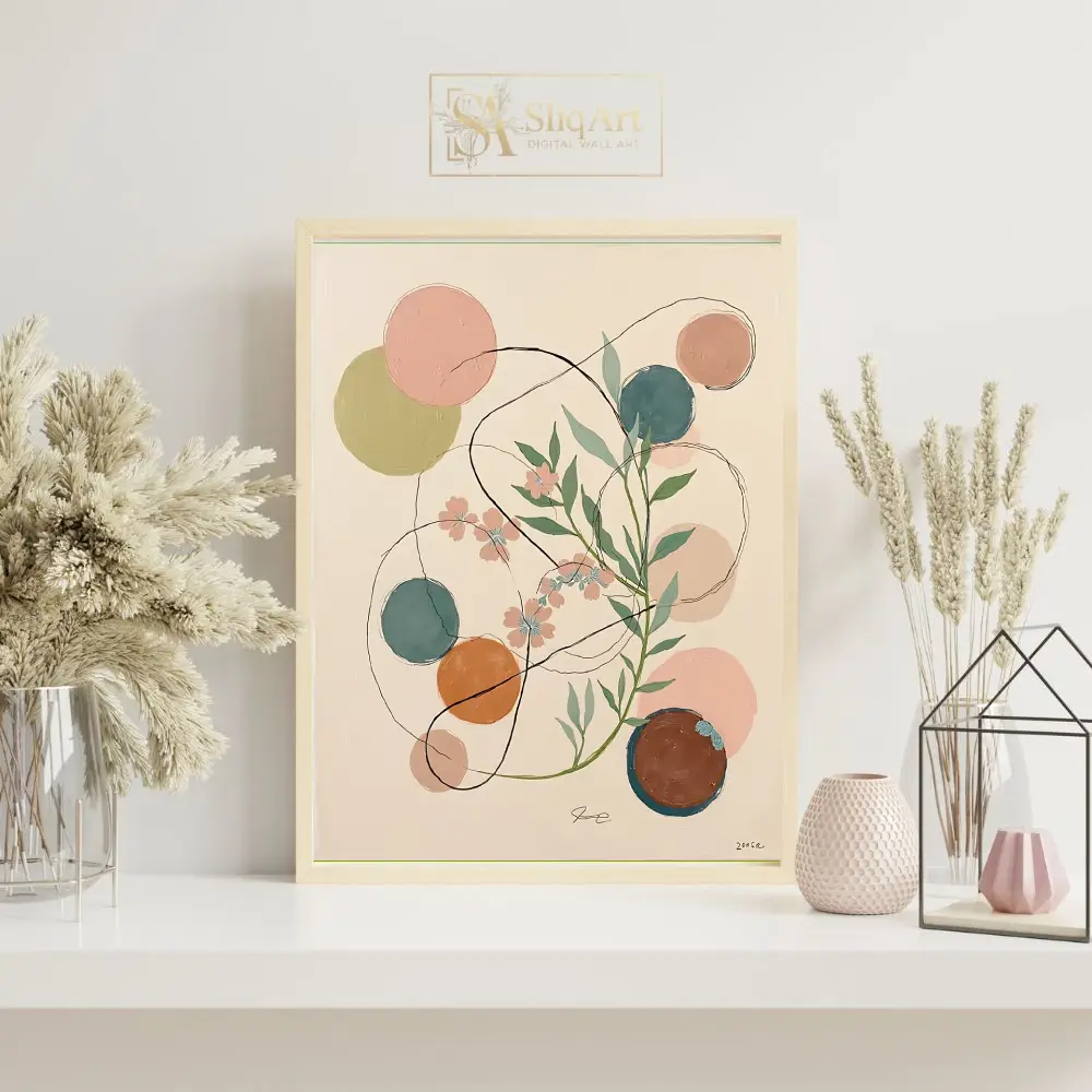 This captivating abstract piece seamlessly blends organic botanical elements with modern geometric forms. Featuring a delicate arrangement of sage green leaves and soft pink blossoms, the composition is anchored by a series of earthy-toned circles in terracotta, teal, and muted olive.
