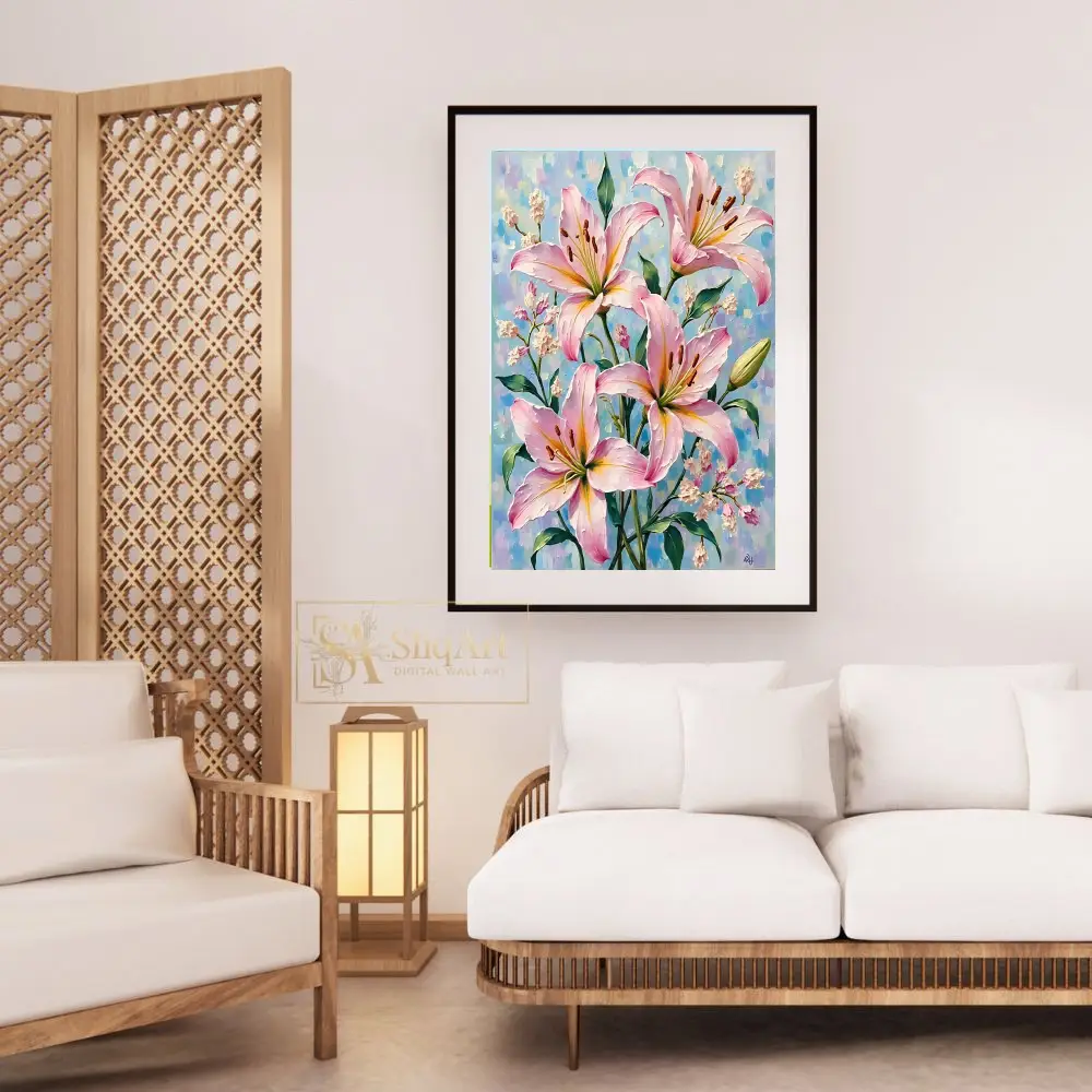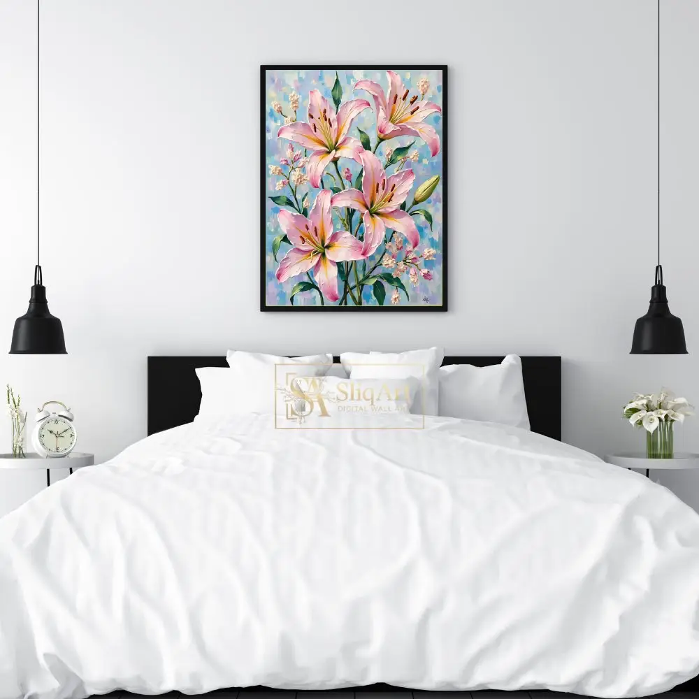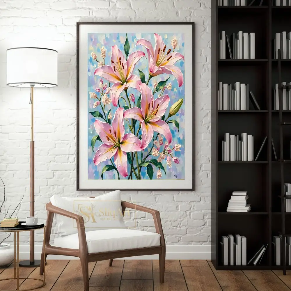 Set against a dreamy backdrop of soft blues and lavenders, the lilies radiate a sense of calm and elegance. The intricate details of the petals, highlighted with touches of golden yellow, contrast beautifully with the deep green foliage and dainty accent blossoms. This piece is perfect for adding a touch of botanical sophistication and serene color to any modern interior.