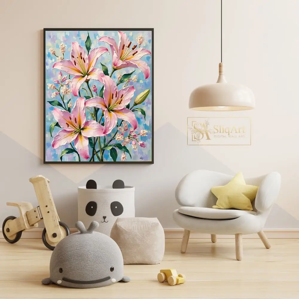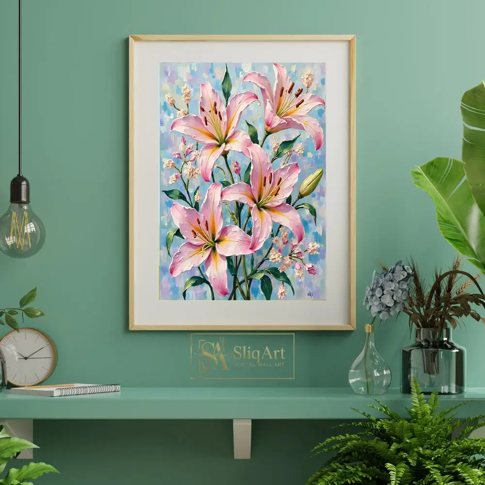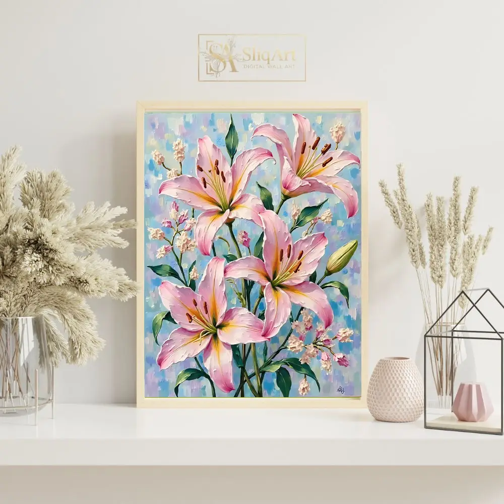 A captivating textured oil painting of blooming pink lilies, blending soft pastel tones with bold impasto techniques for a modern botanical feel.