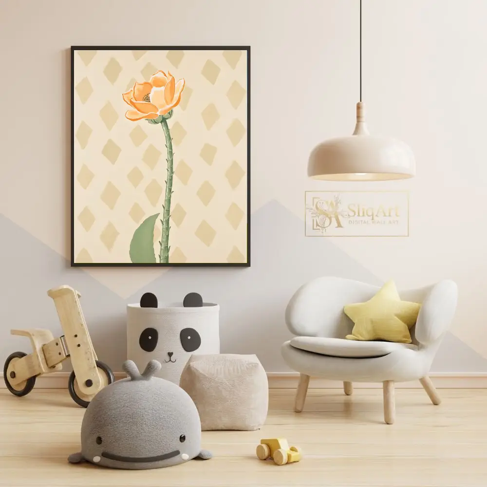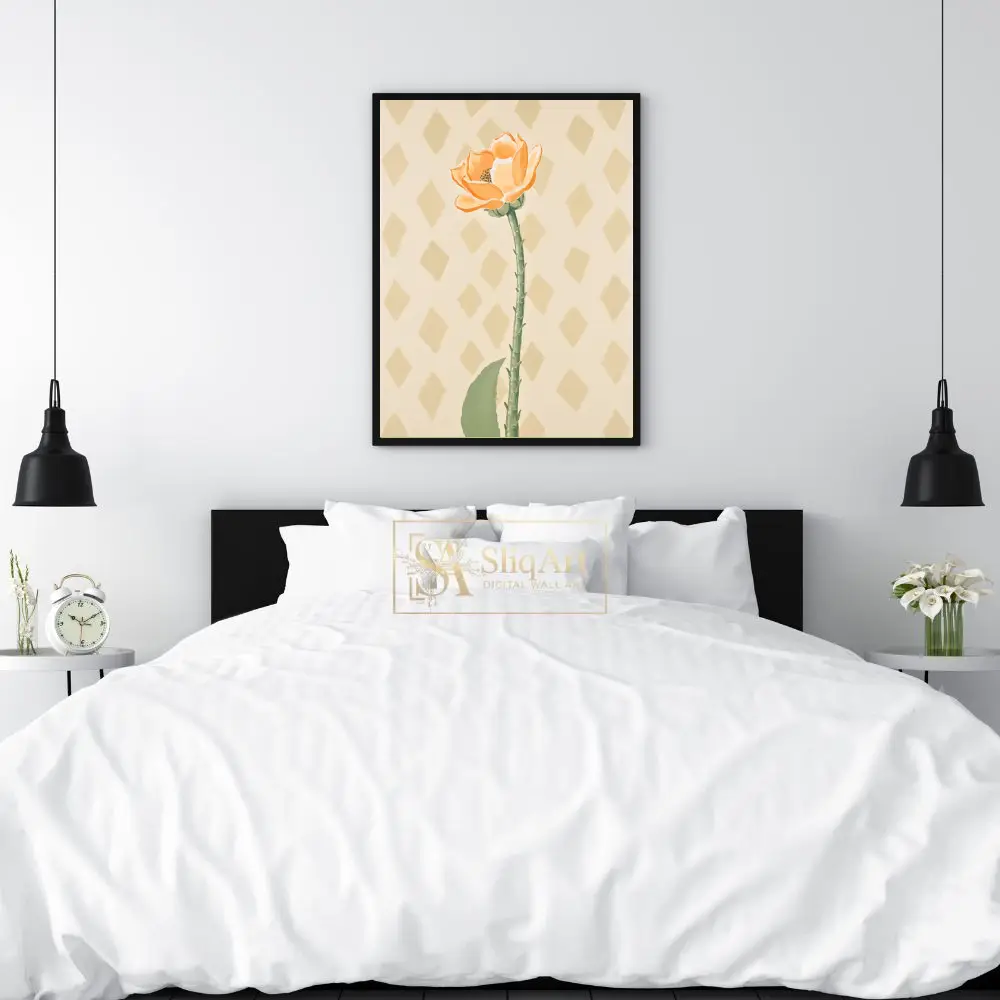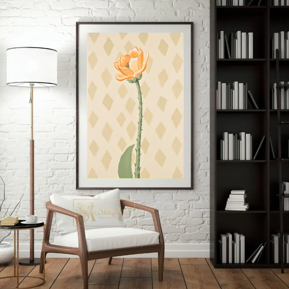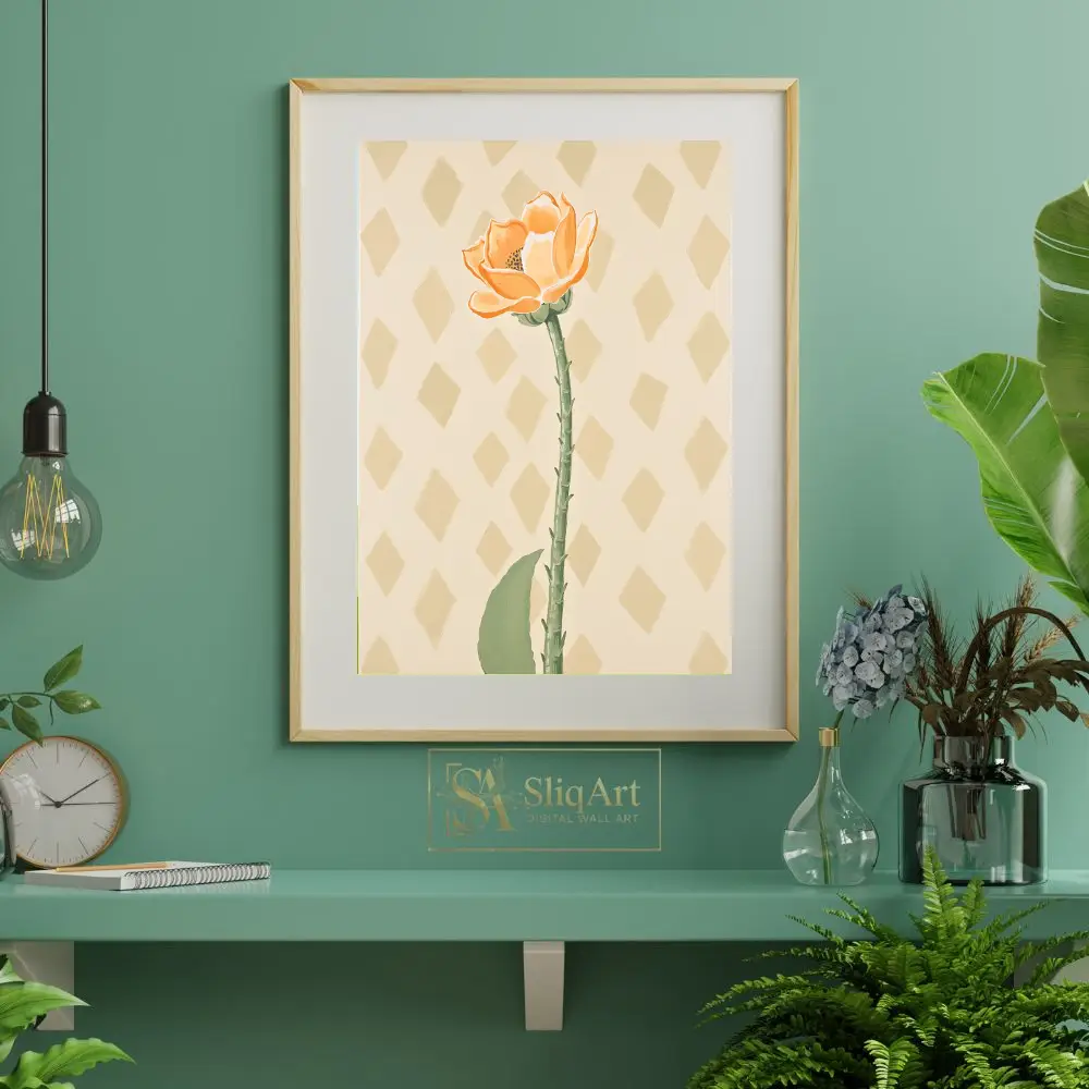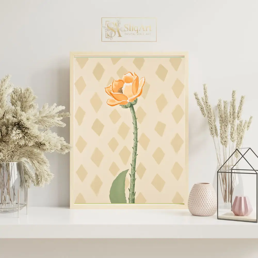 Enhance your home’s ambiance with this elegant minimalist botanical print. The artwork showcases a single, beautifully rendered orange flower on a tall, detailed green stem, set against a subtle diamond-patterned cream background.