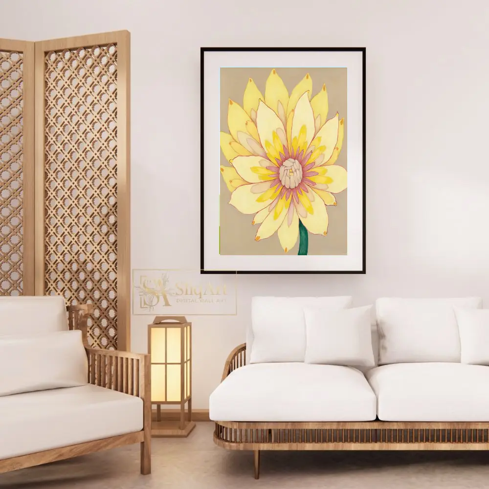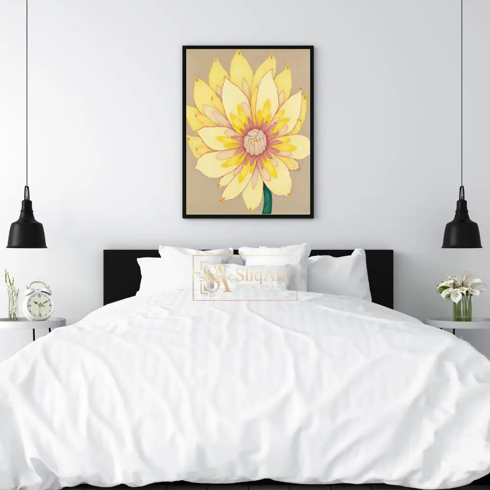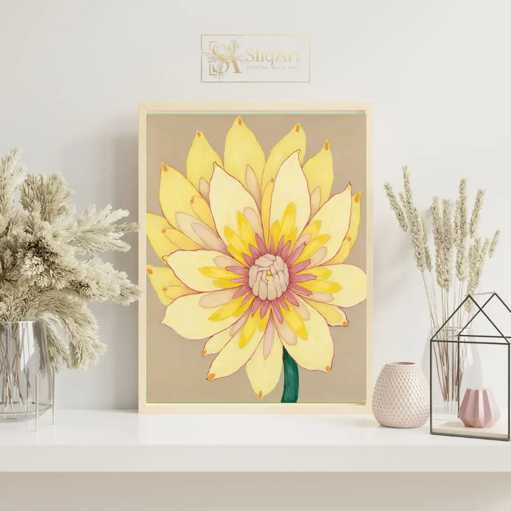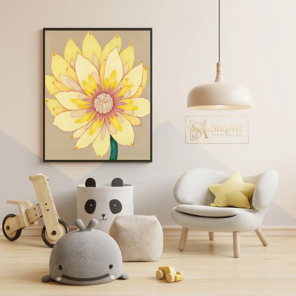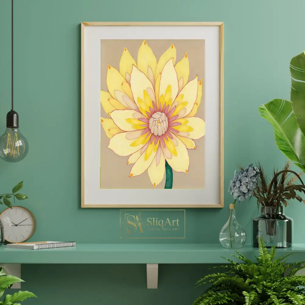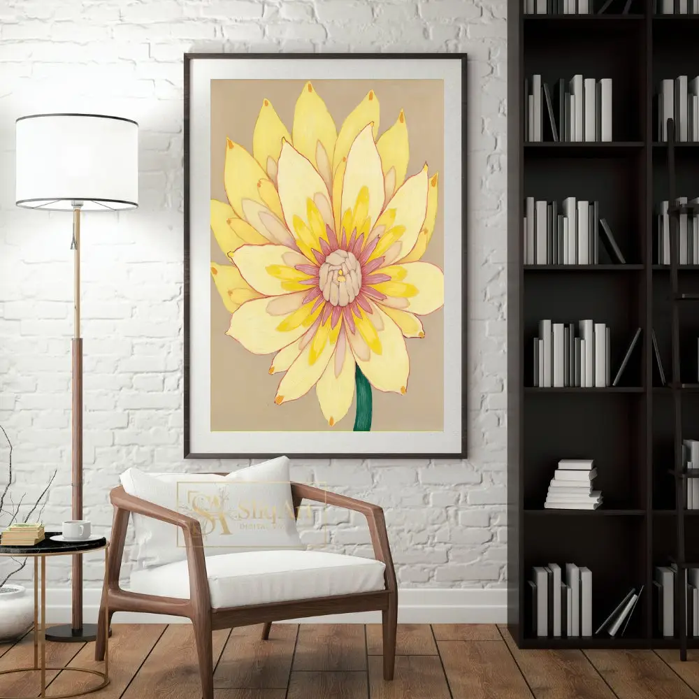 Add a burst of sunshine to your home with this stunning contemporary floral painting. This piece features a vibrant yellow flower in full bloom, meticulously detailed with layers of creamy petals that transition into a delicate pink and magenta center.