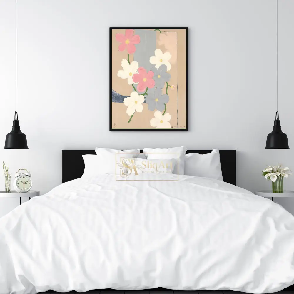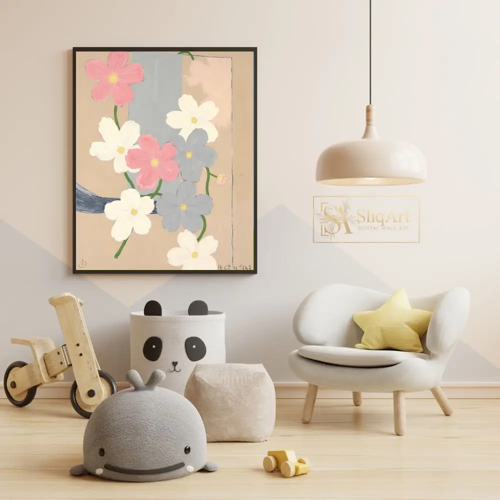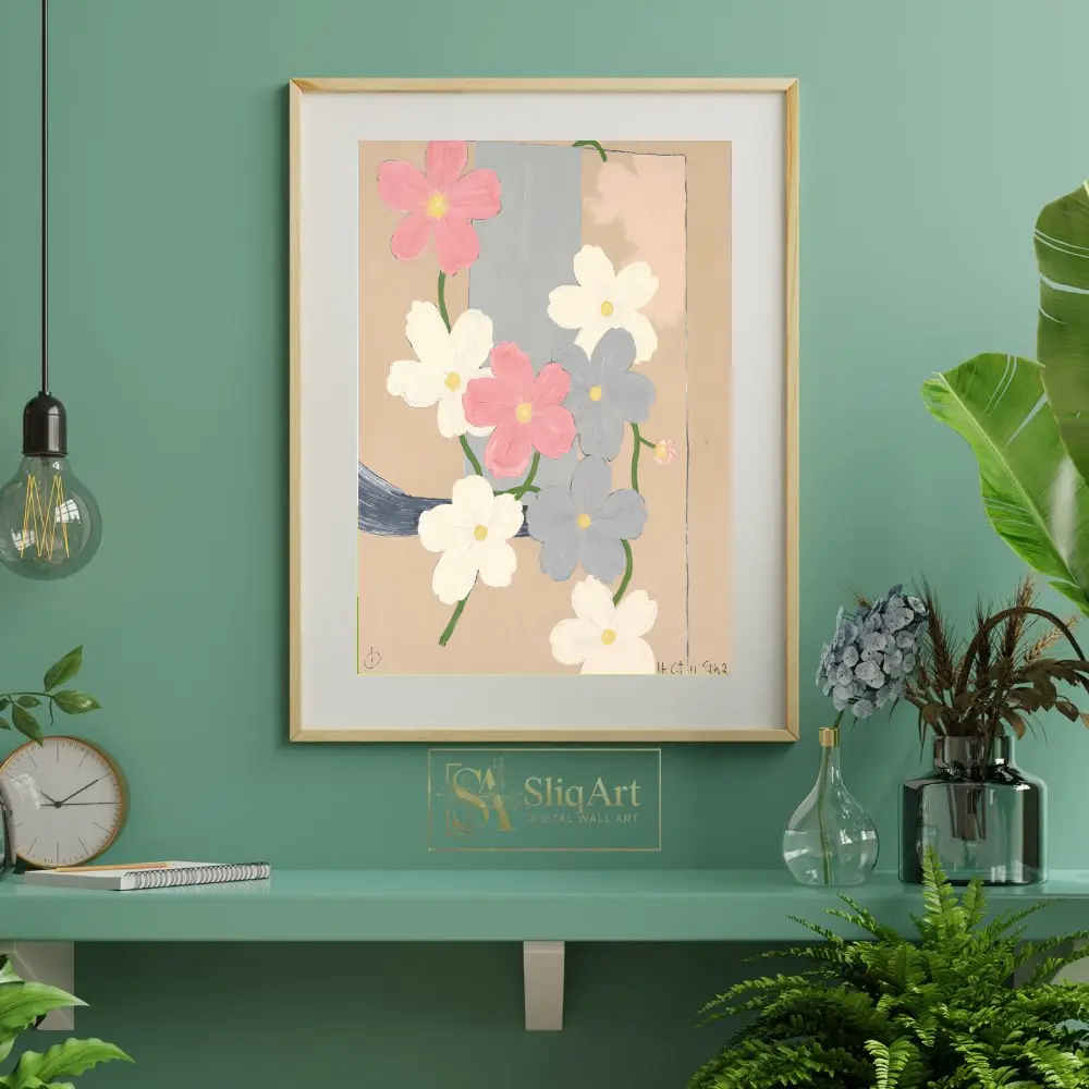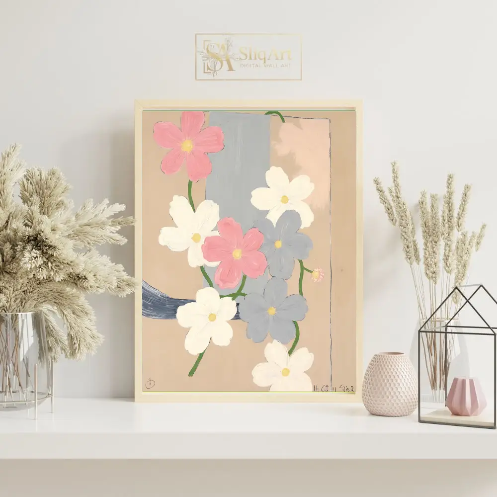 This contemporary floral art piece features a cluster of delicate cosmos-like flowers in a soft palette of dusty pink, crisp white, and muted slate blue. Set against a warm, sandy beige background with a structural vertical blue-grey band, the composition balances organic botanical shapes with geometric simplicity.