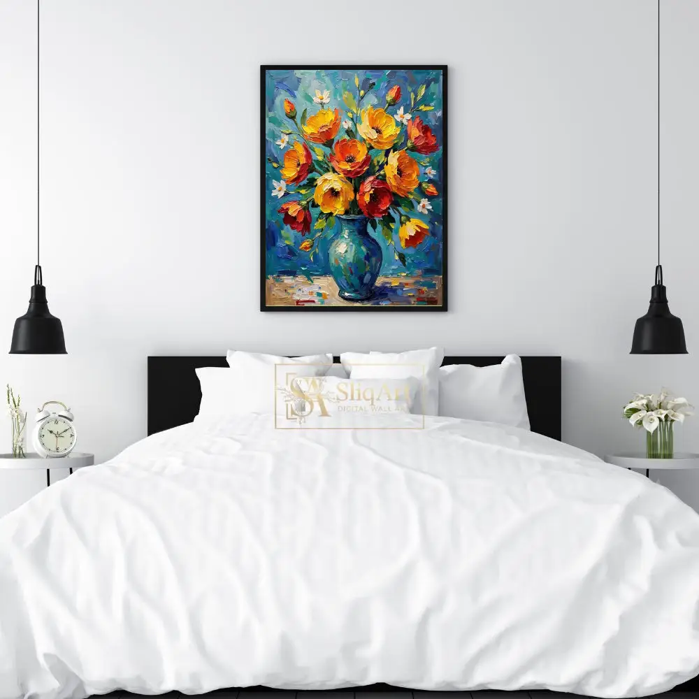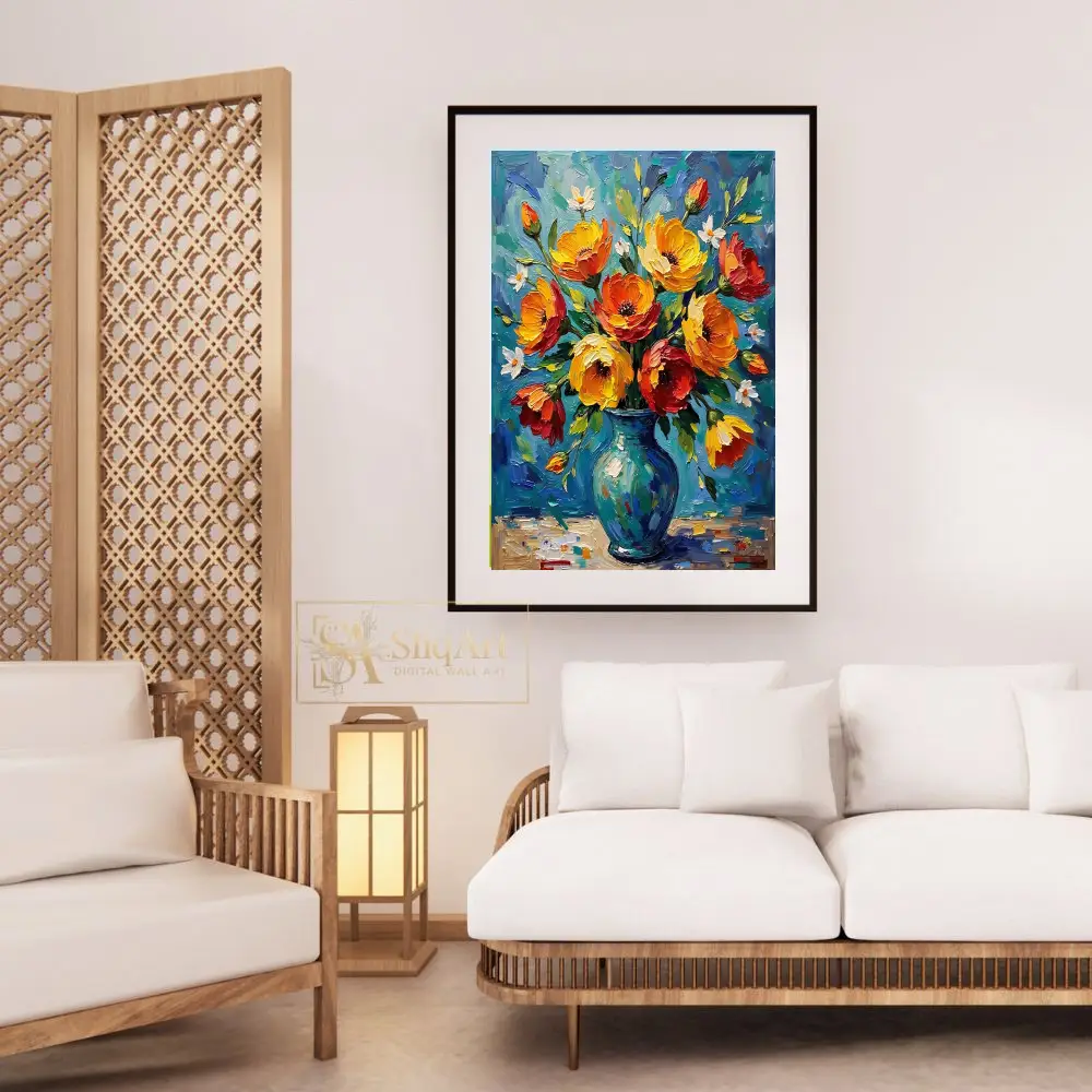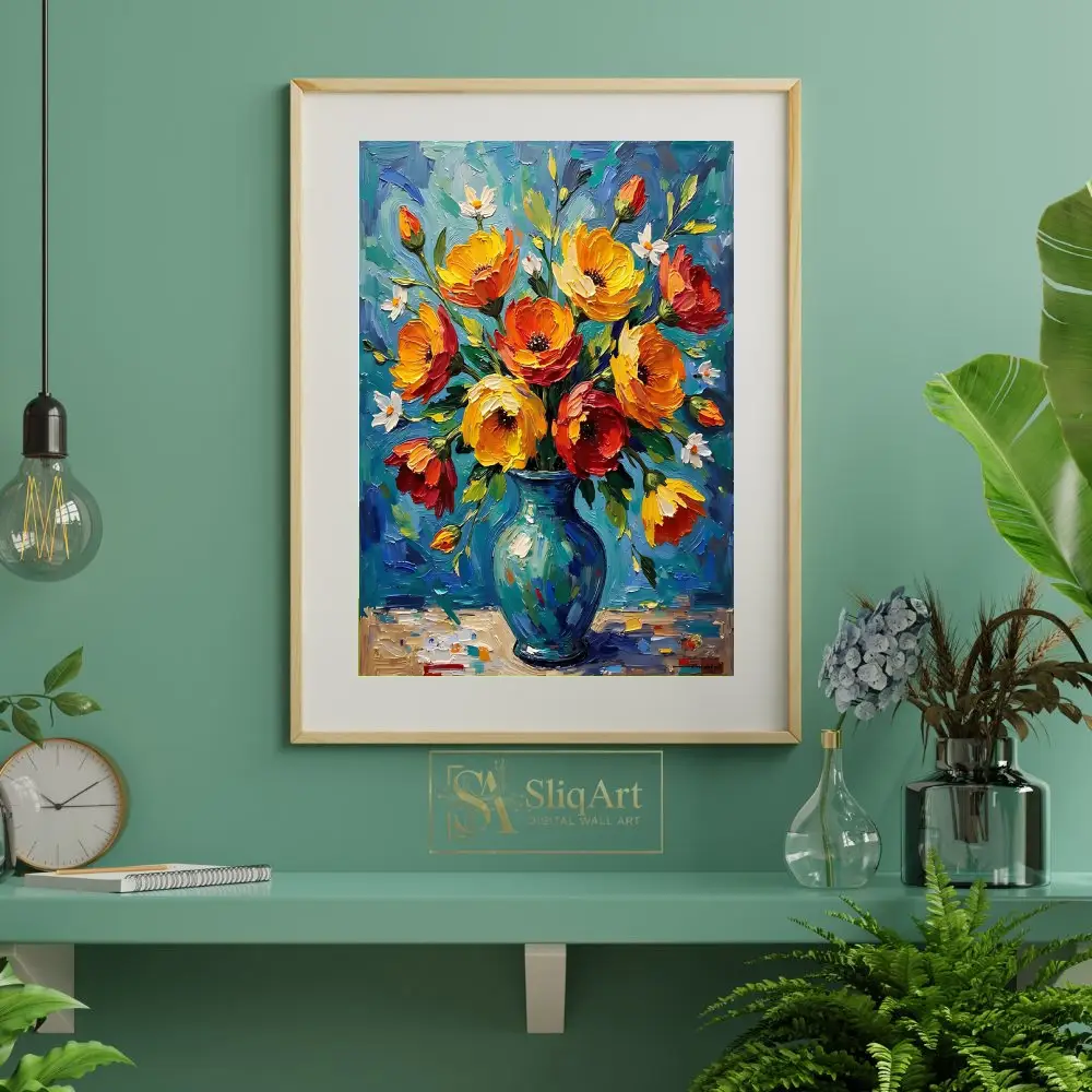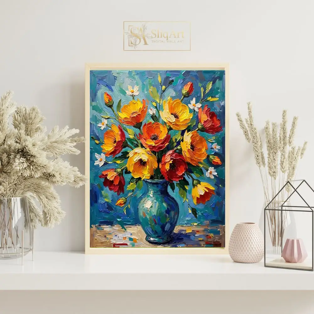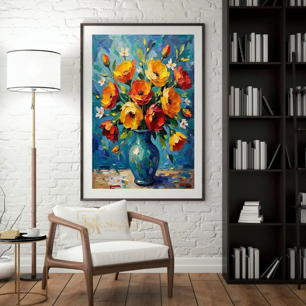 Add a burst of energy and texture to your walls with this breathtaking impasto oil painting. This piece features a lush bouquet of fiery orange, golden yellow, and deep red flowers arranged in a classic teal-blue vase.
