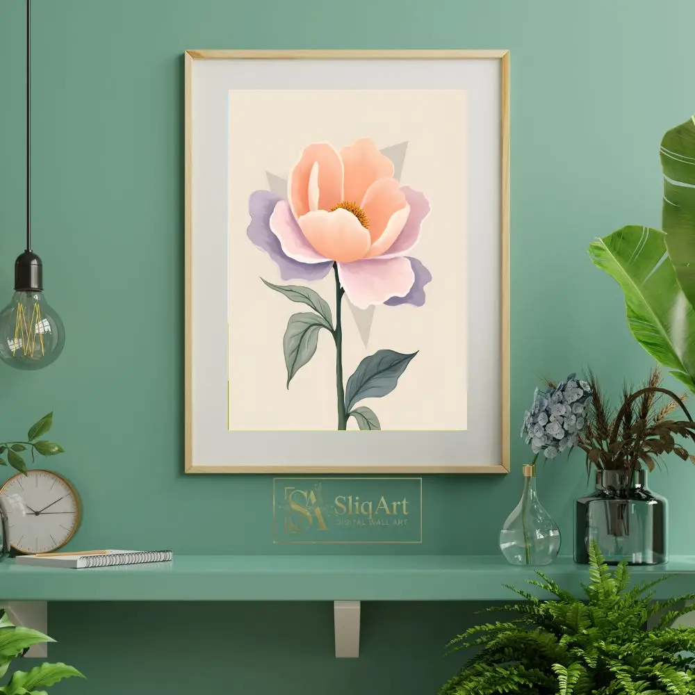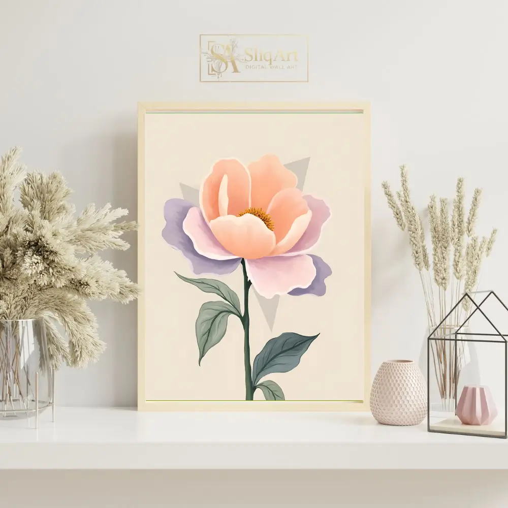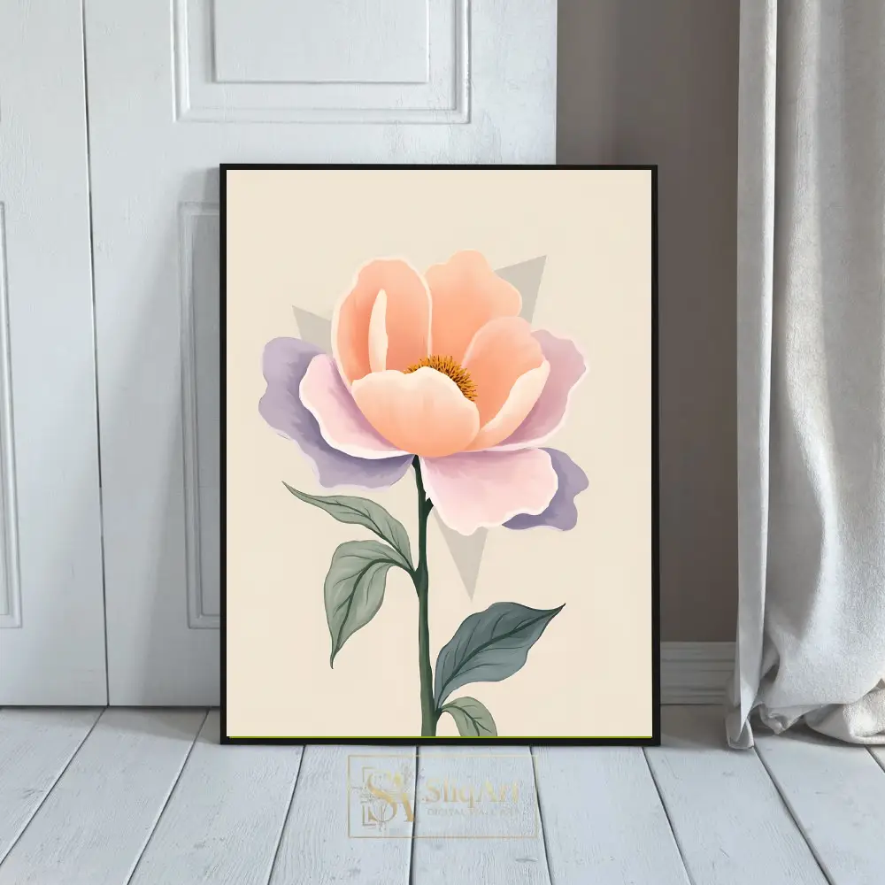 A contemporary botanical print featuring a soft-hued peach and lavender flower with minimalist geometric details on a cream background.