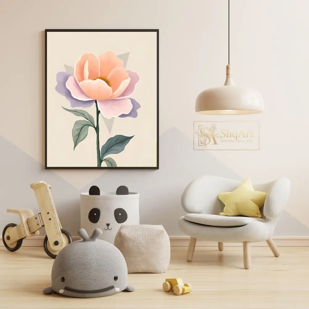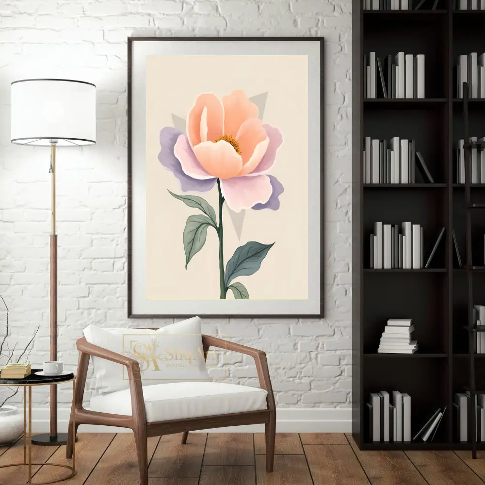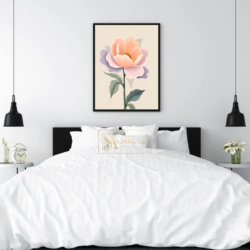 Enhance your interior with this sophisticated botanical art piece, featuring a single, stylized bloom with elegant peach and calming lavender petals.