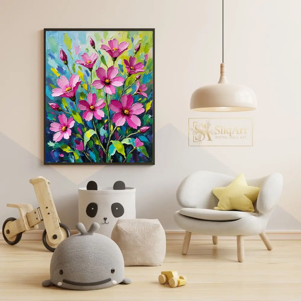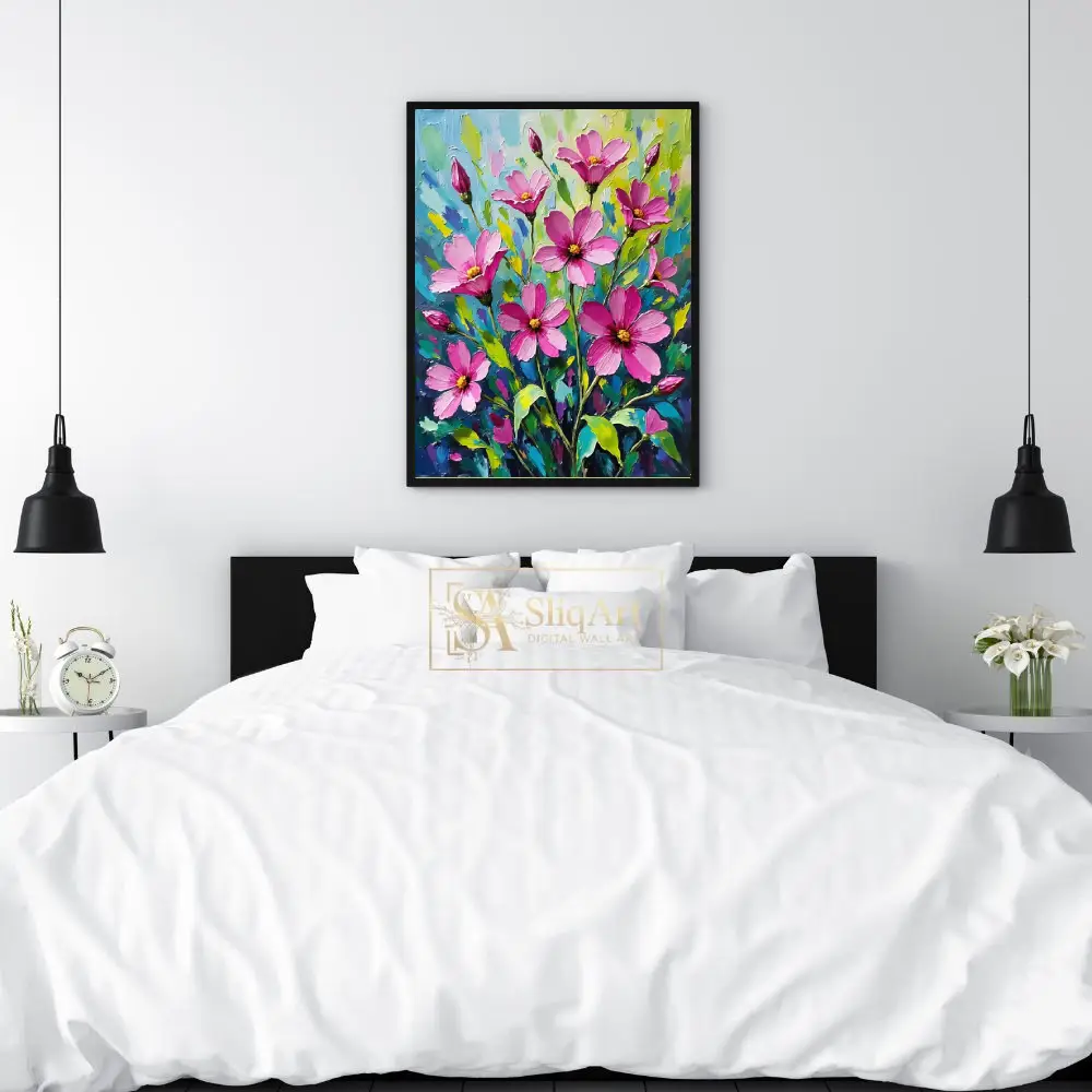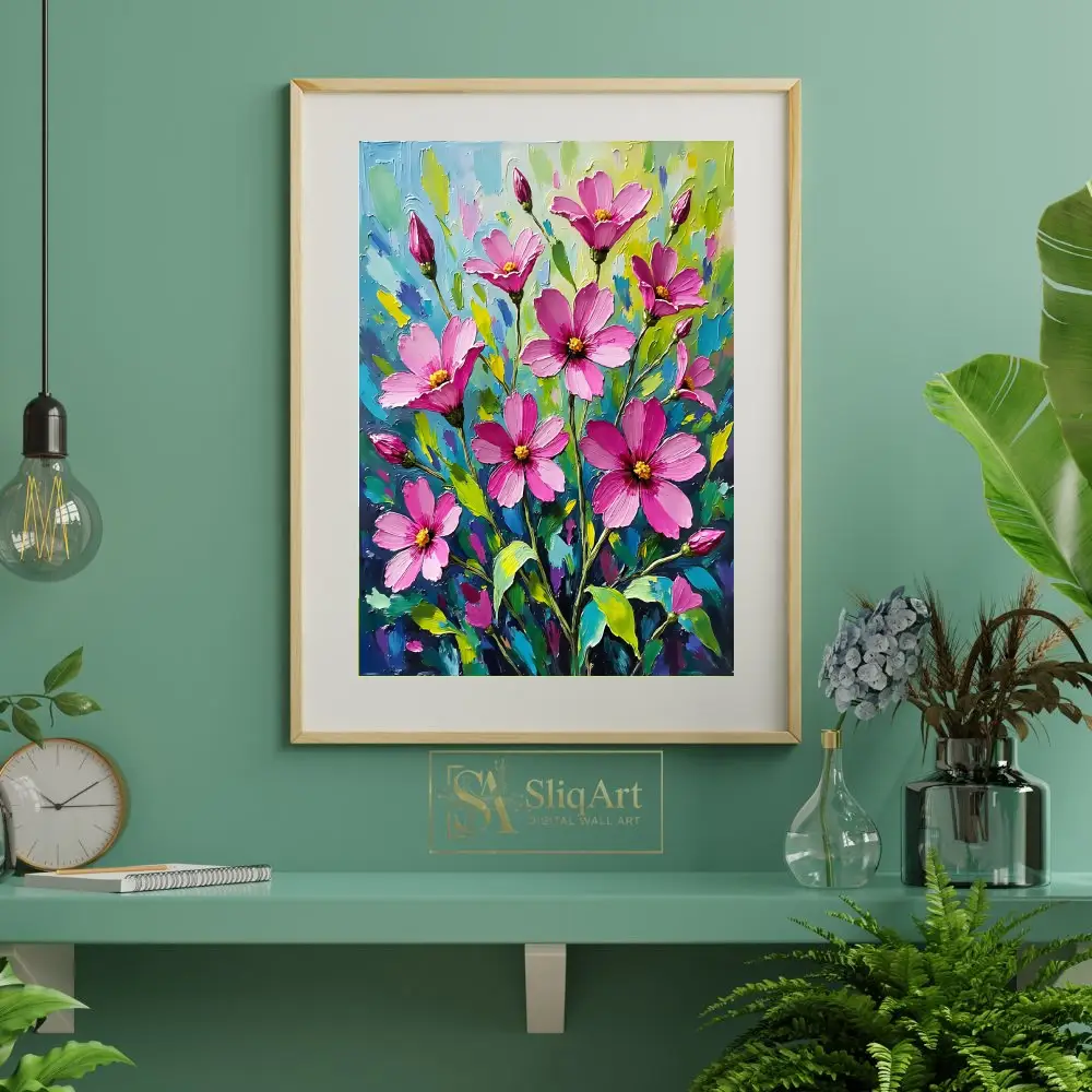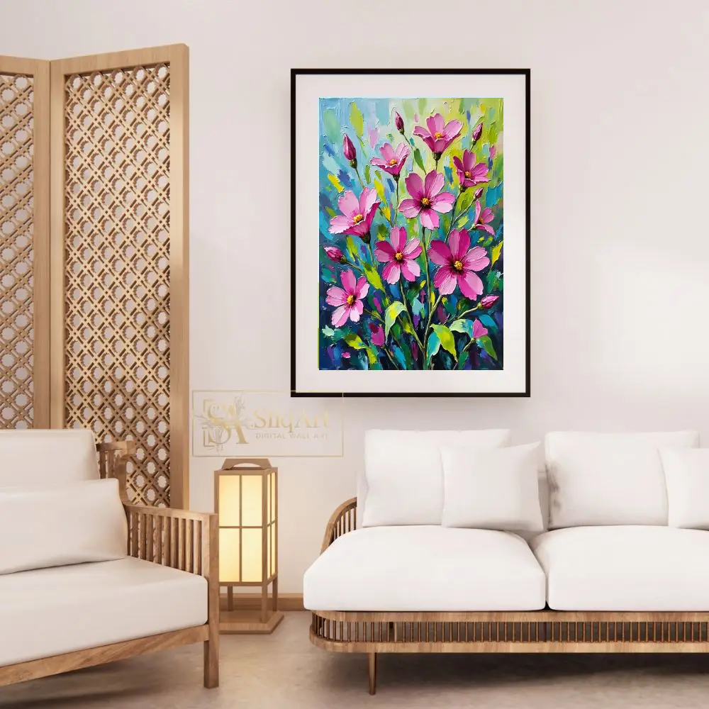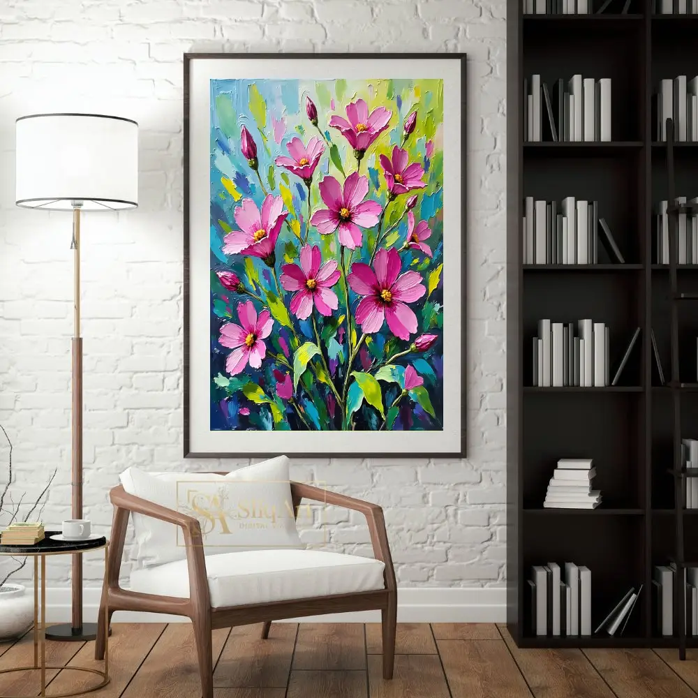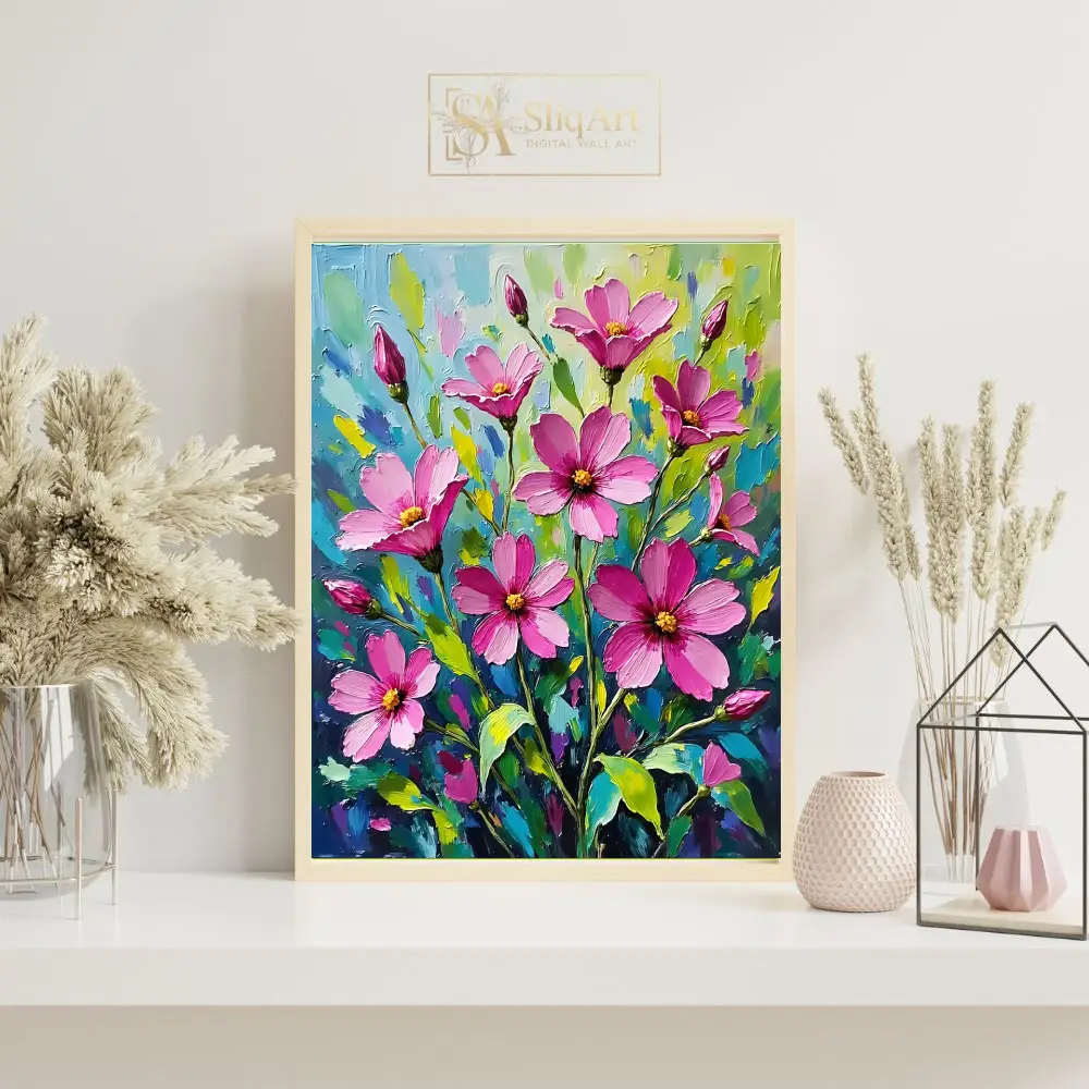 Add a burst of botanical energy to your walls with this stunning impasto oil painting of pink cosmos flowers. This piece features thick, expressive palette knife strokes that create a rich tactile quality, bringing the delicate blossoms to life with bold magenta and soft pink hues.