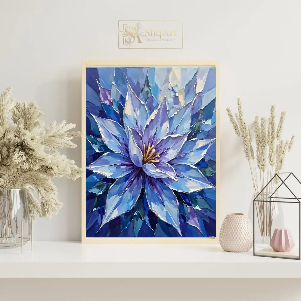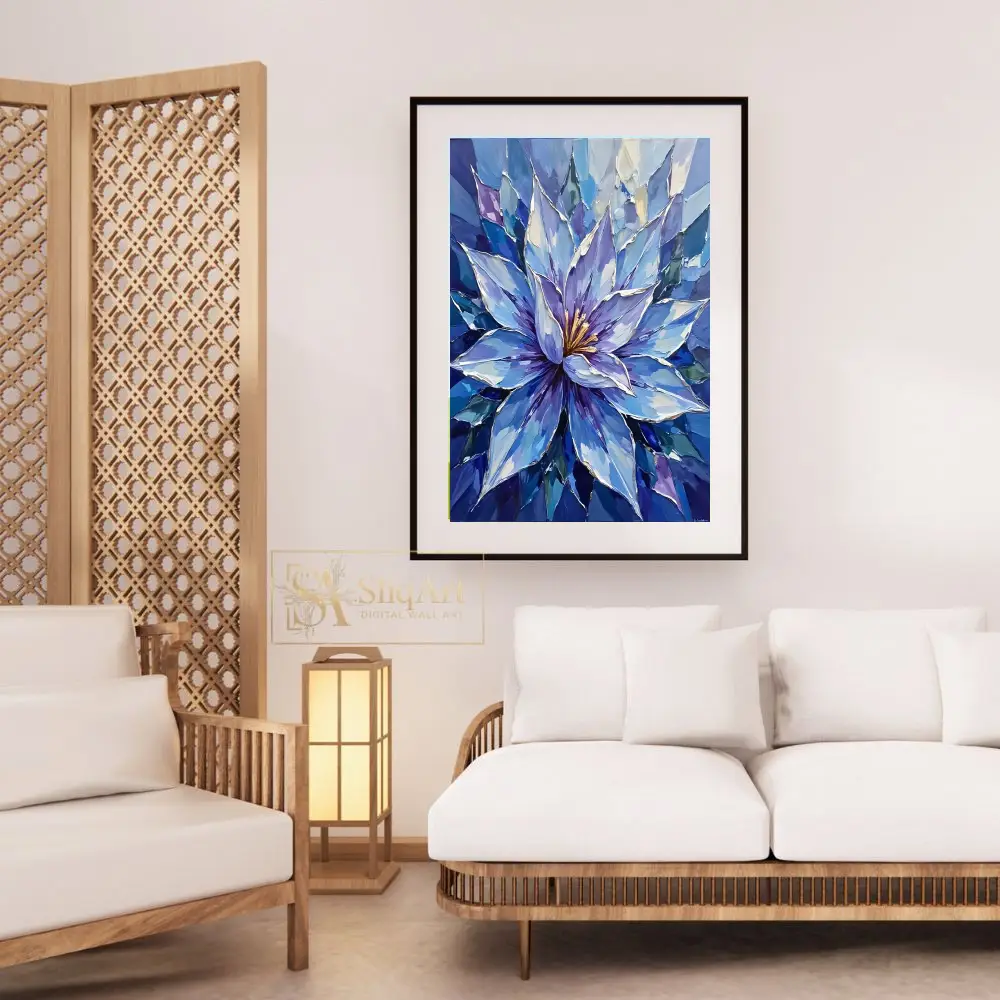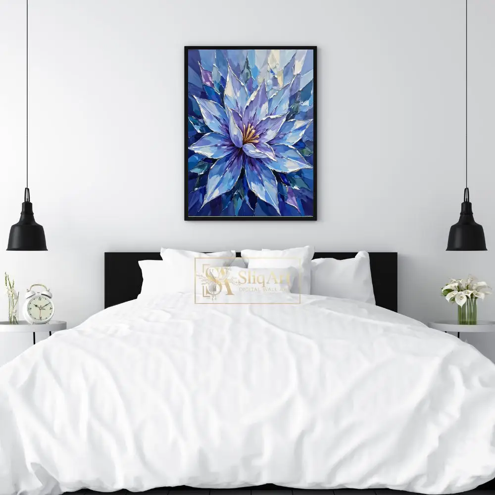 Elevate your interior with this vibrant botanical masterpiece, showcasing a majestic purple iris surrounded by cheerful yellow and orange tulips.