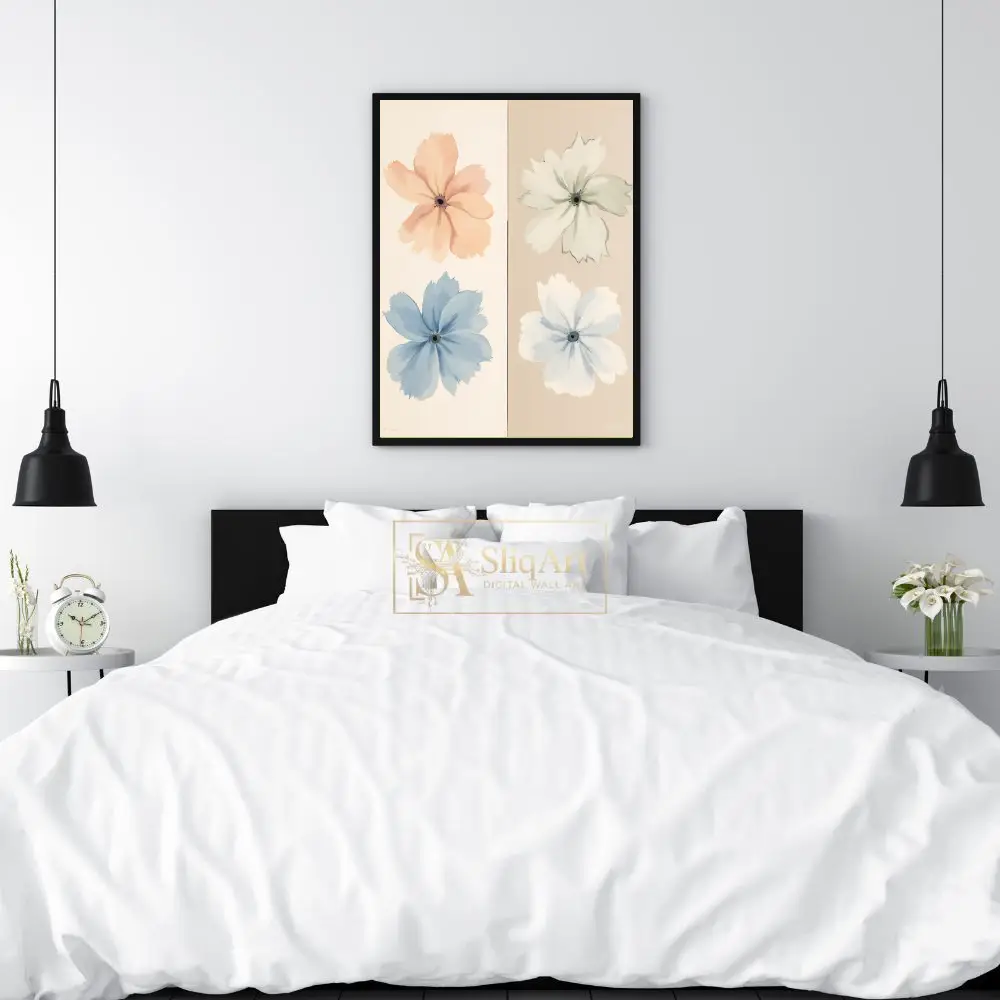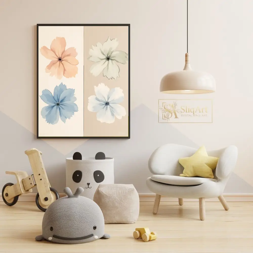 This piece features a soft, painterly style with a warm color palette of earthy browns, lush greens, and delicate floral tones of pink and purple. The whimsical sky and gentle subject matter evoke a sense of calm and wonder, making it an ideal addition to spaces that value nature-inspired storytelling and soft, illustrative aesthetics.