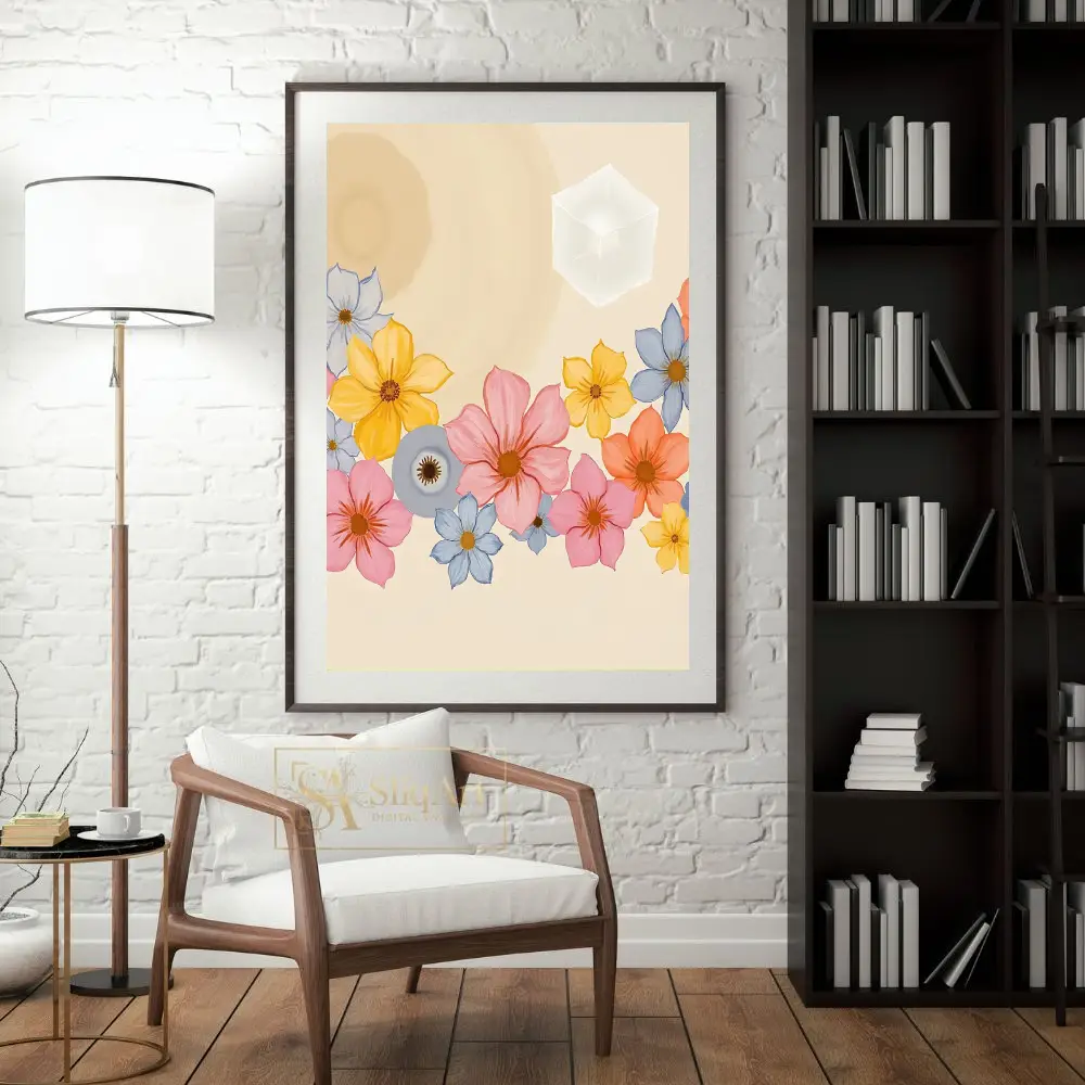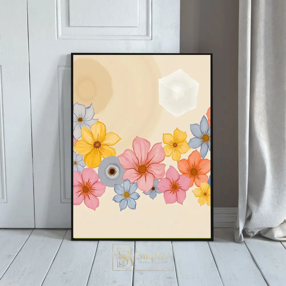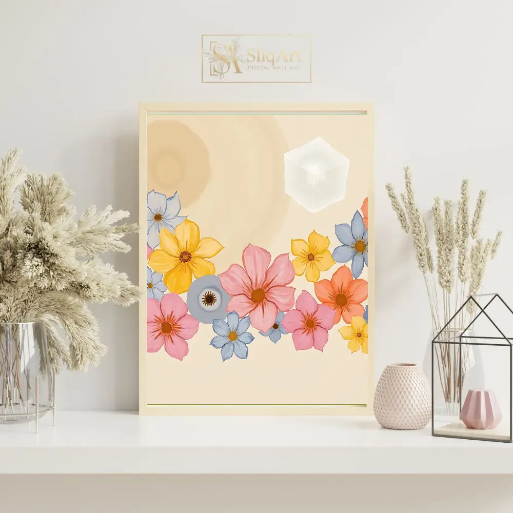 Enhance your living space with this exquisite digital artwork that seamlessly integrates the natural world with abstract geometry. The piece features a vibrant collection of multi-colored flowers—including soft pinks, sunny yellows, and tranquil blues—nestled at the base of a warm, cream-colored canvas.
