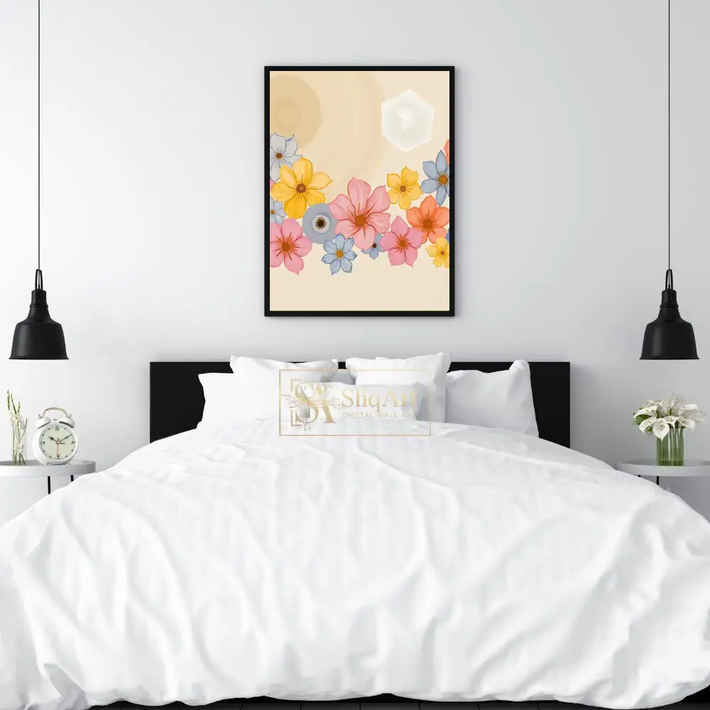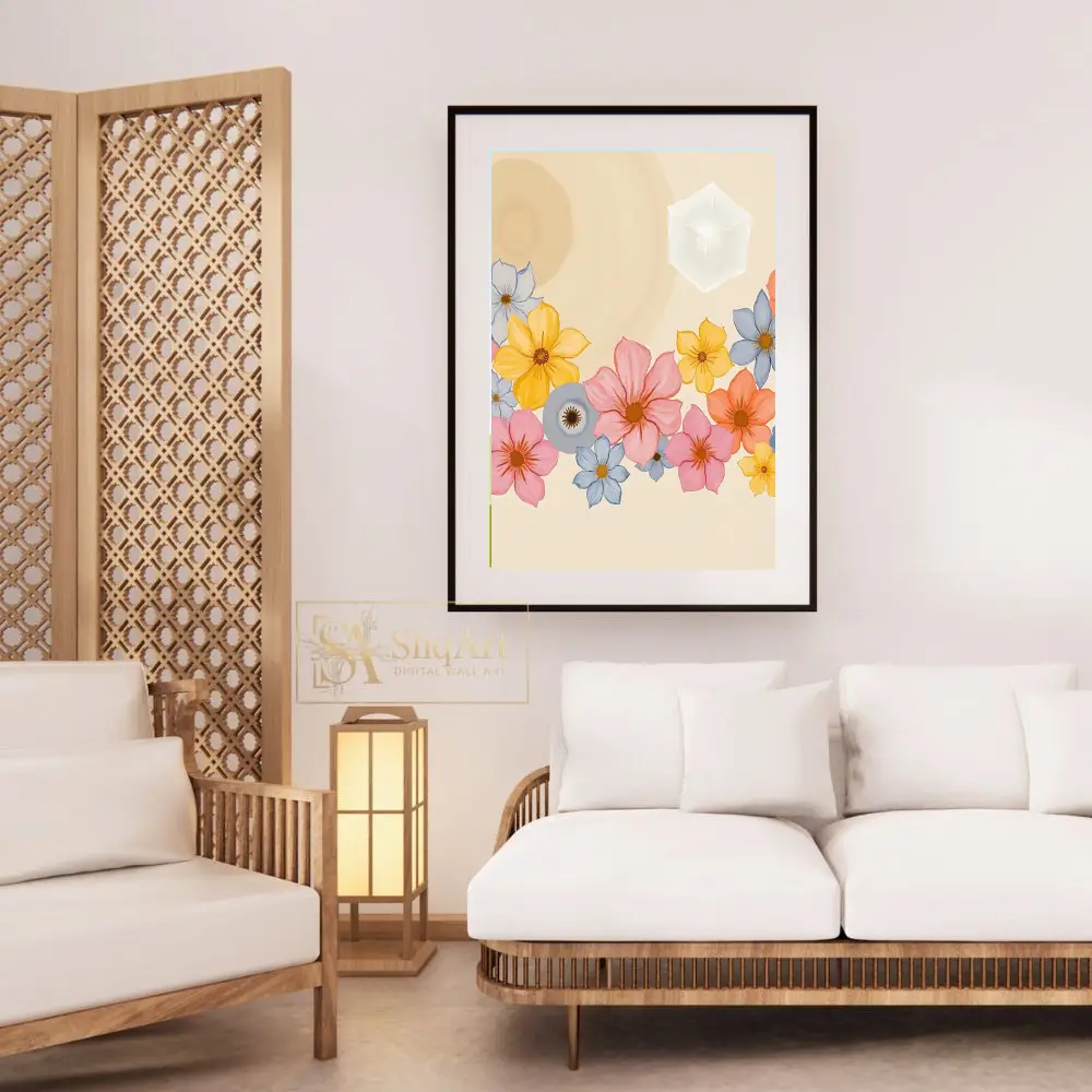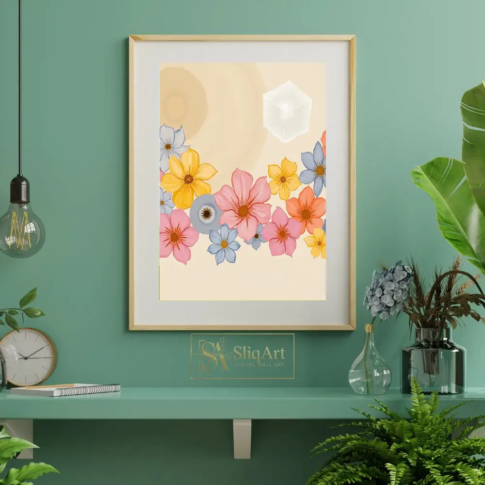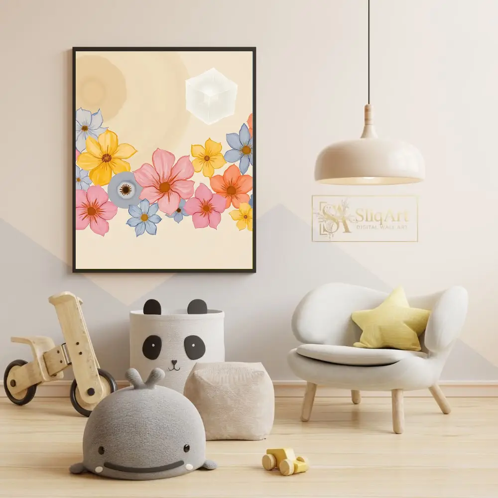 Enhance your living space with this exquisite digital artwork that seamlessly integrates the natural world with abstract geometry. The piece features a vibrant collection of multi-colored flowers—including soft pinks, sunny yellows, and tranquil blues—nestled at the base of a warm, cream-colored canvas.