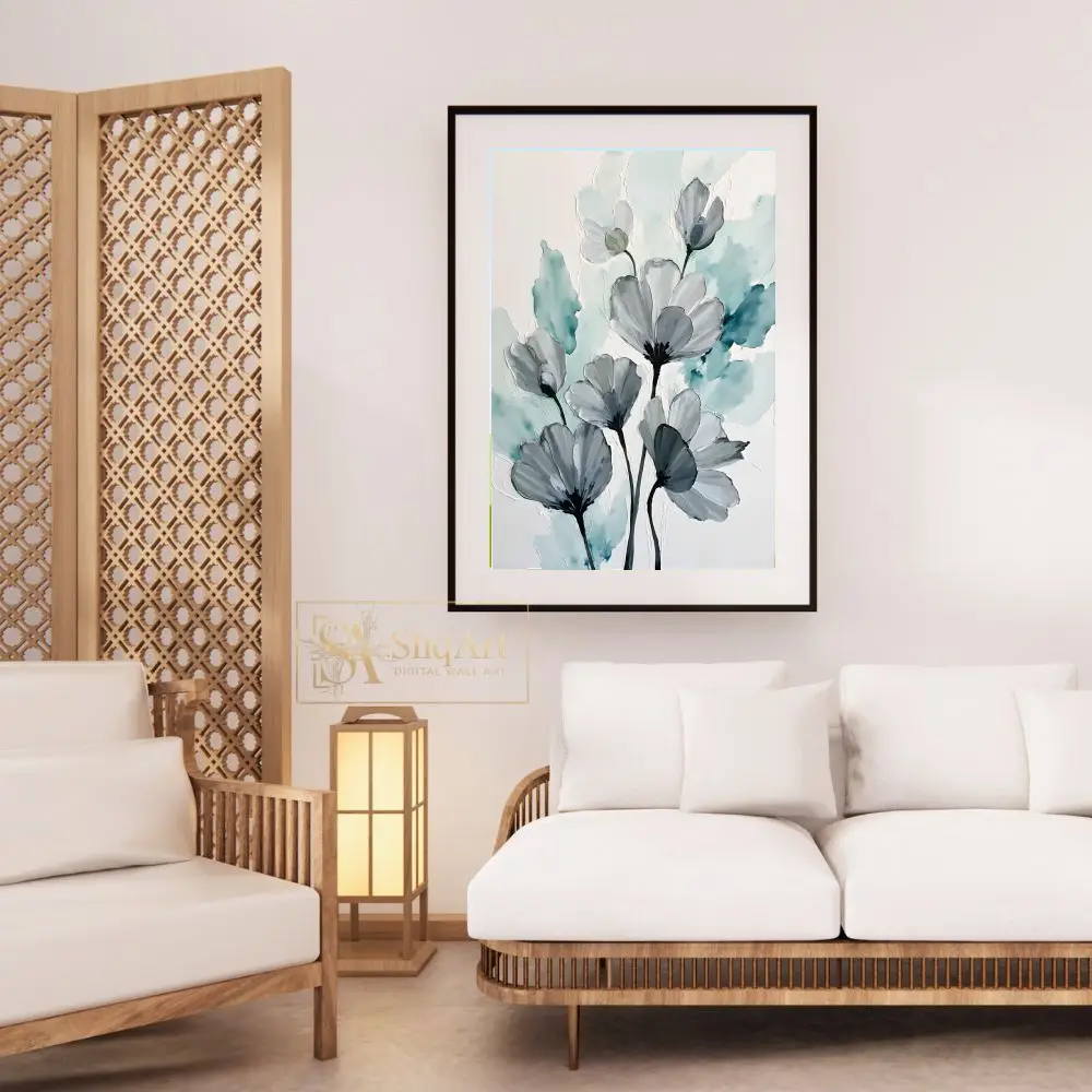 A serene abstract floral artwork featuring grey blossoms against a textured teal and white background.