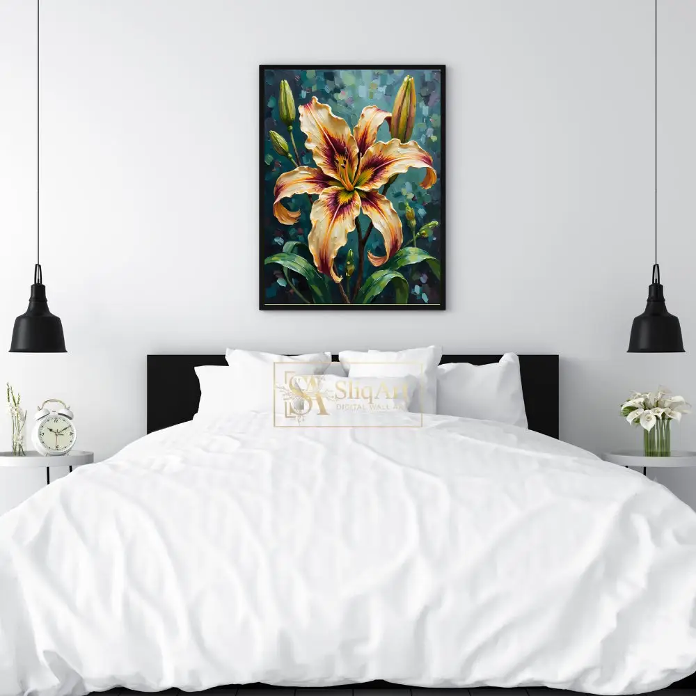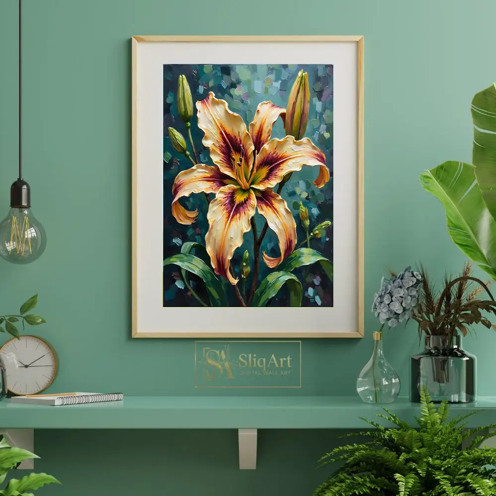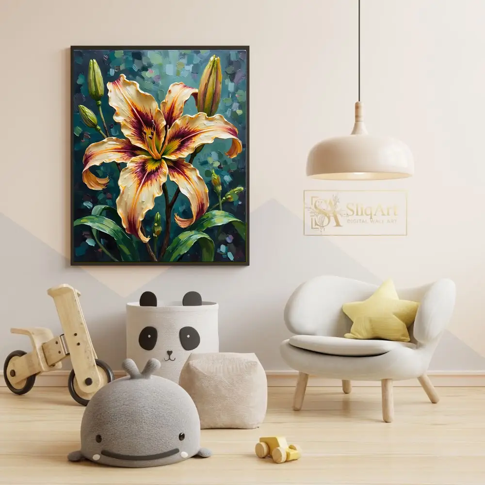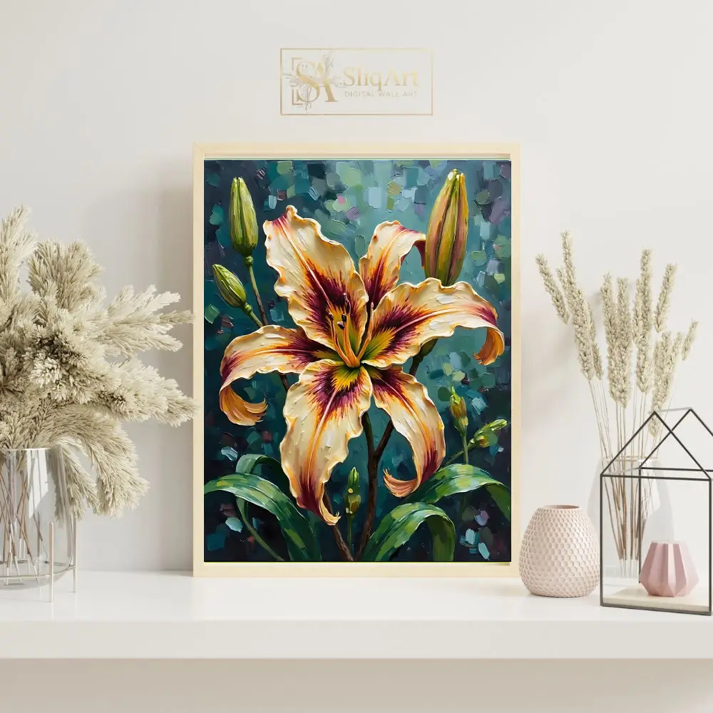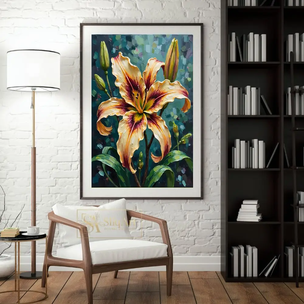 Transform your space with the bold elegance of this textured tiger lily painting. This artwork utilizes a thick impasto technique, where heavy brushstrokes create a tangible sense of depth and life.
