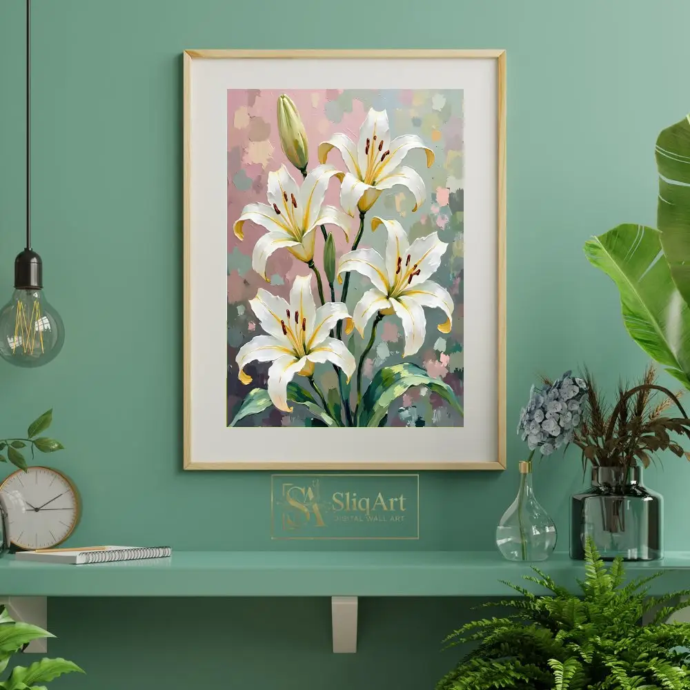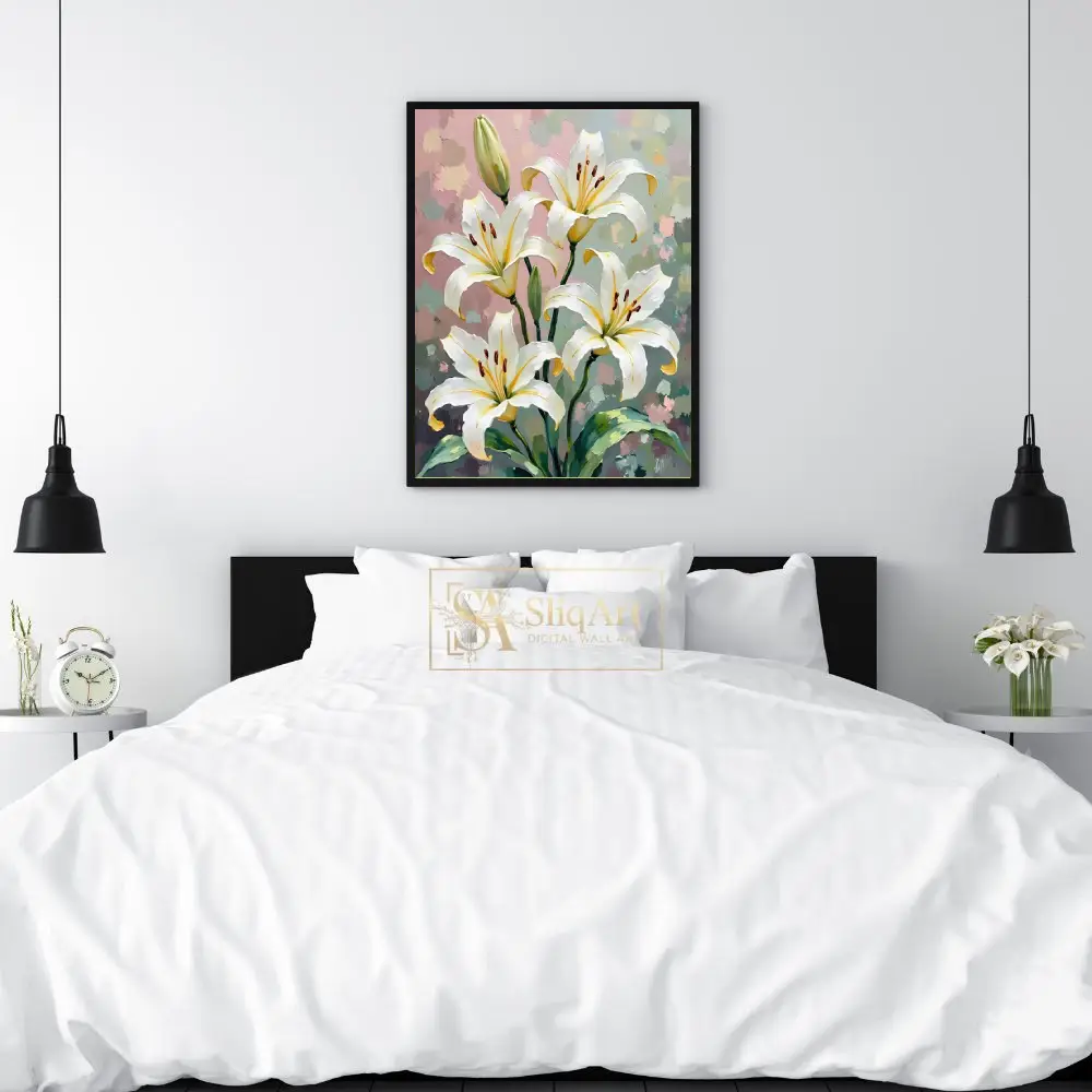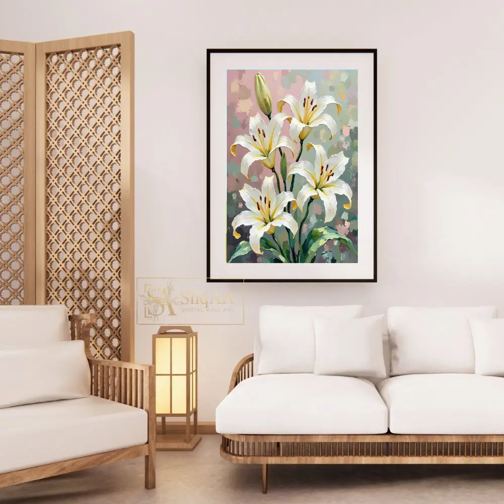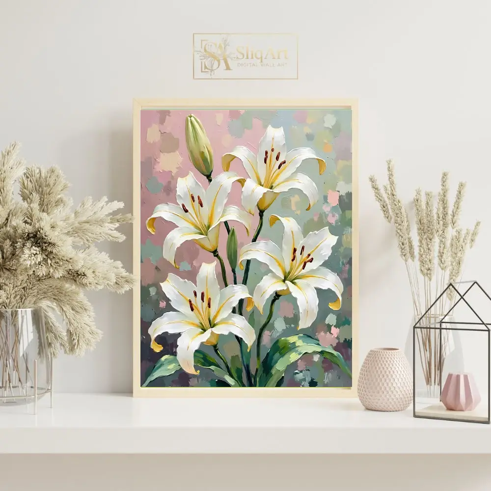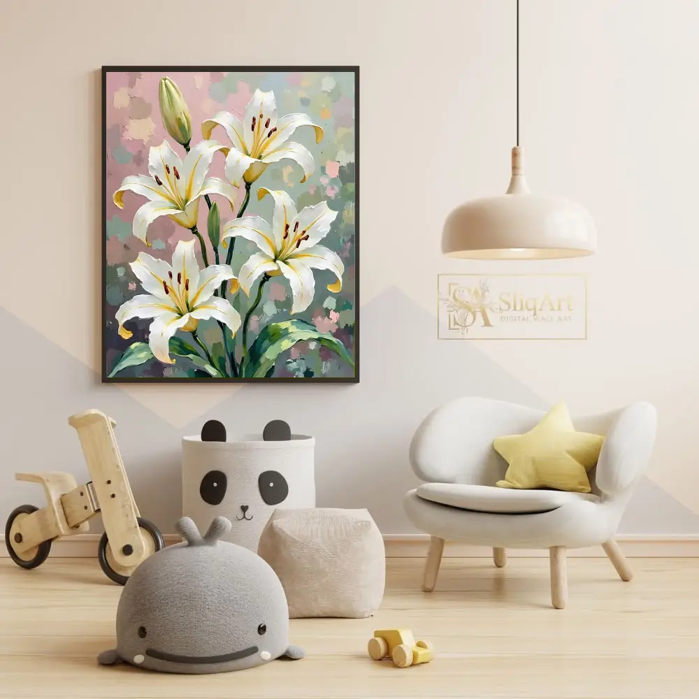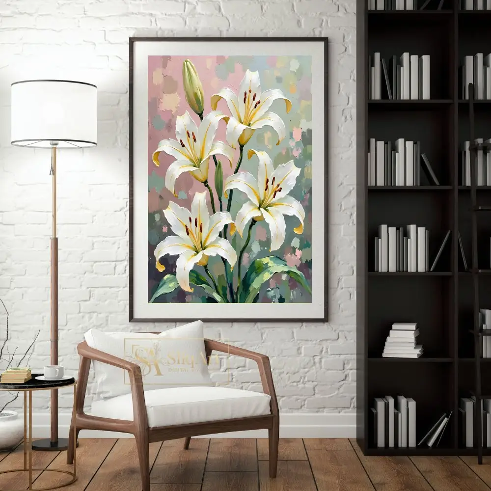 Enhance your home with the serene beauty of ‘Ethereal White Lilies,’ a stunning impressionist oil-style painting. This piece features four magnificent white lilies in full bloom, complemented by delicate buds and lush green leaves.