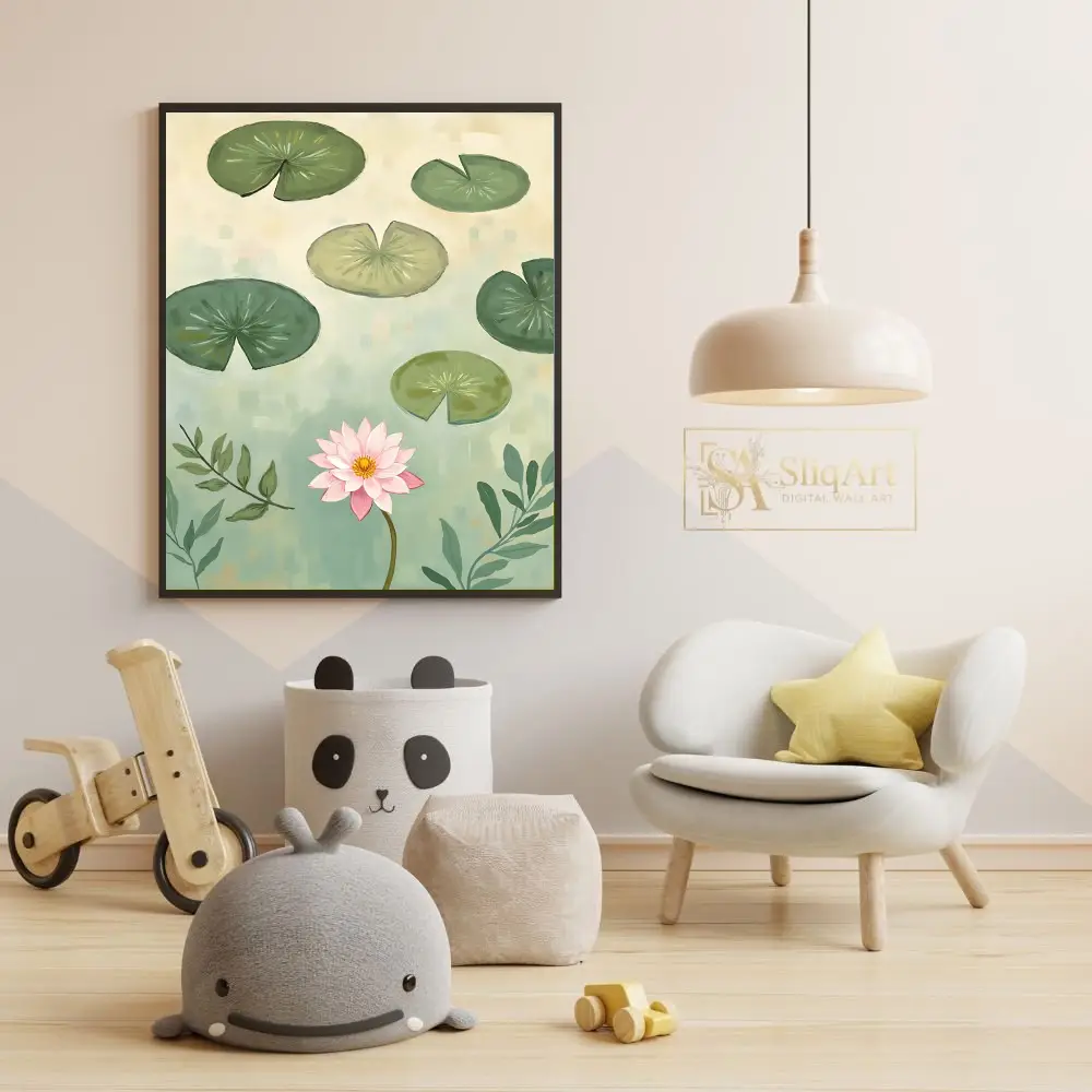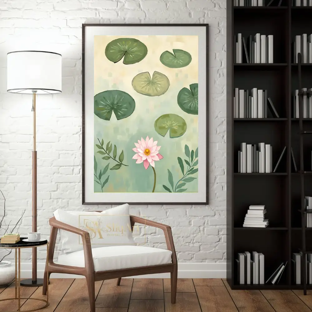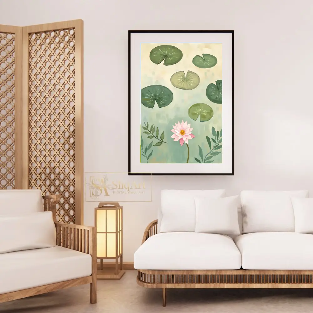 Elevate your interior with this serene digital painting featuring a blooming pink lotus surrounded by floating lily pads.