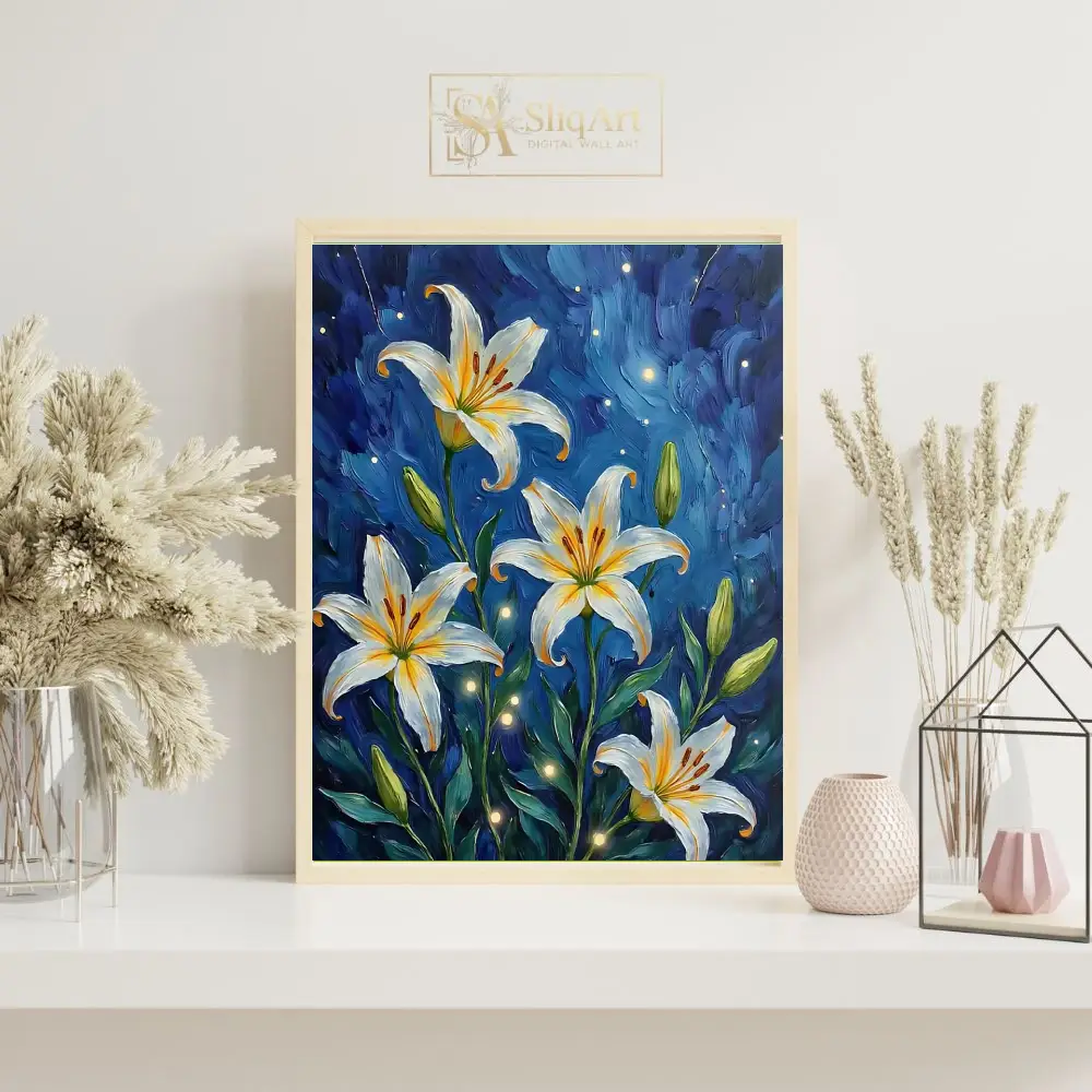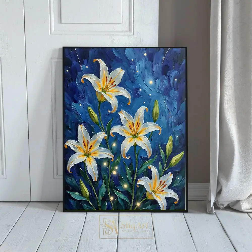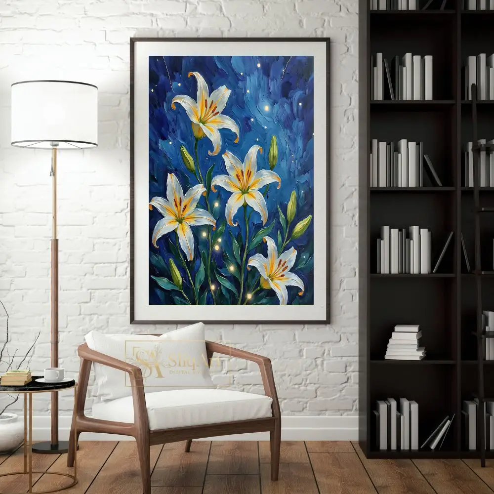 Immerse yourself in the serene beauty of ‘Luminous Night Lilies,’ a breathtaking impressionist painting that brings the magic of a moonlit garden indoors. This artwork features elegant white lilies with vibrant yellow accents, set against a deep, textured navy blue background reminiscent of a starry night.