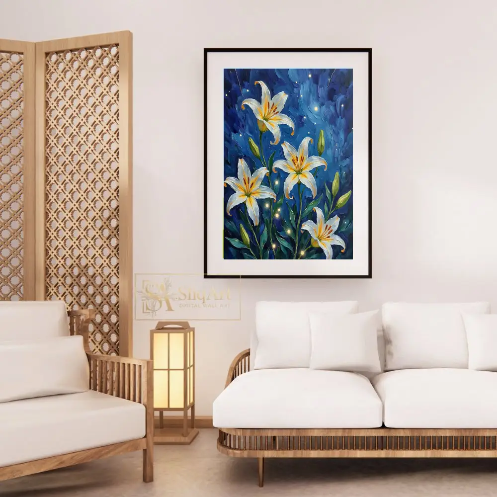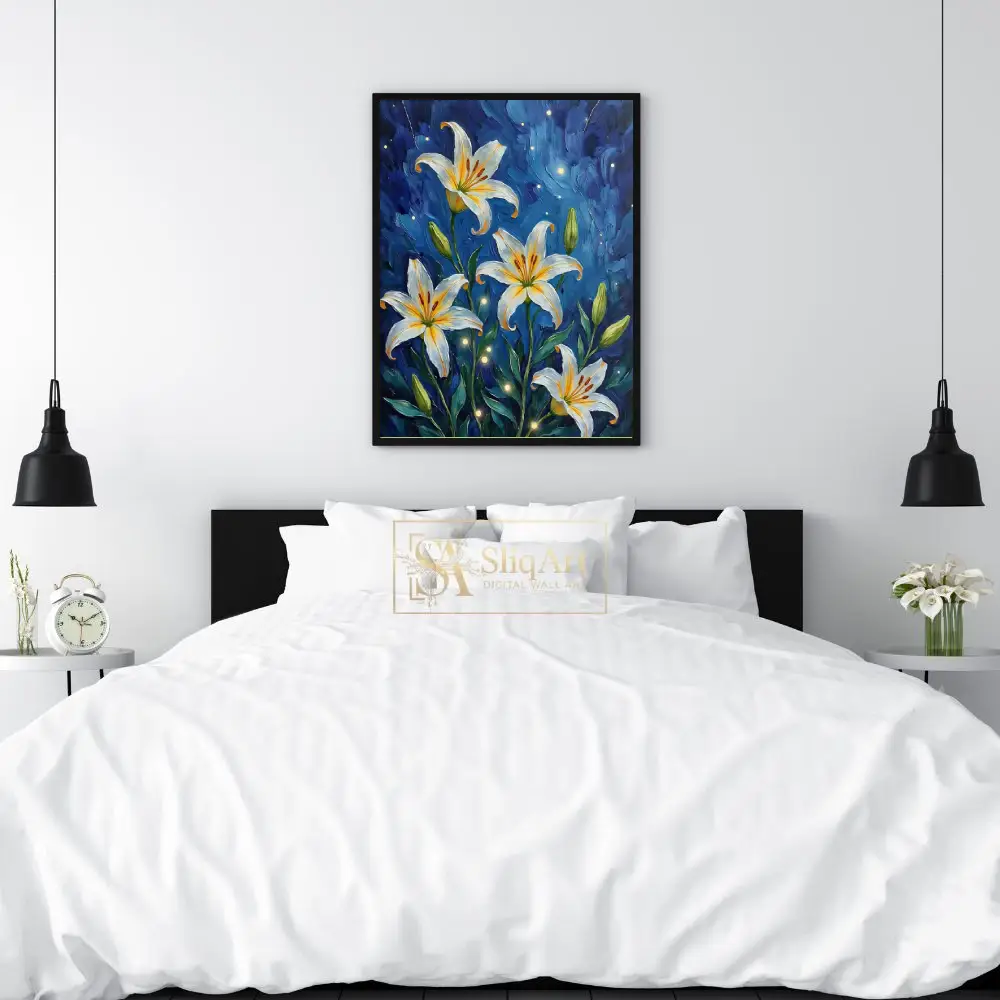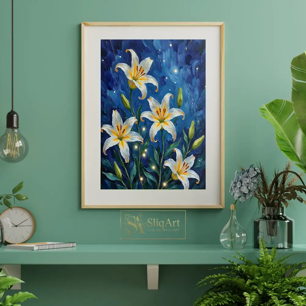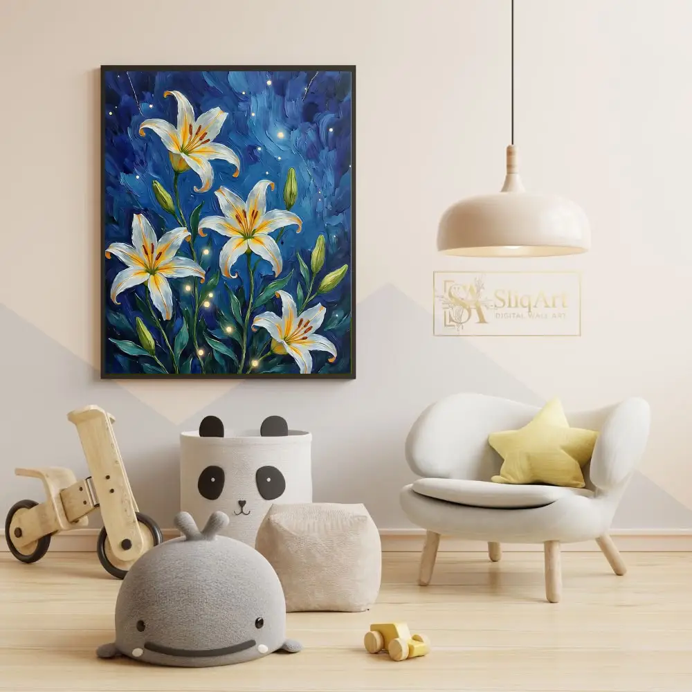 Immerse yourself in the serene beauty of ‘Luminous Night Lilies,’ a breathtaking impressionist painting that brings the magic of a moonlit garden indoors. This artwork features elegant white lilies with vibrant yellow accents, set against a deep, textured navy blue background reminiscent of a starry night.