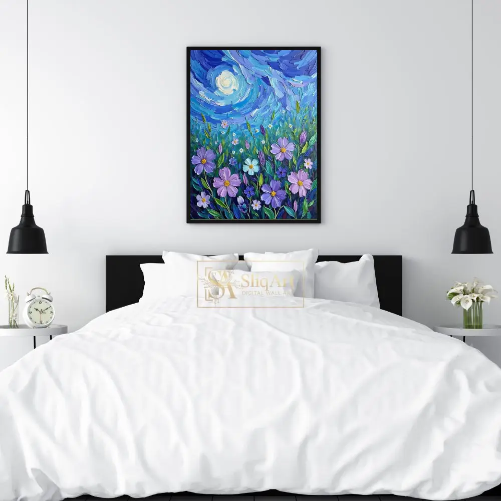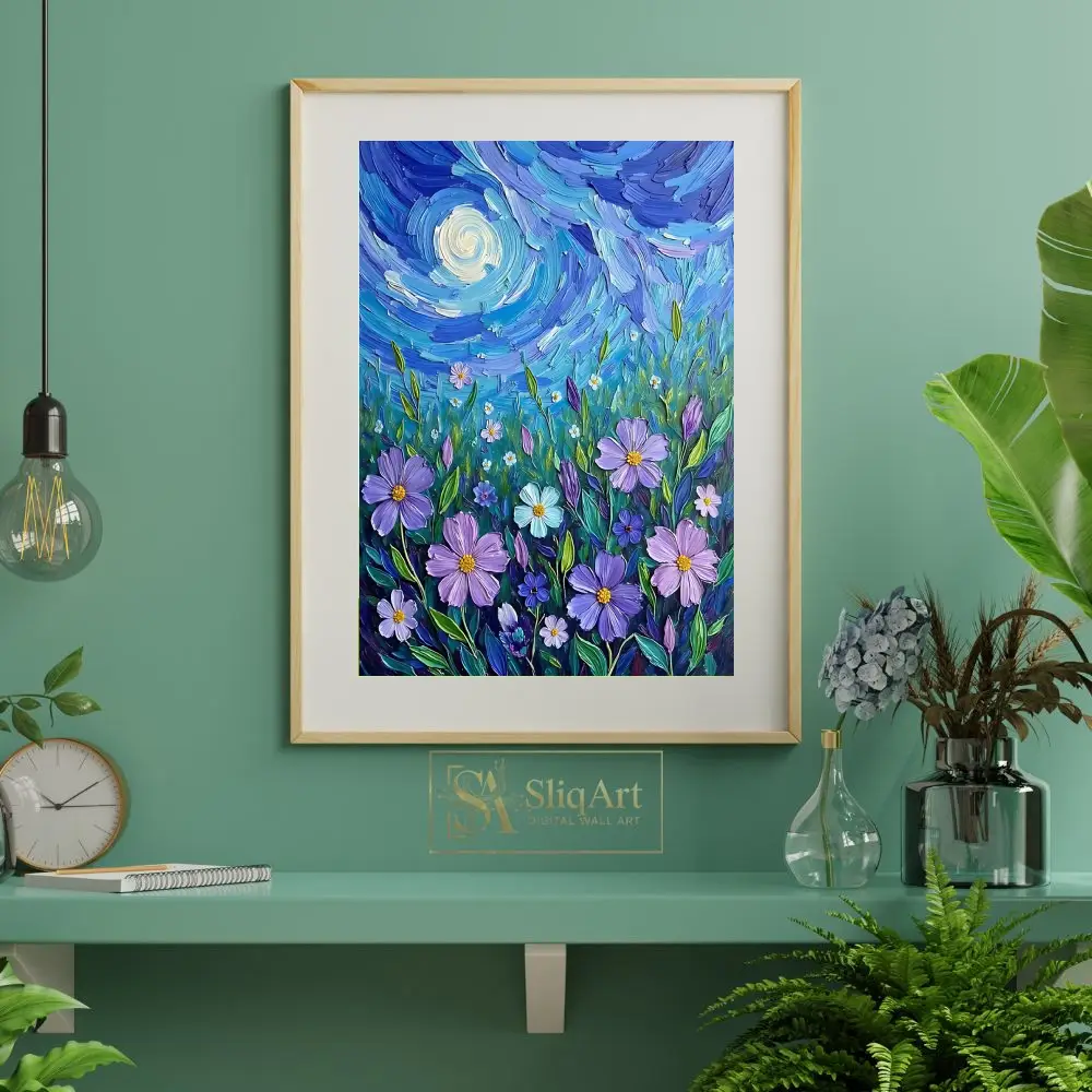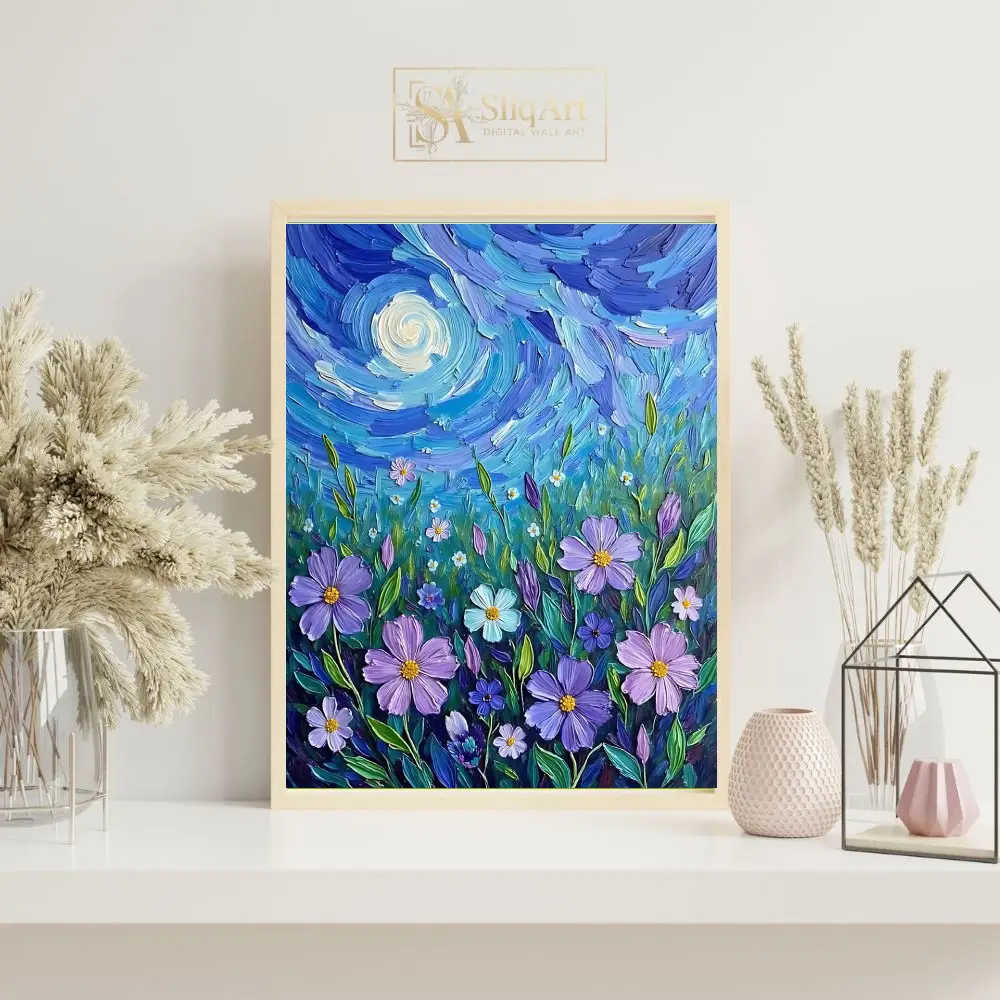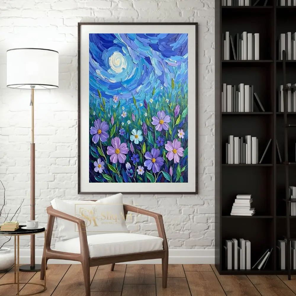 Each thick, expressive brushstroke creates a tangible sense of texture and movement, drawing inspiration from classic post-impressionist techniques. The deep indigos and cerulean blues of the sky provide a stunning contrast to the soft lavender petals and luminous moon, making this a captivating centerpiece for any room looking to blend nature’s beauty with artistic energy.